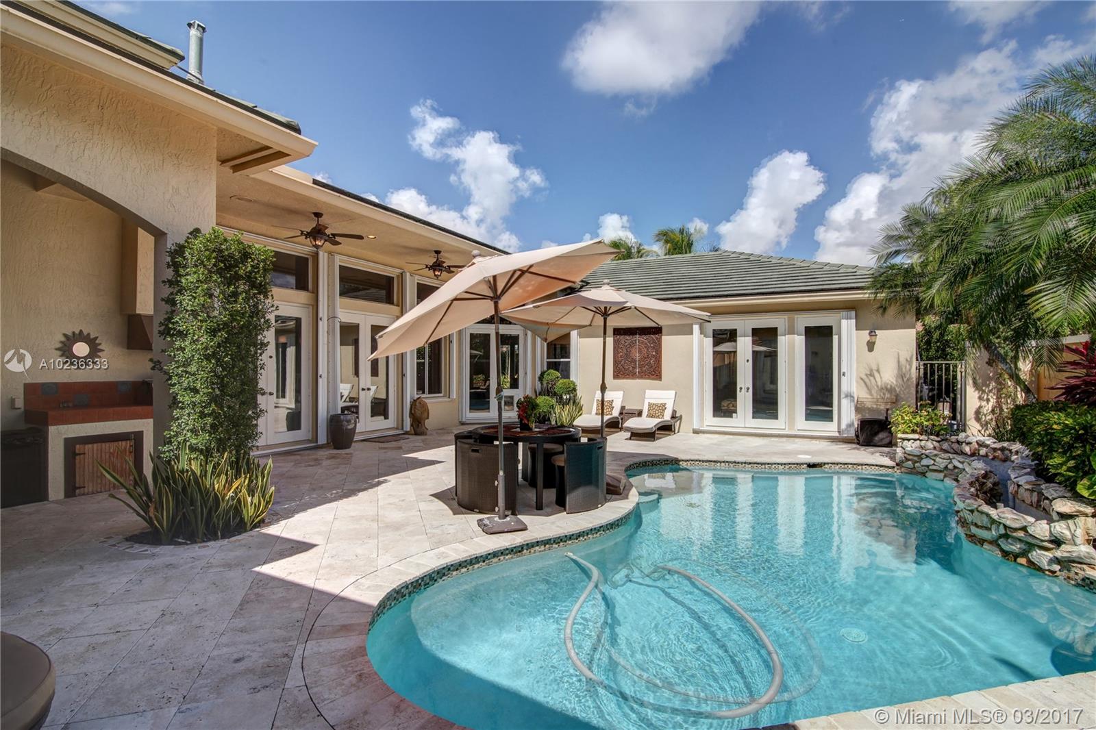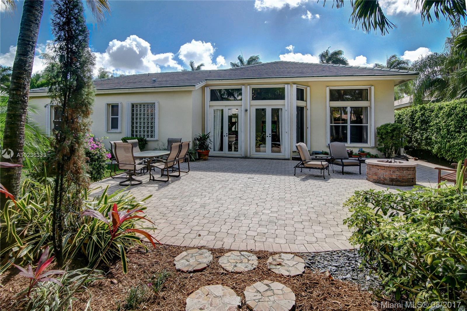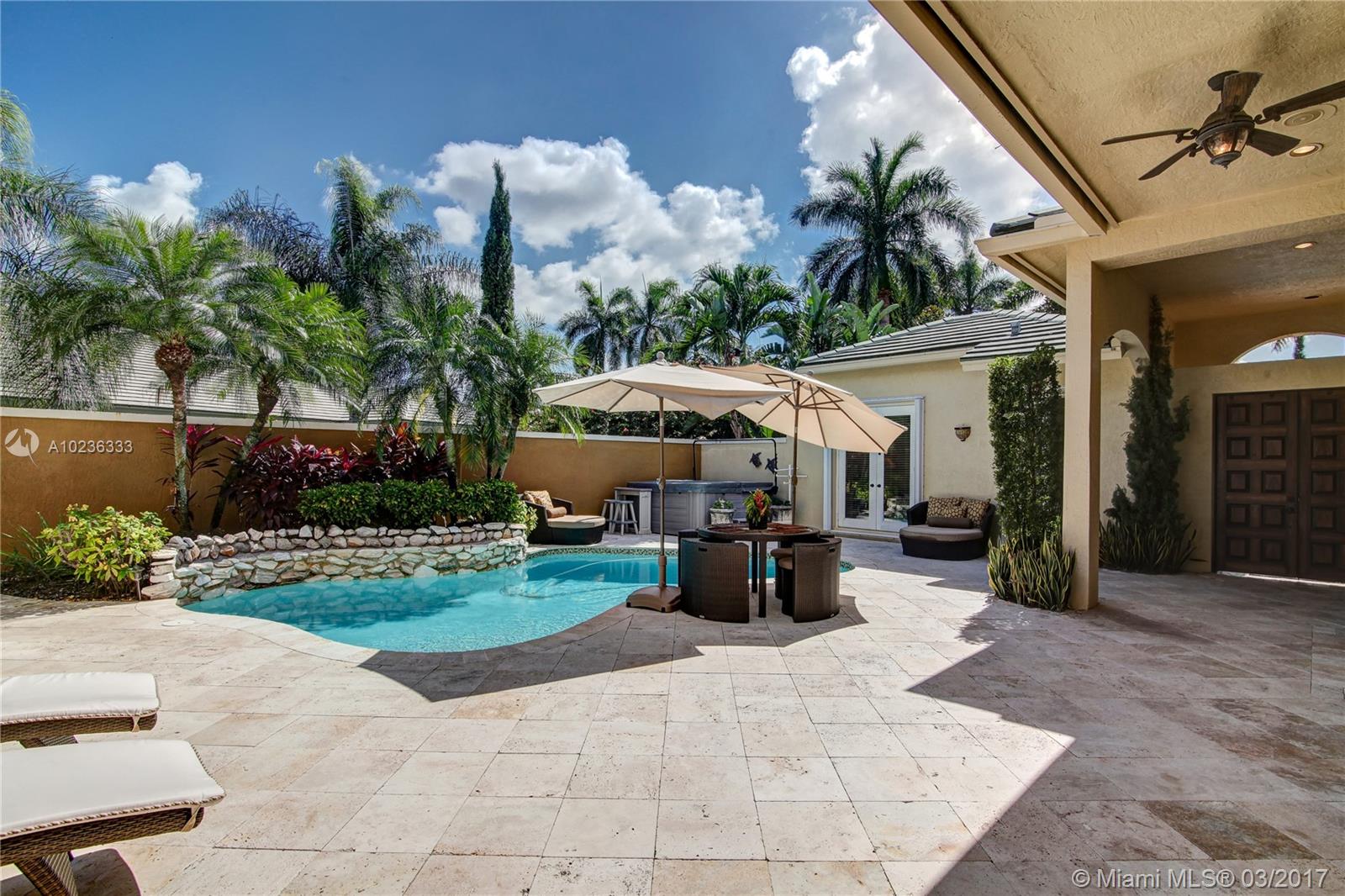 Step into this beautifully appointed Two Story COURTYARD home featuring separate Guest House surrounded by serene Saltwater Pool and Travertine Patio area with Summer Kitchen. Master Bedroom and 2 additional Bedrooms on the ground level PLUS 3 Bedrooms on second level. Updated Kitchen, High Gloss Marble Flooring in living areas and Limestone Feature Wall with Ethanol Fireplace. Expansive Back Yard complete with Fire Pit makes this a perfect home for Entertaining and Enjoying South Florida living.