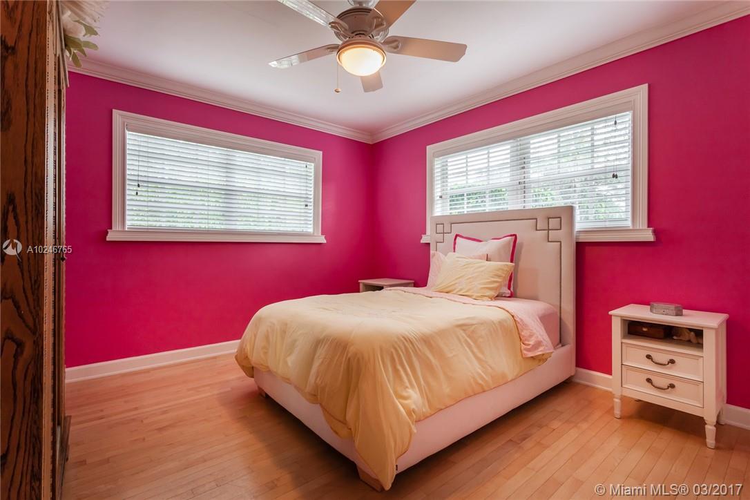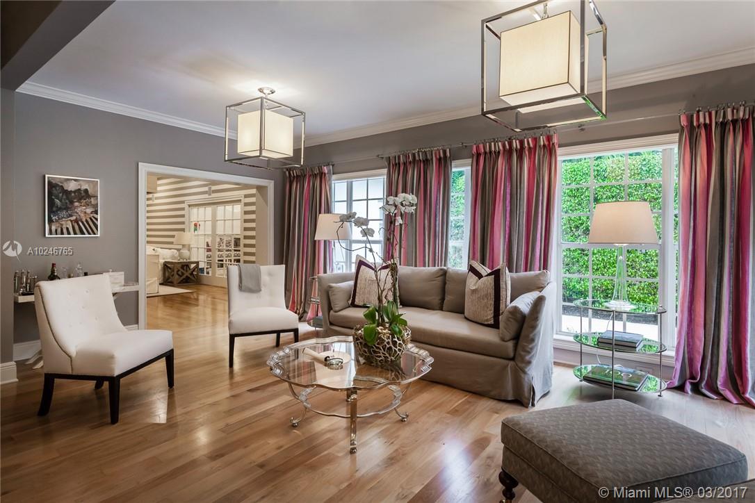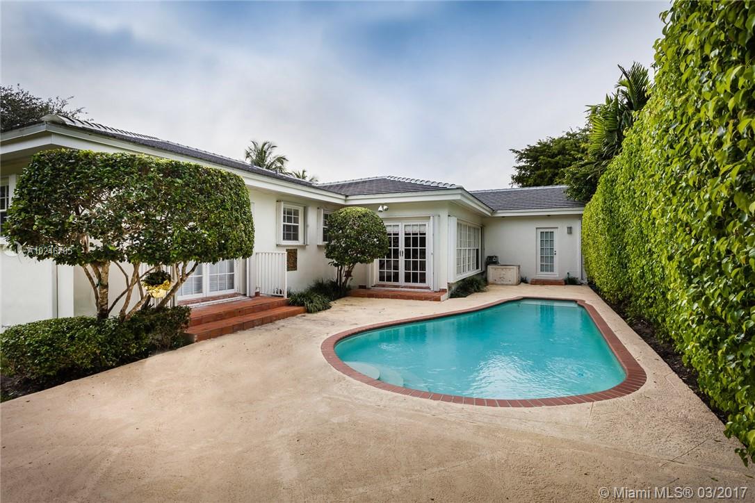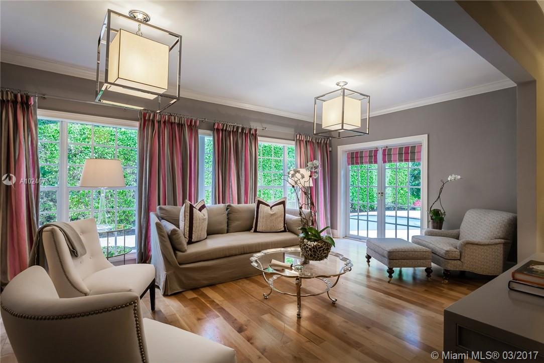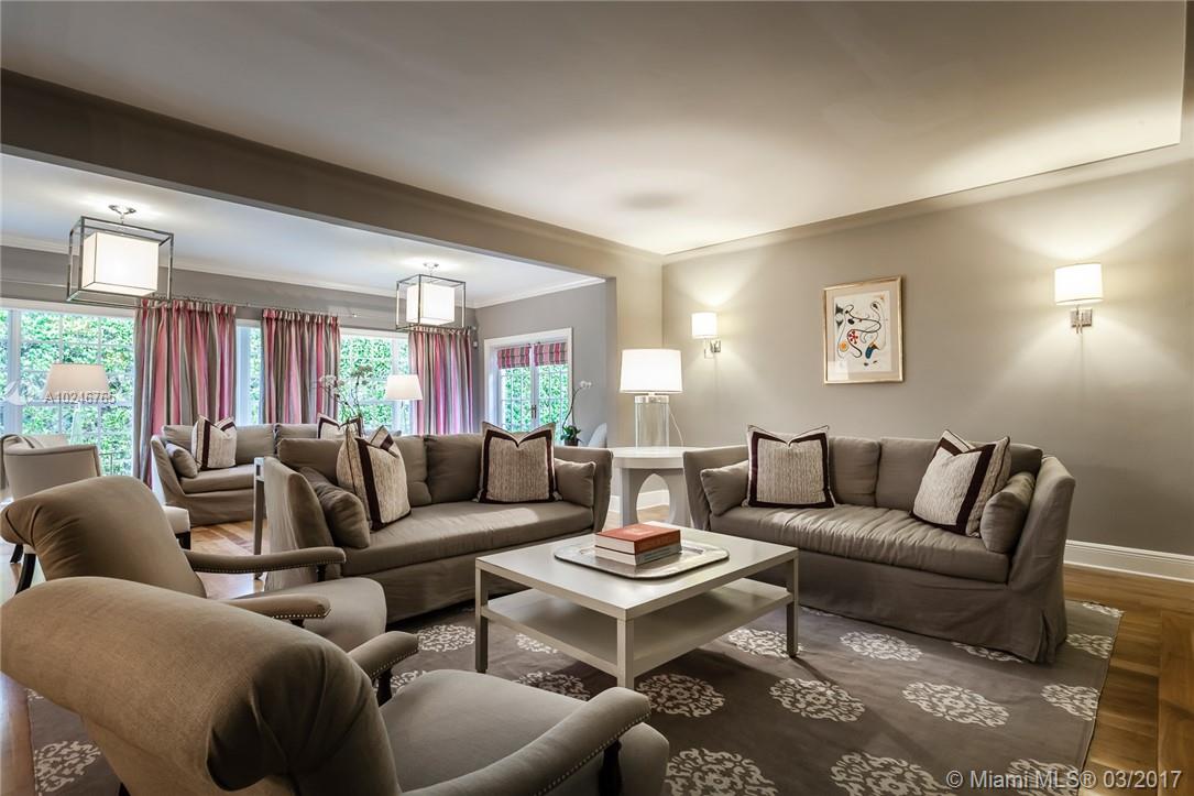 This light filled and spacious home is located in Coral Gables and features 4 bedrooms, 3 bathrooms, large living room, family room, eat-in kitchen, formal living room, two car garage, and a patio with a pool. Allowing for views of the pool are the master bedroom which has large glass windows as well as the window lined living room. The layout is fit for entertaining and lends itself to the overall open feel.