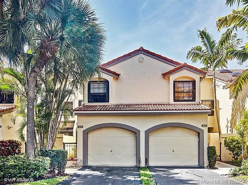 Investors property is rented. Tree-lined wide streets in guard-gated community with great walk-ability, this two-story townhome with garage has a large enclosed patio in the back and spacious open floor plan inside. Kitchen has extra built-in wood cabinetry, granite countertops, breakfast nook overlooking the front patio, floors are 20 inch tile throughout. Master suite has a sitting/office area, private terrace, large master bath with whirlpool, spa finishes, large walk in closet, soaring ceilings. Hurricane shutters. Walk along the Waterways marina or to nearby shops, dining, parks [inc. dog park].