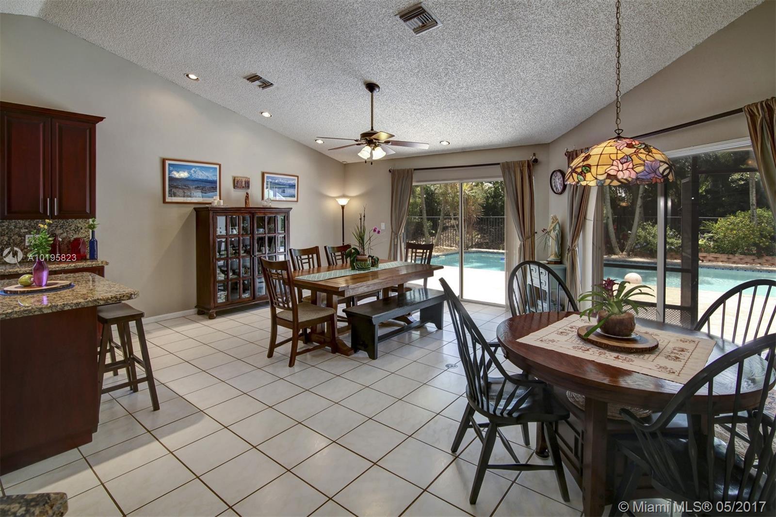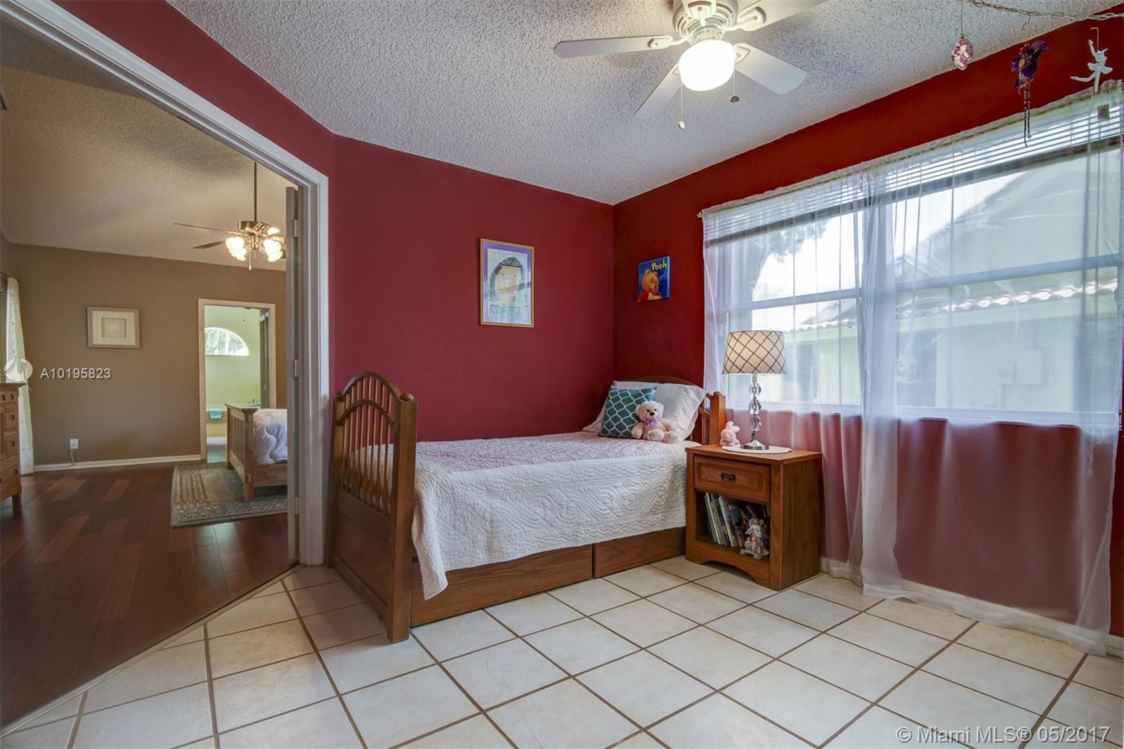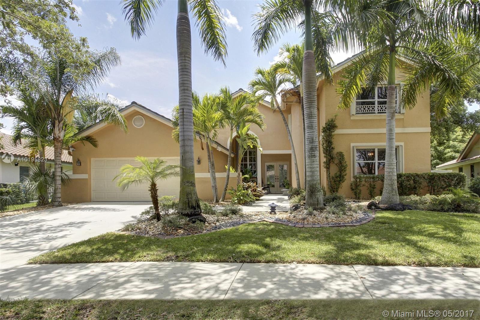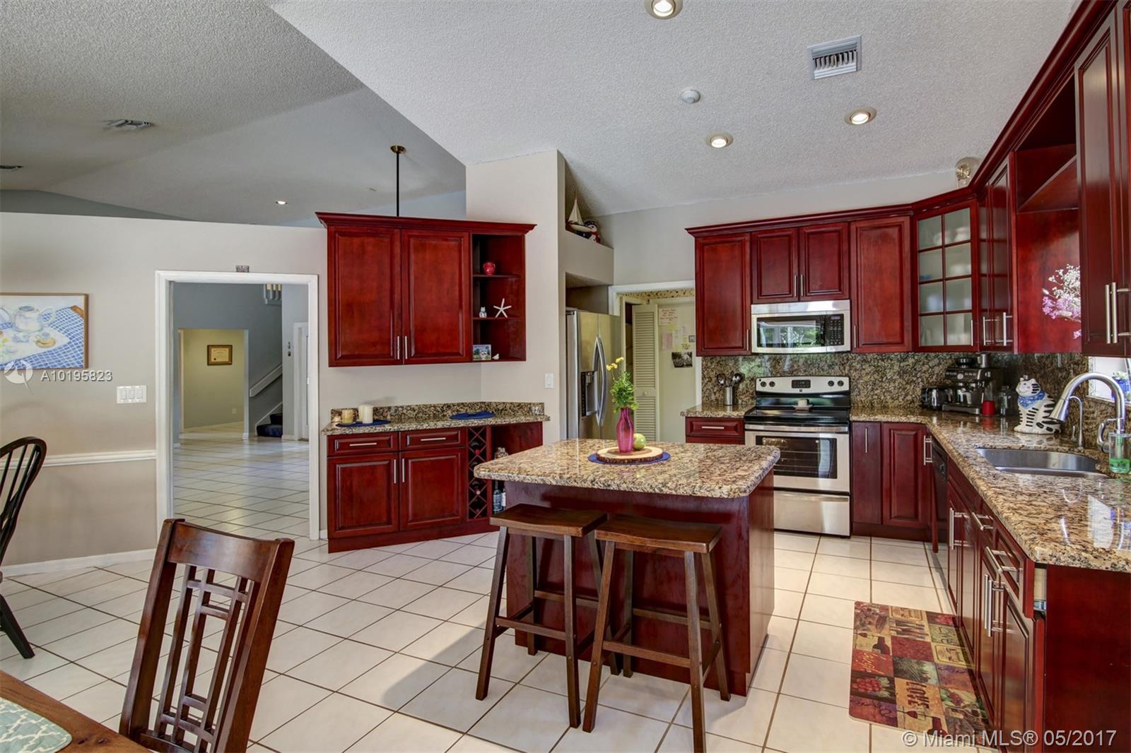 4 Bedroom, 3 Full Bathroom, Office (optional 5th Bedroom) well-kept home on quiet street near culdesac, A+ schools (Country Isle Elementary, Tequesta Trace Middle, Cypress Bay High, parks in walking distance, Weston Town Center in walking distance, sidewalks on both sides of the street, partial lake view, 40 x14 pool, roof 7 yrs, new sprinkler, accordion shutters, aluminum fence, two car garage, 4 car driveway, over 20 mature palm trees on property, all appliances included, high ceilings, new refrigerator and stove, granite counter tops, 44 inch cabinets (cherry wood), recessed lights, separate pantry, separate washer and dryer room, master BDR on ground floor with hardwood floors, 2 walk in MBR closets, large master suite with 2 cabinet sinks, shower, separate garden tub plus cabana door