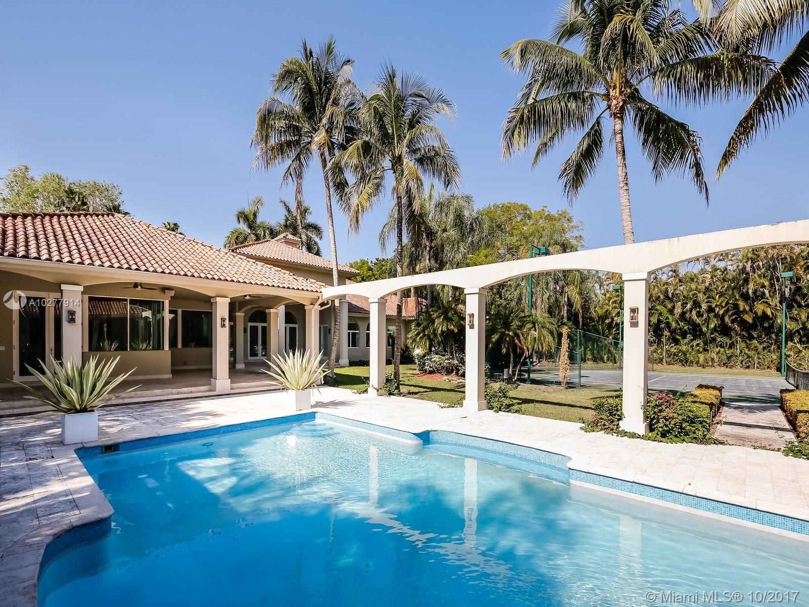 PRICED TO SELL!!! STUNNING GATED TROPICAL ESTATE ON A 1.16 ACRE LOT IN NORTH PINECREST. Walk into this bright and spacious 6BR/7.5B home perfect for entertainment. An ample foyer leads you to the large formal living room overlooking covered terrace, pool and tennis area. Split floor plan. The enormous master suite includes a massive walk-in closet, gym area,office, beauty salon, split bath with dual sinks, toilets, bidets, and double shower heads and a separate Jacuzzi. Ample gourmet kitchen with a breakfast area overlooking the pool. Enjoy a movie in your own home theater with it's own bar. Play basketball or tennis in your own court and then relax by the pool and cook in the cabana with your summer kitchen.