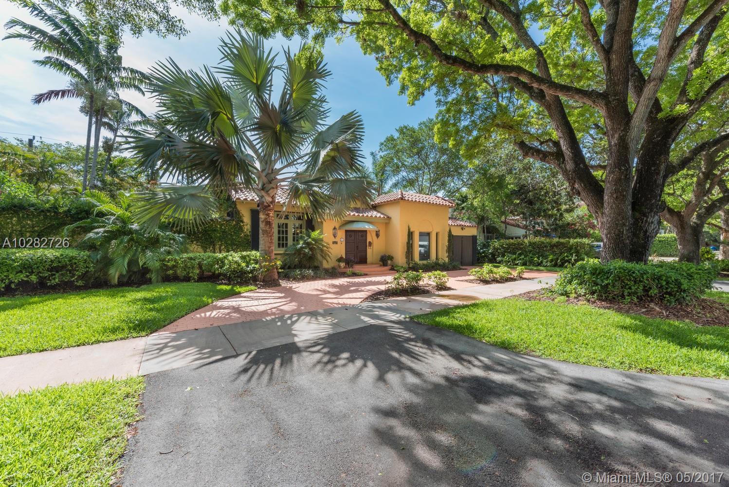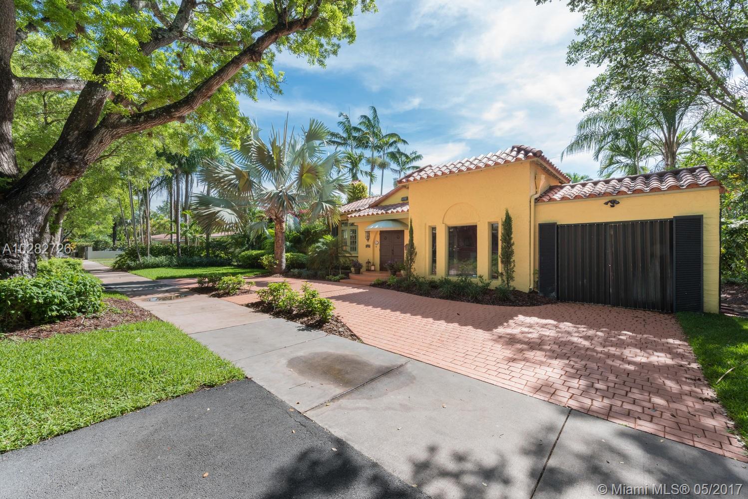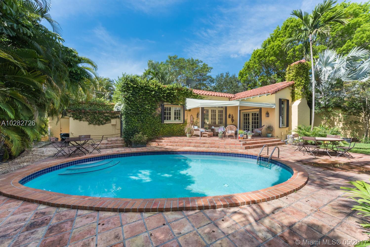 Delightful Old Spanish pool home ideally located just a stone's throw from Cocoplum Circle on a coveted, tree-lined, South Gables street. Fabulous great room with volume ceilings opens up to large dining area and looks out to beautiful pool and patio. Unique double lot provides for an ample yard and lots of room to entertain. Spacious master suite with a private patio & large closets. Beautifully remodeled bath & kitchen, large family room/den & stunning original windows provide lots of natural light.