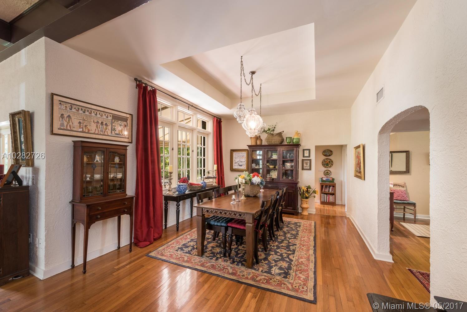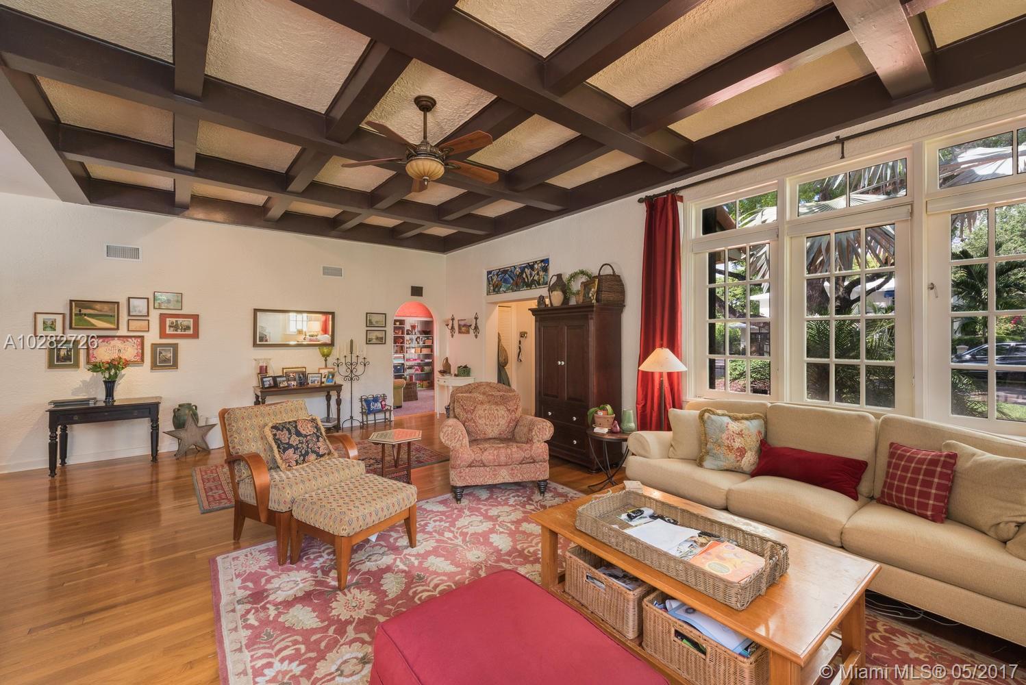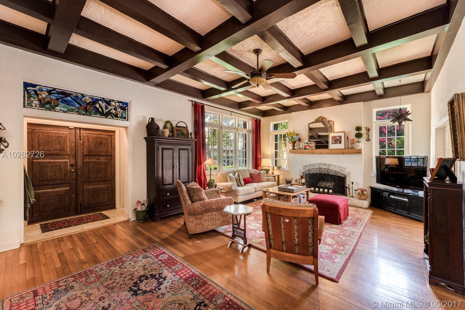 Delightful Old Spanish pool home ideally located just a stone's throw from Cocoplum Circle on a coveted, tree-lined, South Gables street. Fabulous great room with volume ceilings opens up to large dining area and looks out to beautiful pool and patio. Unique double lot provides for an ample yard and lots of room to entertain. Spacious master suite with a private patio & large closets. Beautifully remodeled bath & kitchen, large family room/den & stunning original windows provide lots of natural light.
