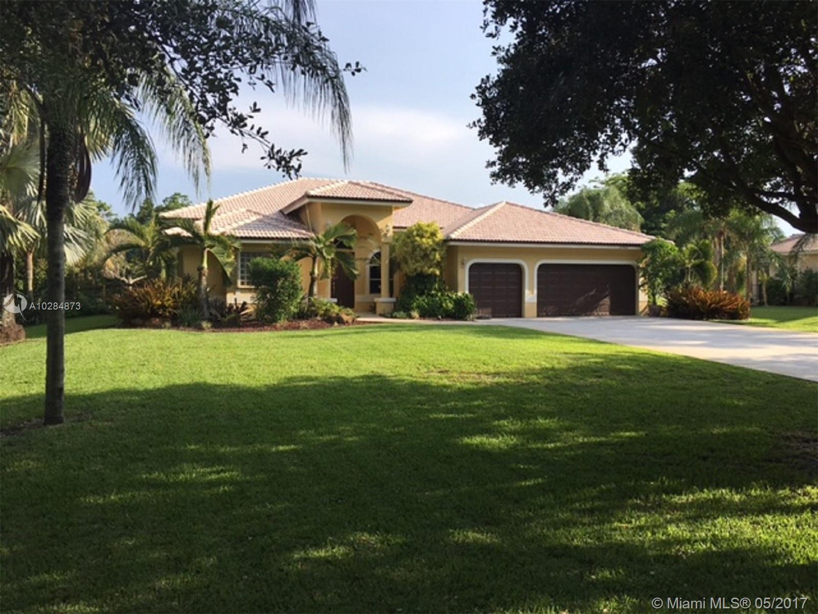 It feels like you're in the country, but you're just minutes from everything. Rare newer construction on a beautiful and private acre of land with almost no HOA fees. Fabulous kitchen was just redone and features quartz counters, stainless appliances, farmhouse sink, reverse osmosis water system, and soft close drawers. Mahogany wood laminate floors in all living areas. High ceilings, open floor plan, split bedrooms. Crown molding, lots of hi-hats, central vac, intercom and alarm. Accordion shutters. Unbelievable resort style backyard with a horse trail behind. 100 foot concrete drive. Great Davie schools, parks and services.