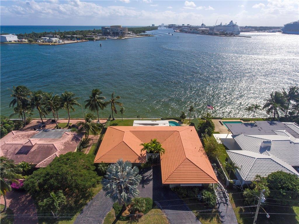 Commanding front-row views at the entrance to Port Everglades, this prime waterfront estate in a desirable beachside neighborhood overlooks a riveting expanse of waters that stretch to the Intracoastal and Ocean and give an ever-changing source of enchantment as the majestic cruise ships and yachts sail by. On tropically landscaped grounds, the comfortable single-story residence, perfect for a custom renovation, focuses on this awe-inspiring view from the bright open living areas and pool patio.
