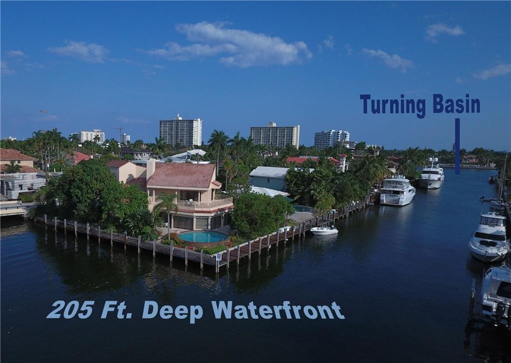 Interior point lot home offers 205 ft. of deep water frontage, ideal for docking large yachts! Featuring wide waterway and large turning basin, quick & easy ocean access with no fixed bridges. Home boasts a sophisticated architectural style with panoramic water views from both levels! Tremendous value! Live in prestigious Seven Isles community. Walk to the beach, Las Olas boutiques, galleries and dining; Seven Isles gate house, 24/7 security. Build new or update existing home.