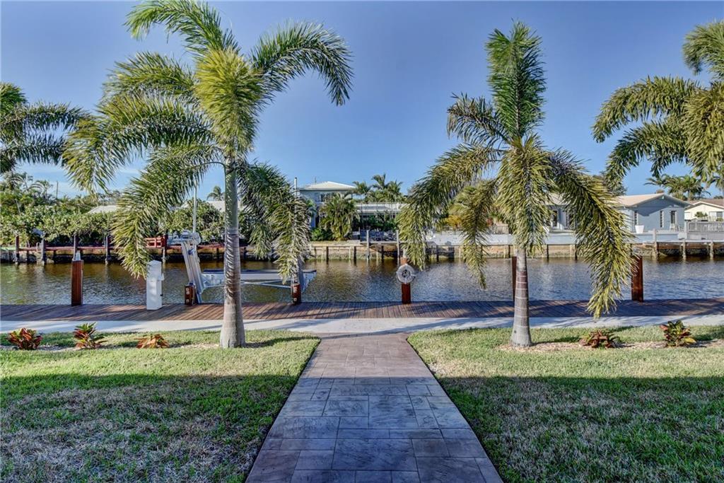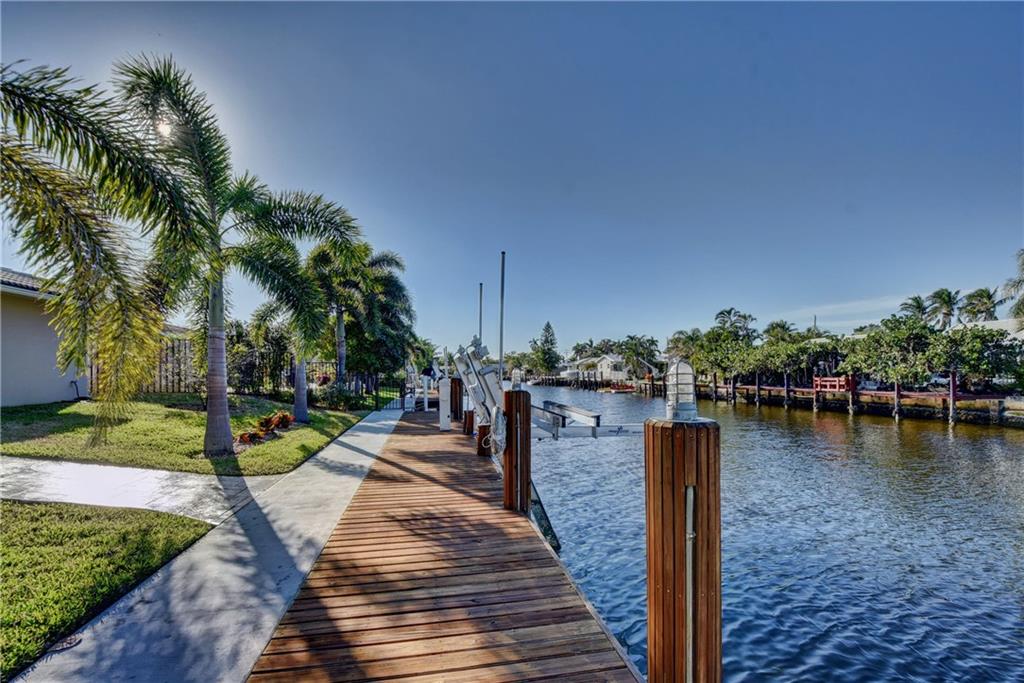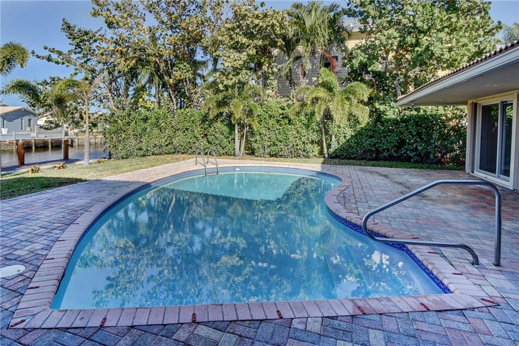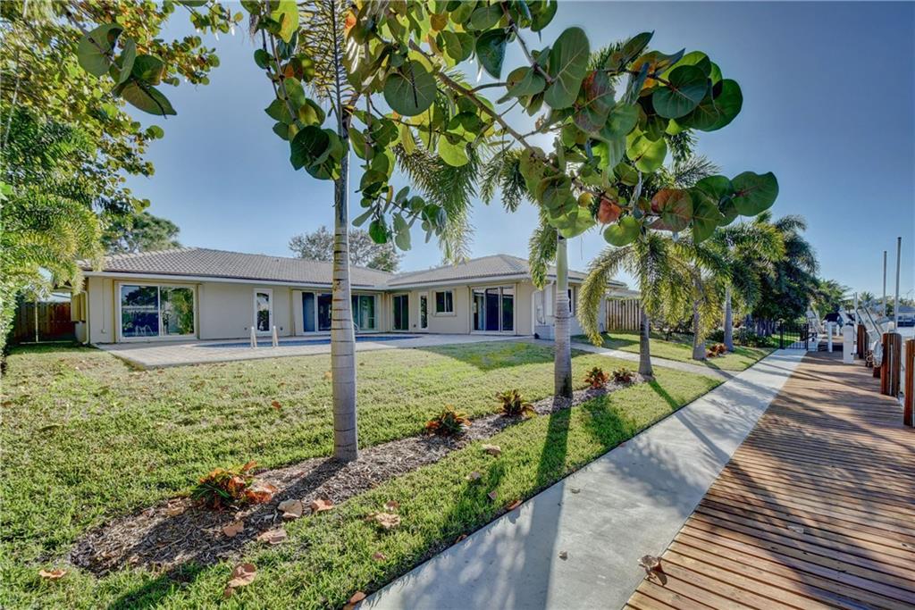 Updated waterfront, ocean access, pool home located on cul de sac in quiet neighborhood. New 400 amp electrical service, New kitchen w/ wood cabinets, solid surface counter, st/steel appliances, New flooring, New windows/doors/shutters, New stamped concrete driveway, New 2 car garage door & New 80' dock w/ 10,000# boat lift. Seawall replaced in '09, roof replaced in '03. The kitchen, dining, living room & 2 bedrooms have doors to the pool/patio & views of the water. 11.5' fixed bridge clearance to ICW.