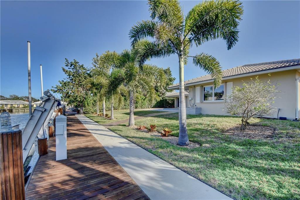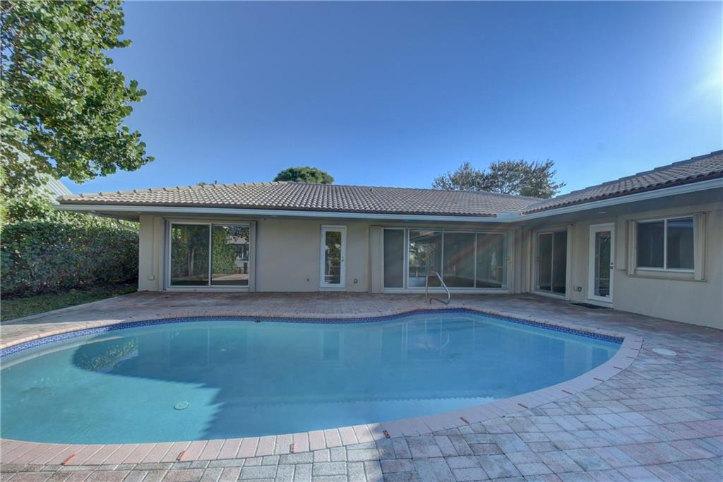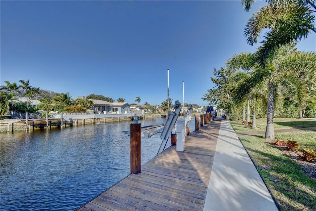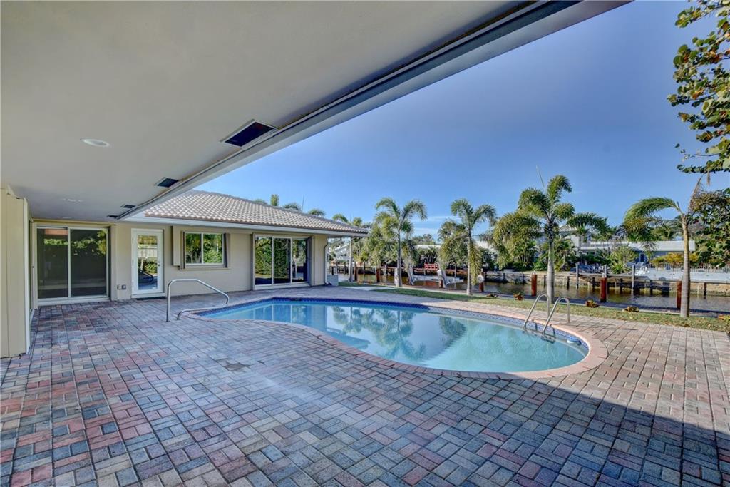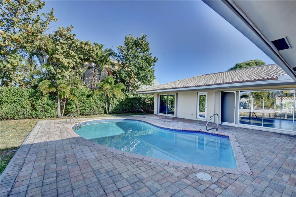 Updated waterfront, ocean access, pool home located on cul de sac in quiet neighborhood. New 400 amp electrical service, New kitchen w/ wood cabinets, solid surface counter, st/steel appliances, New flooring, New windows/doors/shutters, New stamped concrete driveway, New 2 car garage door & New 80' dock w/ 10,000# boat lift. Seawall replaced in '09, roof replaced in '03. The kitchen, dining, living room & 2 bedrooms have doors to the pool/patio & views of the water. 11.5' fixed bridge clearance to ICW.