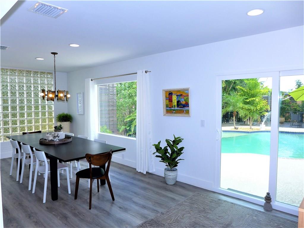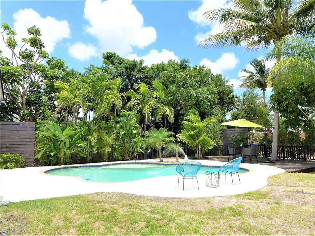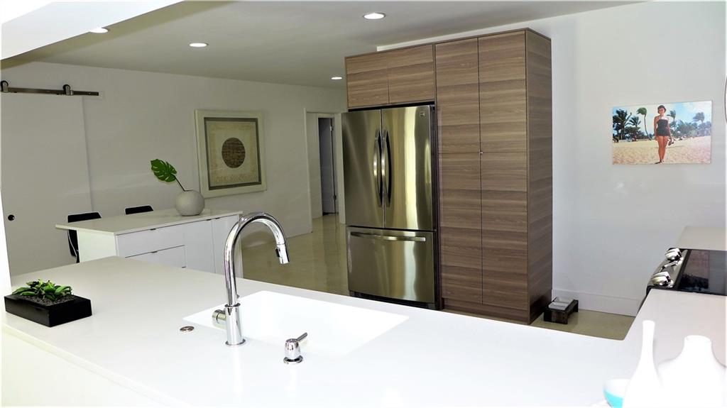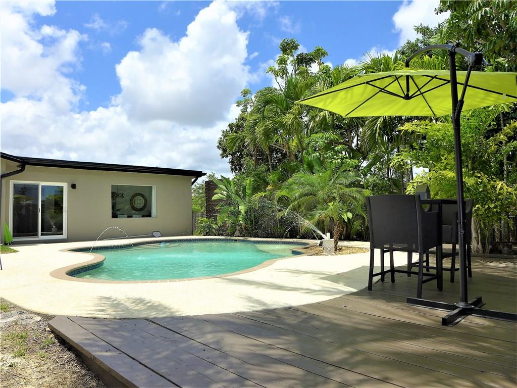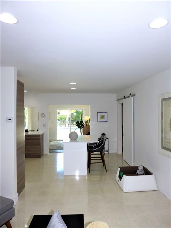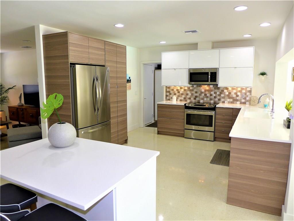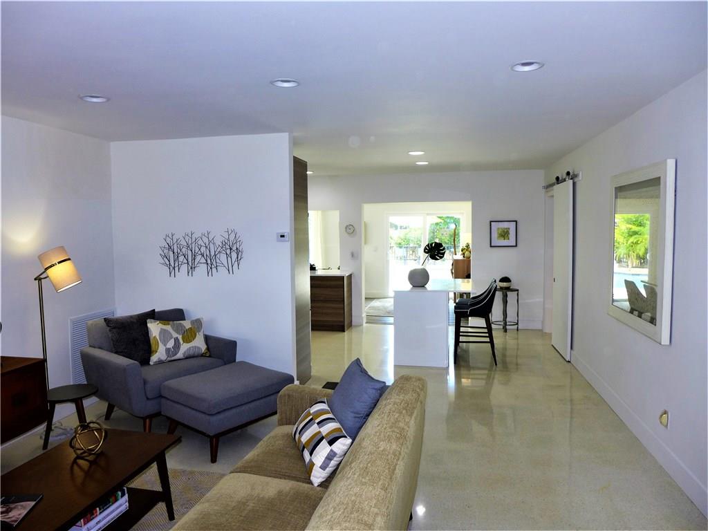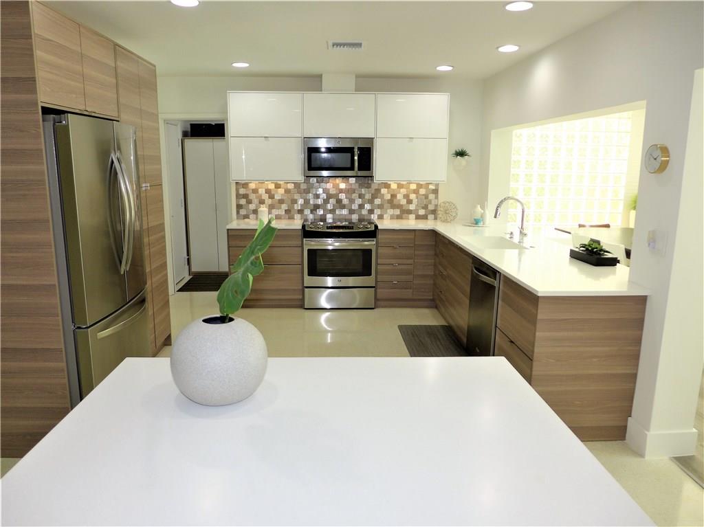 Spectacularly modernized w/incredible custom touches, terrazzo flooring & LED recessed lighting throughout! Natural light streams thru the impact windows & doors facing the large pool w/seating,lights, fountains, deck & huge yard! Kitchen & custom island boast soft close cabinets, pullout pantry, Corian counters, builtin electrical, SS appliances & so much more! Large bedrooms, walk-in closets w/cabinetry, luxurious bathrooms, circular driveway, spacious laundry room are just a few of the MANY upgrades!