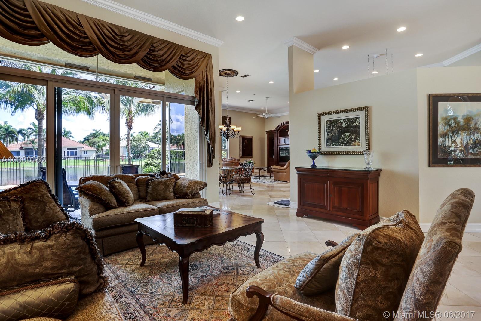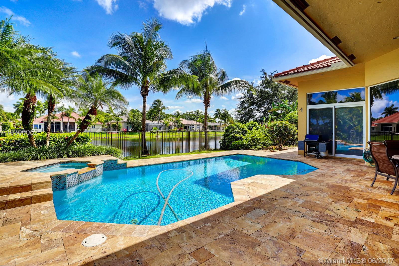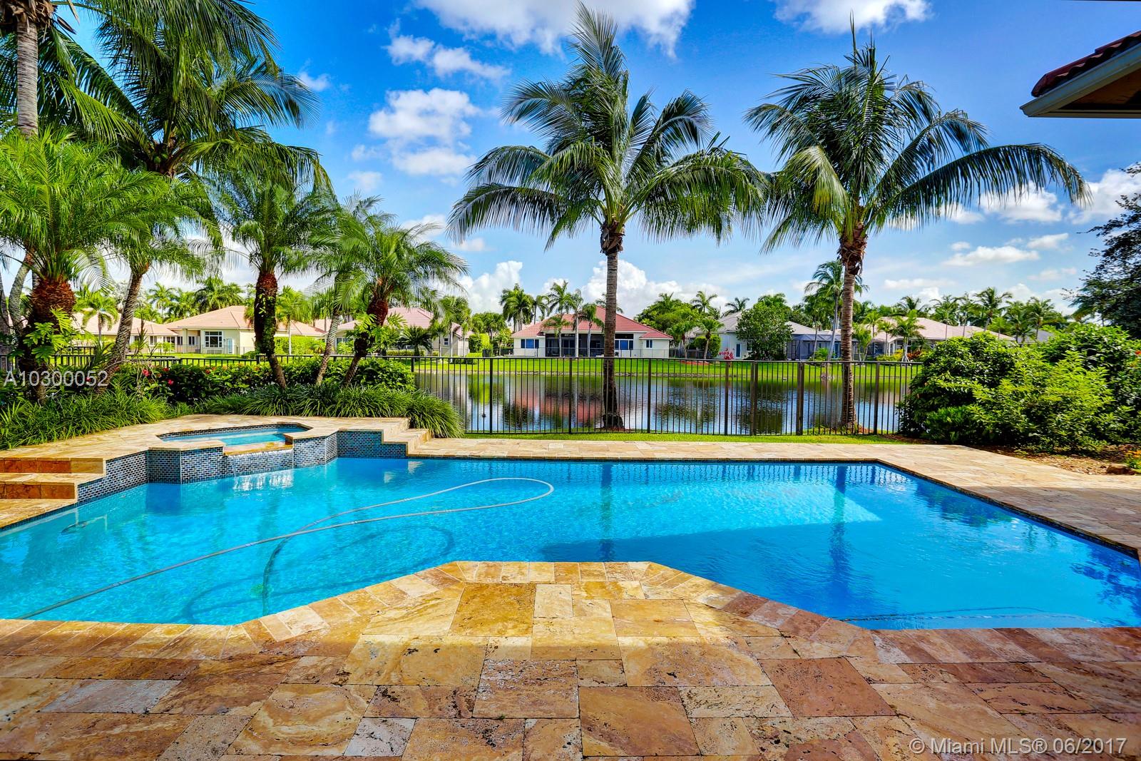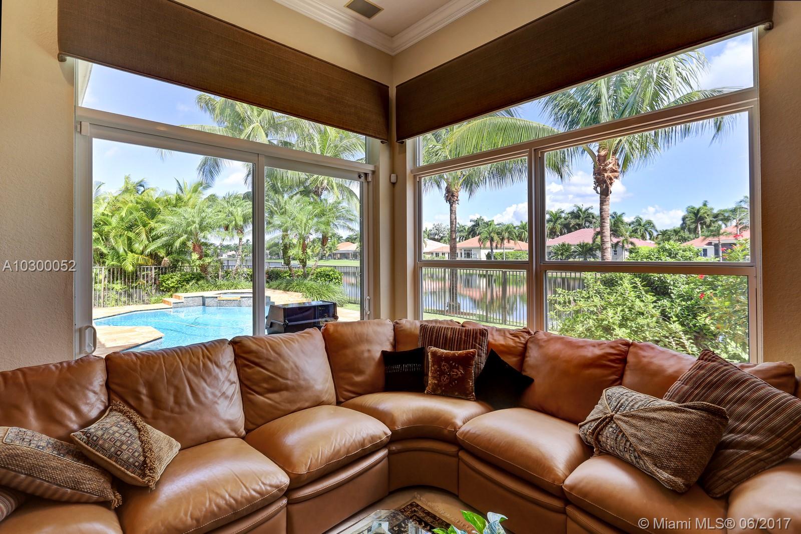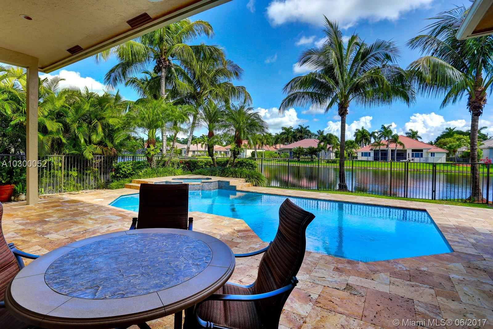 Lakefront custom built Greenwich model, almost 3000' sq. of luxurious and upgraded living area w. 4BR, 3FBA + Den. Crema Marfil marble floors throughout the social areas. Gourmet kitchen features custom Quartzite countertops (Blue Louise), 42” wood cabinets, under-cabinet lighting, stainless steel appliances, including Sub-Zero refrigerator/freezer, KitchenAid double oven & microwave, warming drawer & dishwasher. Impact glass front & rear doors and windows, accordions shutters on the sides. Tiled roof & gutters installed in 2007. Gold travertine pool deck & recently resurfaced saline chlorinated pool & spa with waterfall feature. Fully maintained dual zone, multi-speed 18.5 Seer A/C units. Hybrid wired and wireless security system with 2 remotes and digital dialer. Lake fed irrigation.