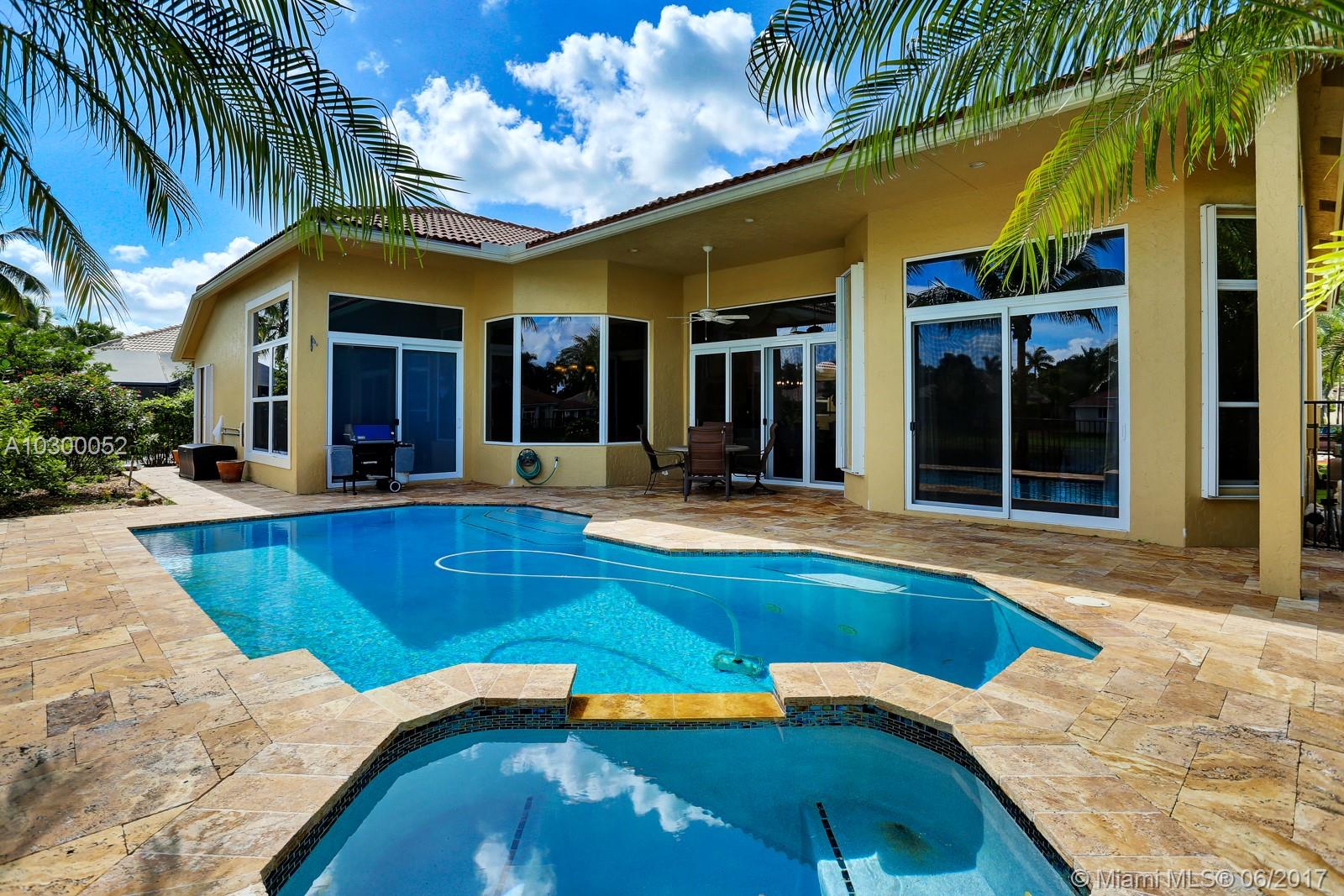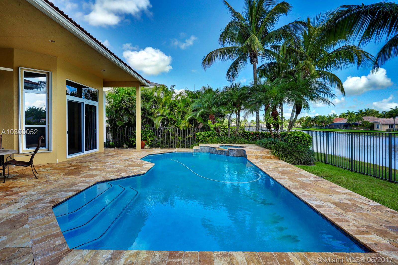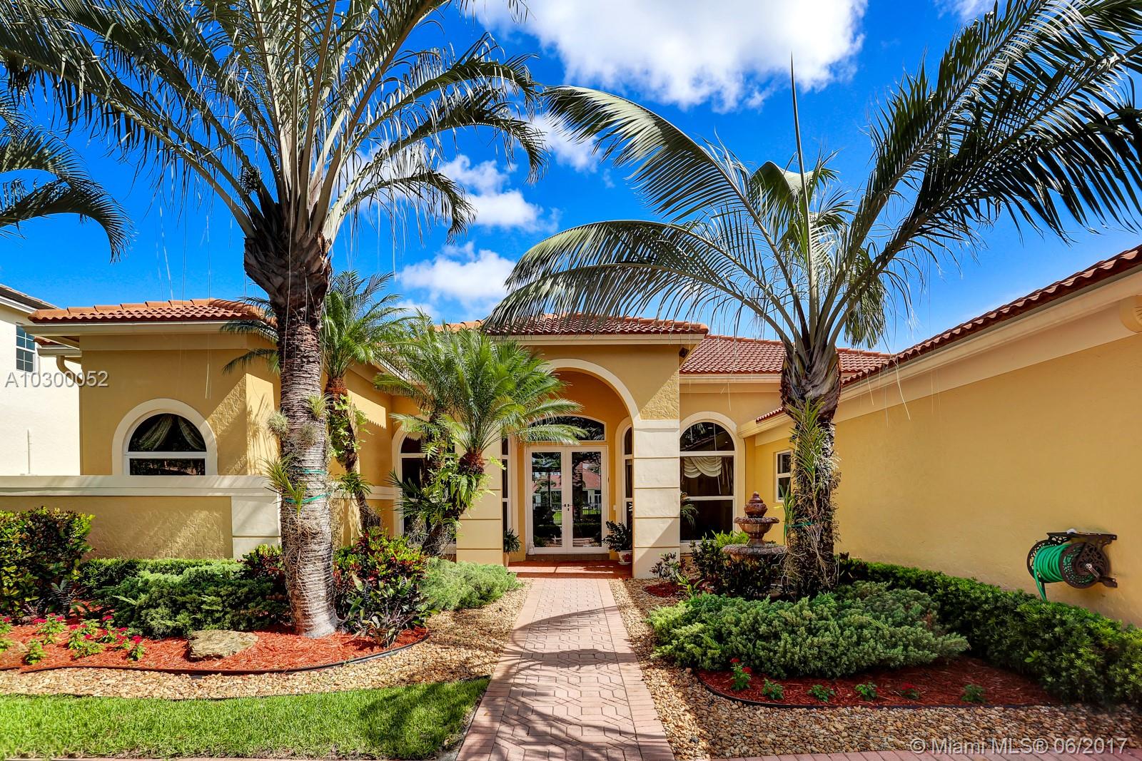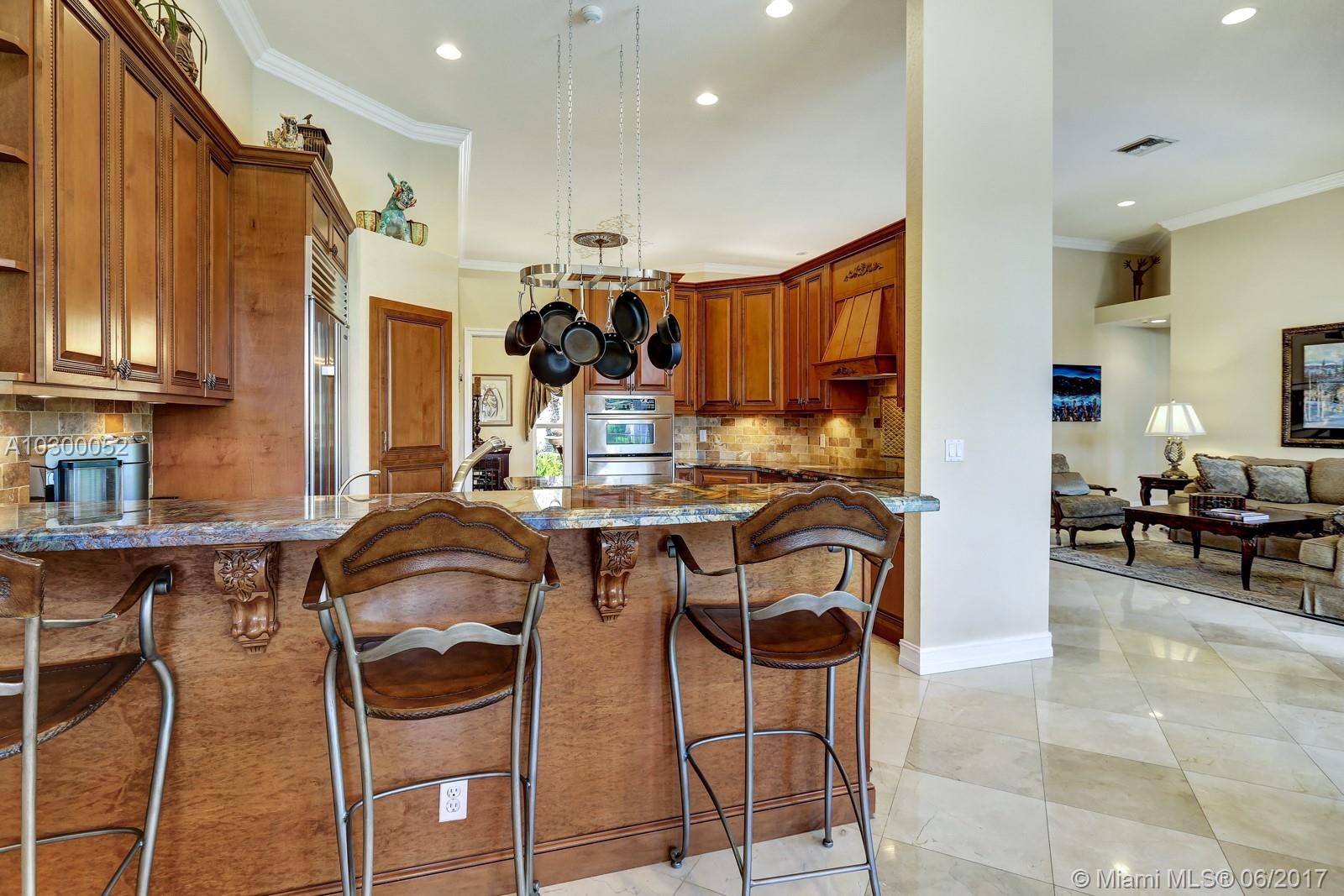 Lakefront custom built Greenwich model, almost 3000' sq. of luxurious and upgraded living area w. 4BR, 3FBA + Den. Crema Marfil marble floors throughout the social areas. Gourmet kitchen features custom Quartzite countertops (Blue Louise), 42” wood cabinets, under-cabinet lighting, stainless steel appliances, including Sub-Zero refrigerator/freezer, KitchenAid double oven & microwave, warming drawer & dishwasher. Impact glass front & rear doors and windows, accordions shutters on the sides. Tiled roof & gutters installed in 2007. Gold travertine pool deck & recently resurfaced saline chlorinated pool & spa with waterfall feature. Fully maintained dual zone, multi-speed 18.5 Seer A/C units. Hybrid wired and wireless security system with 2 remotes and digital dialer. Lake fed irrigation.