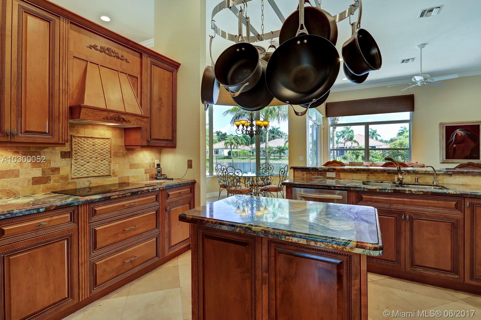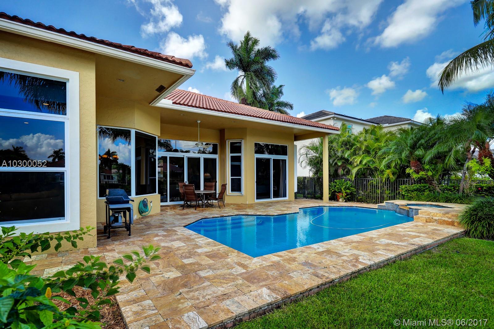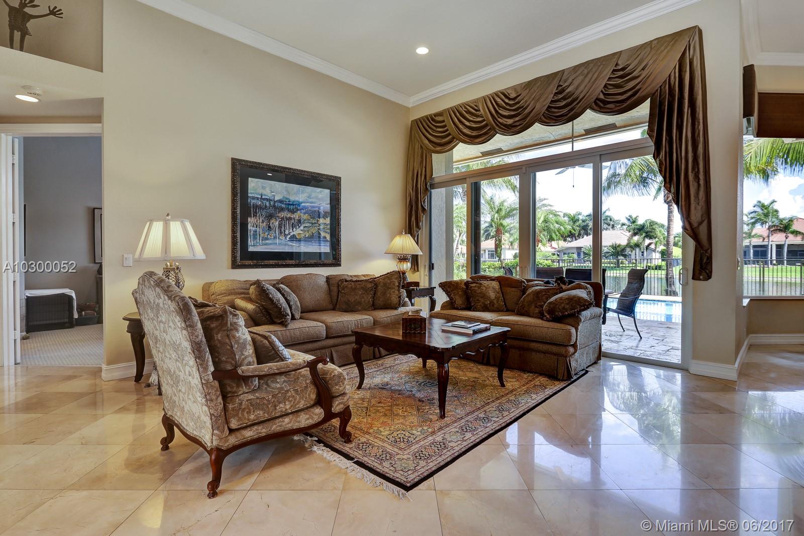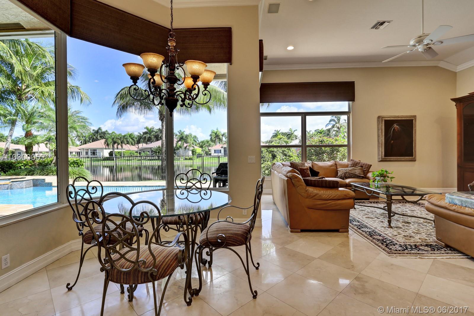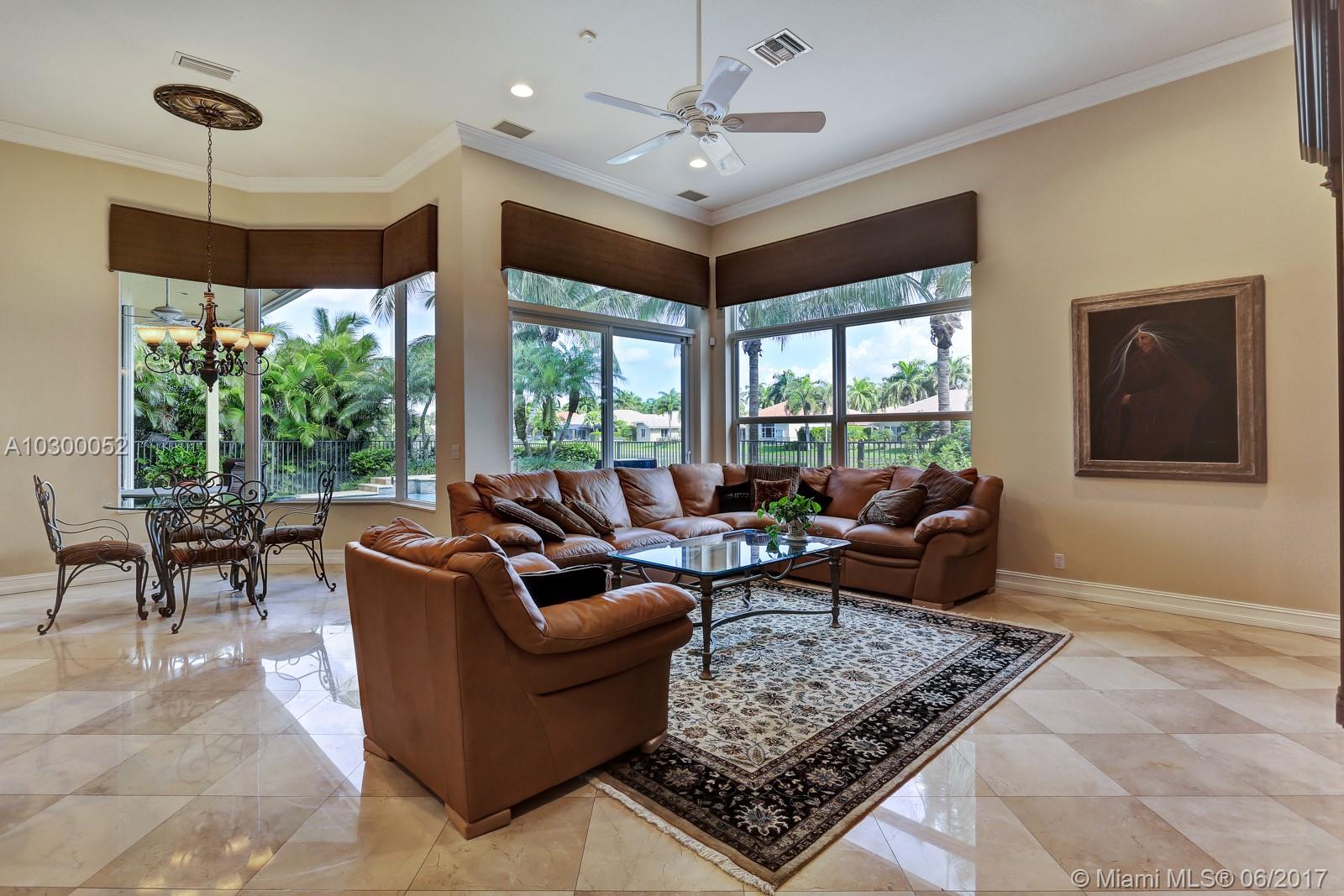 Lakefront custom built Greenwich model, almost 3000' sq. of luxurious and upgraded living area w. 4BR, 3FBA + Den. Crema Marfil marble floors throughout the social areas. Gourmet kitchen features custom Quartzite countertops (Blue Louise), 42” wood cabinets, under-cabinet lighting, stainless steel appliances, including Sub-Zero refrigerator/freezer, KitchenAid double oven & microwave, warming drawer & dishwasher. Impact glass front & rear doors and windows, accordions shutters on the sides. Tiled roof & gutters installed in 2007. Gold travertine pool deck & recently resurfaced saline chlorinated pool & spa with waterfall feature. Fully maintained dual zone, multi-speed 18.5 Seer A/C units. Hybrid wired and wireless security system with 2 remotes and digital dialer. Lake fed irrigation.