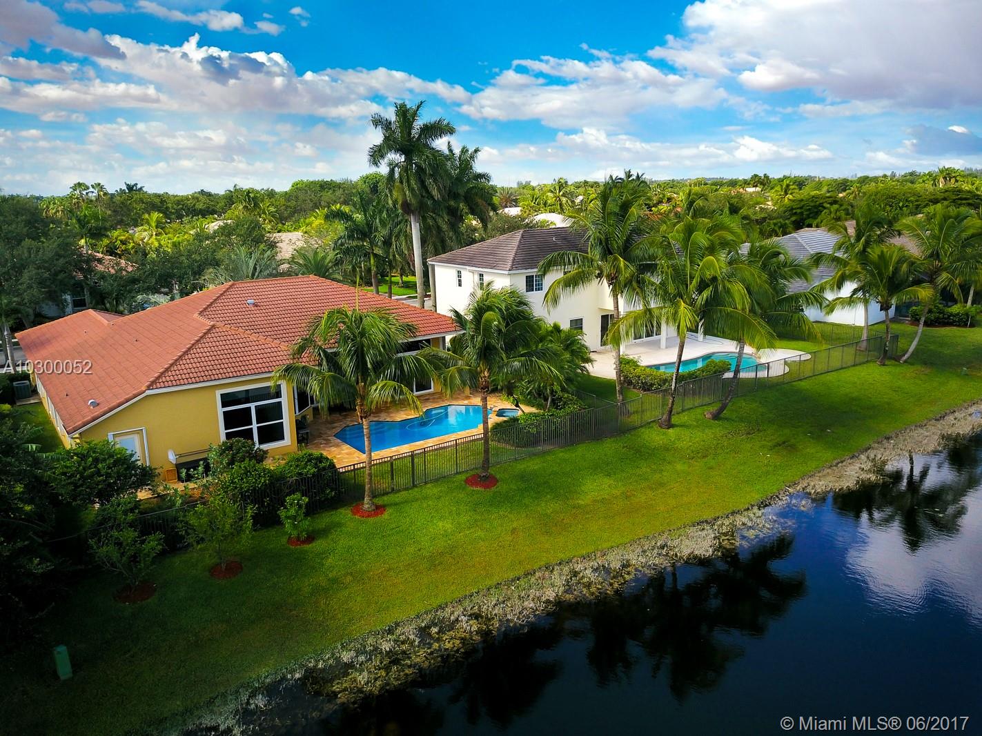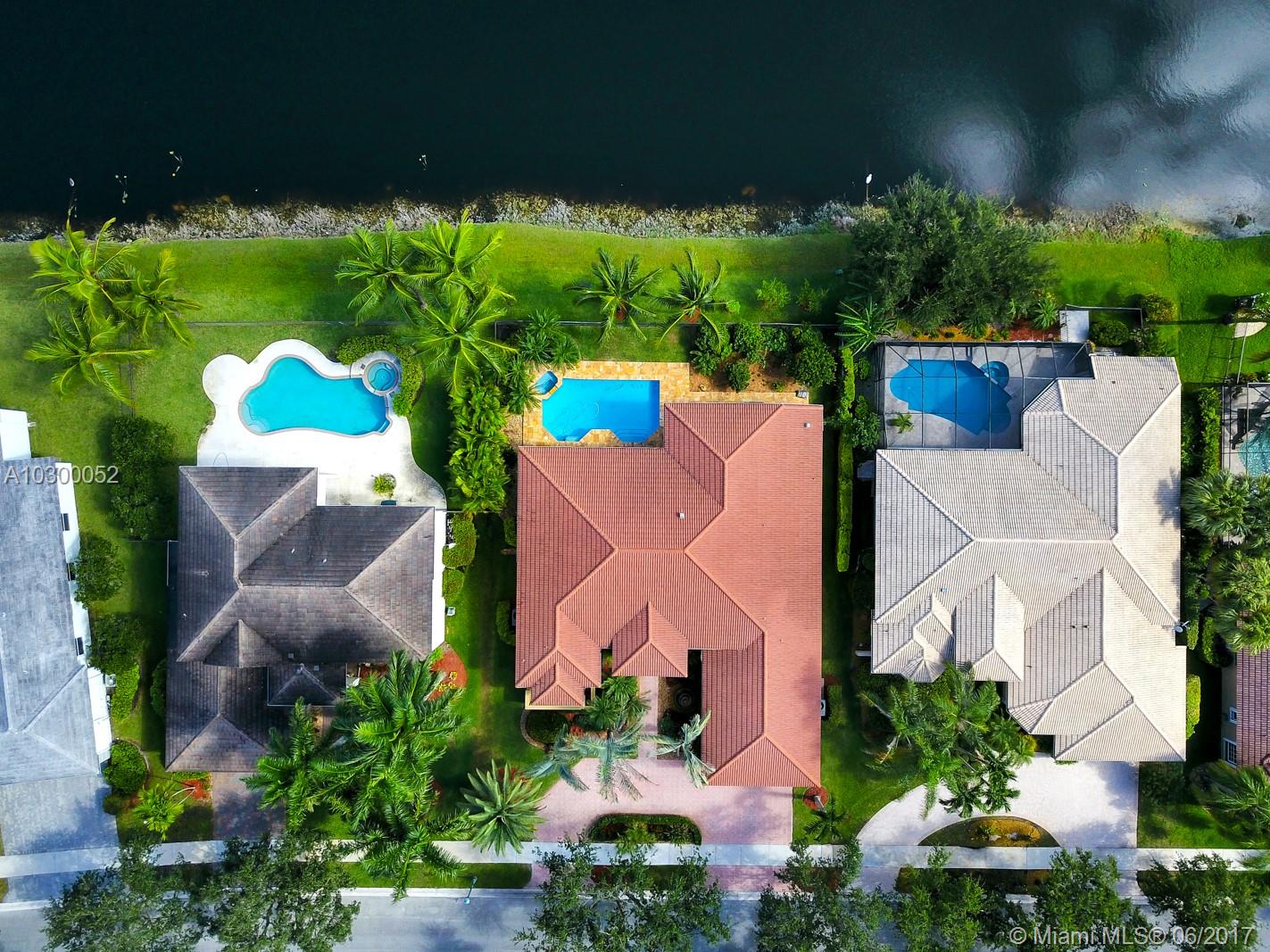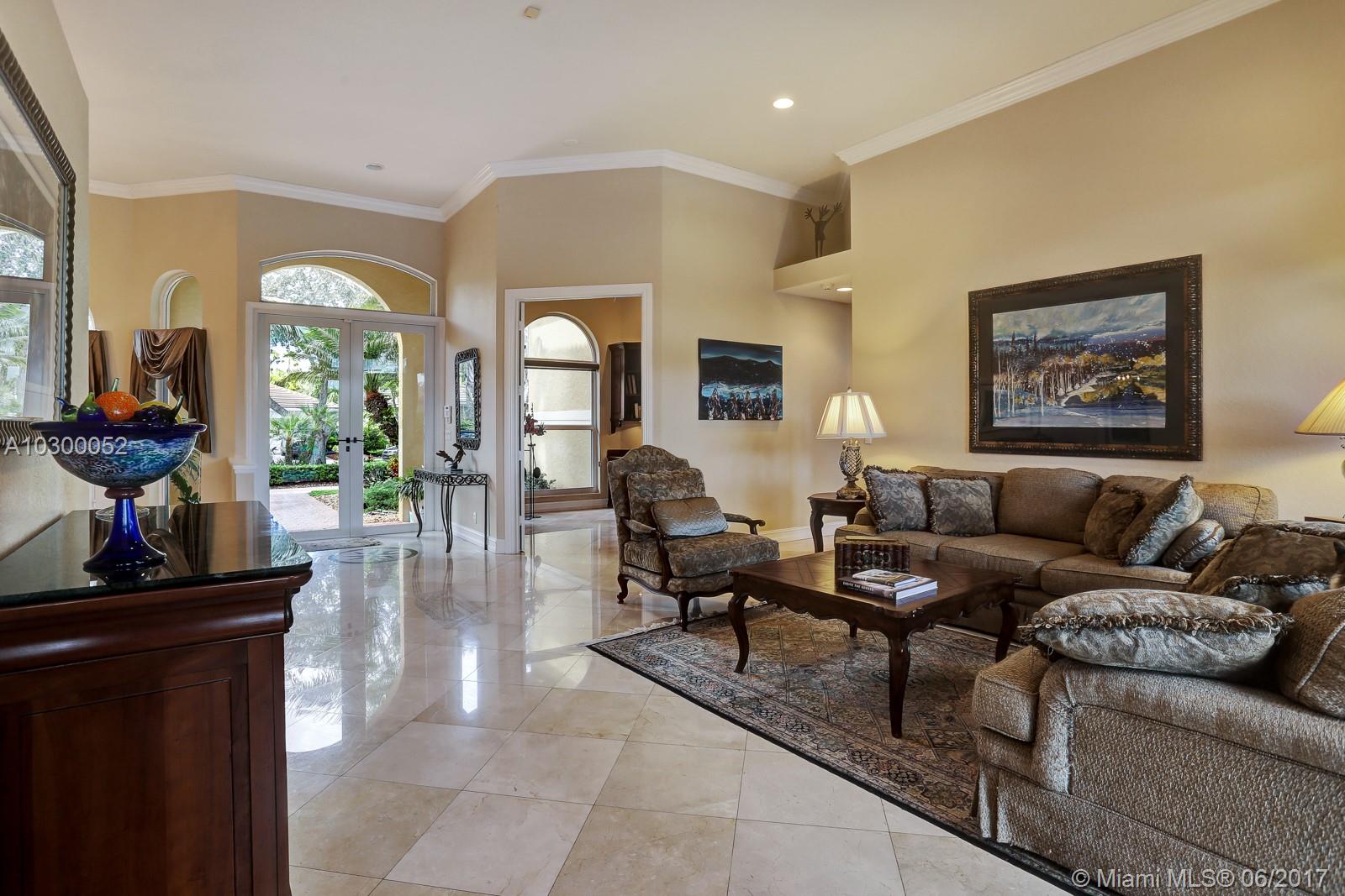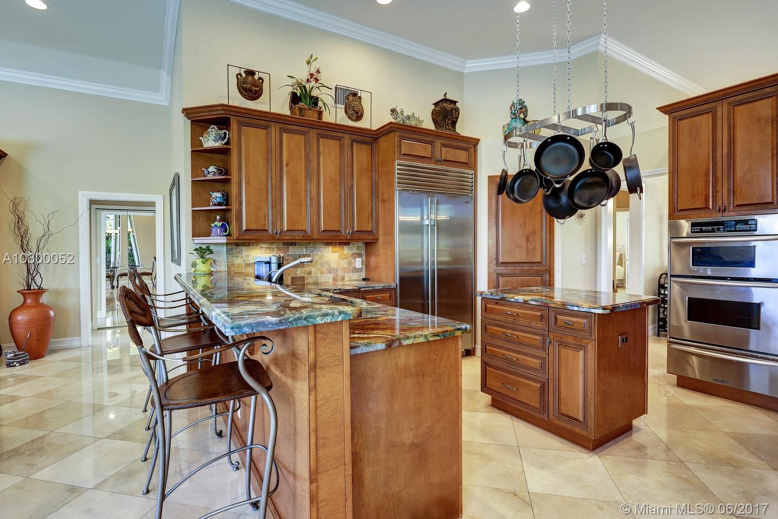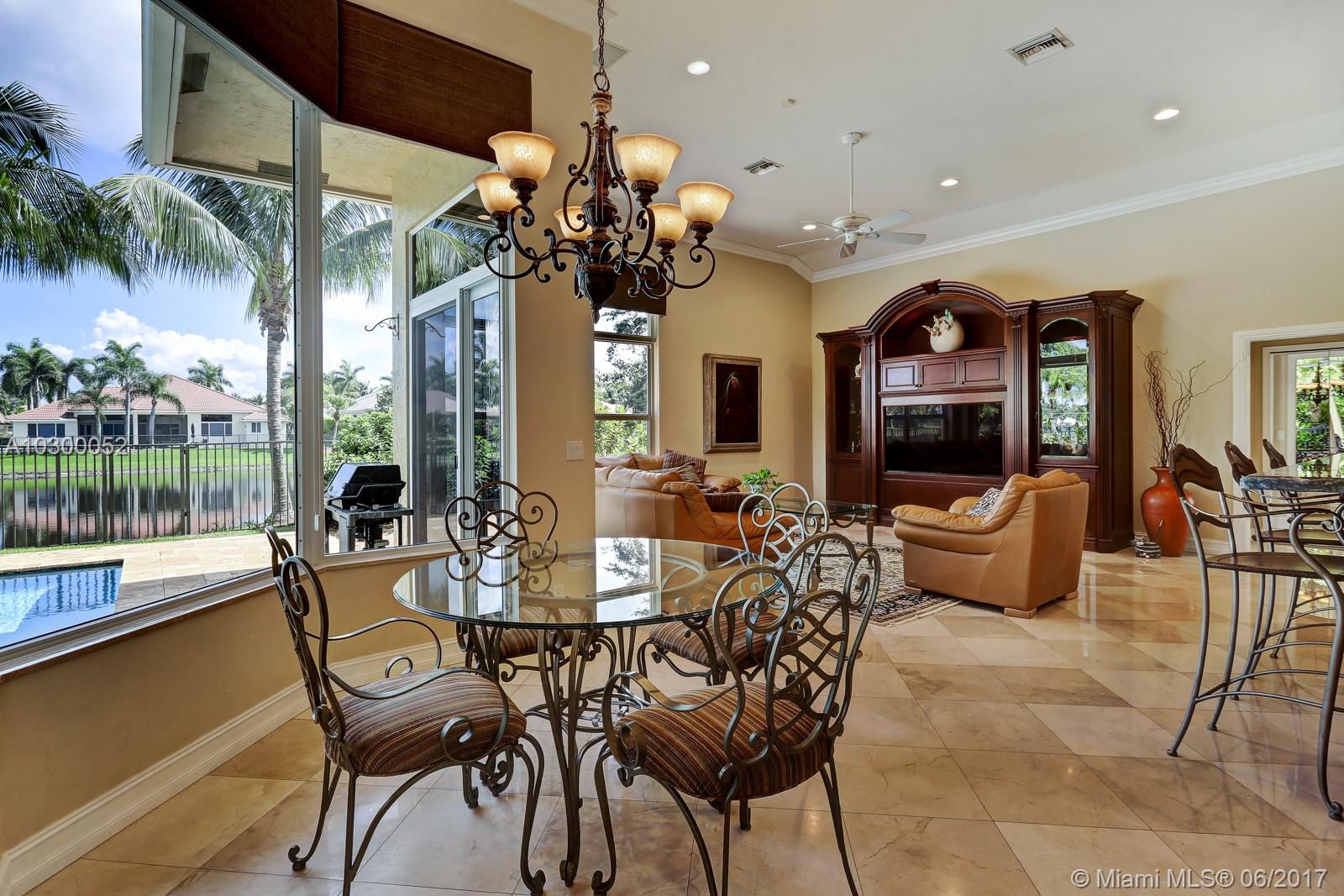 Lakefront custom built Greenwich model, almost 3000' sq. of luxurious and upgraded living area w. 4BR, 3FBA + Den. Crema Marfil marble floors throughout the social areas. Gourmet kitchen features custom Quartzite countertops (Blue Louise), 42” wood cabinets, under-cabinet lighting, stainless steel appliances, including Sub-Zero refrigerator/freezer, KitchenAid double oven & microwave, warming drawer & dishwasher. Impact glass front & rear doors and windows, accordions shutters on the sides. Tiled roof & gutters installed in 2007. Gold travertine pool deck & recently resurfaced saline chlorinated pool & spa with waterfall feature. Fully maintained dual zone, multi-speed 18.5 Seer A/C units. Hybrid wired and wireless security system with 2 remotes and digital dialer. Lake fed irrigation.