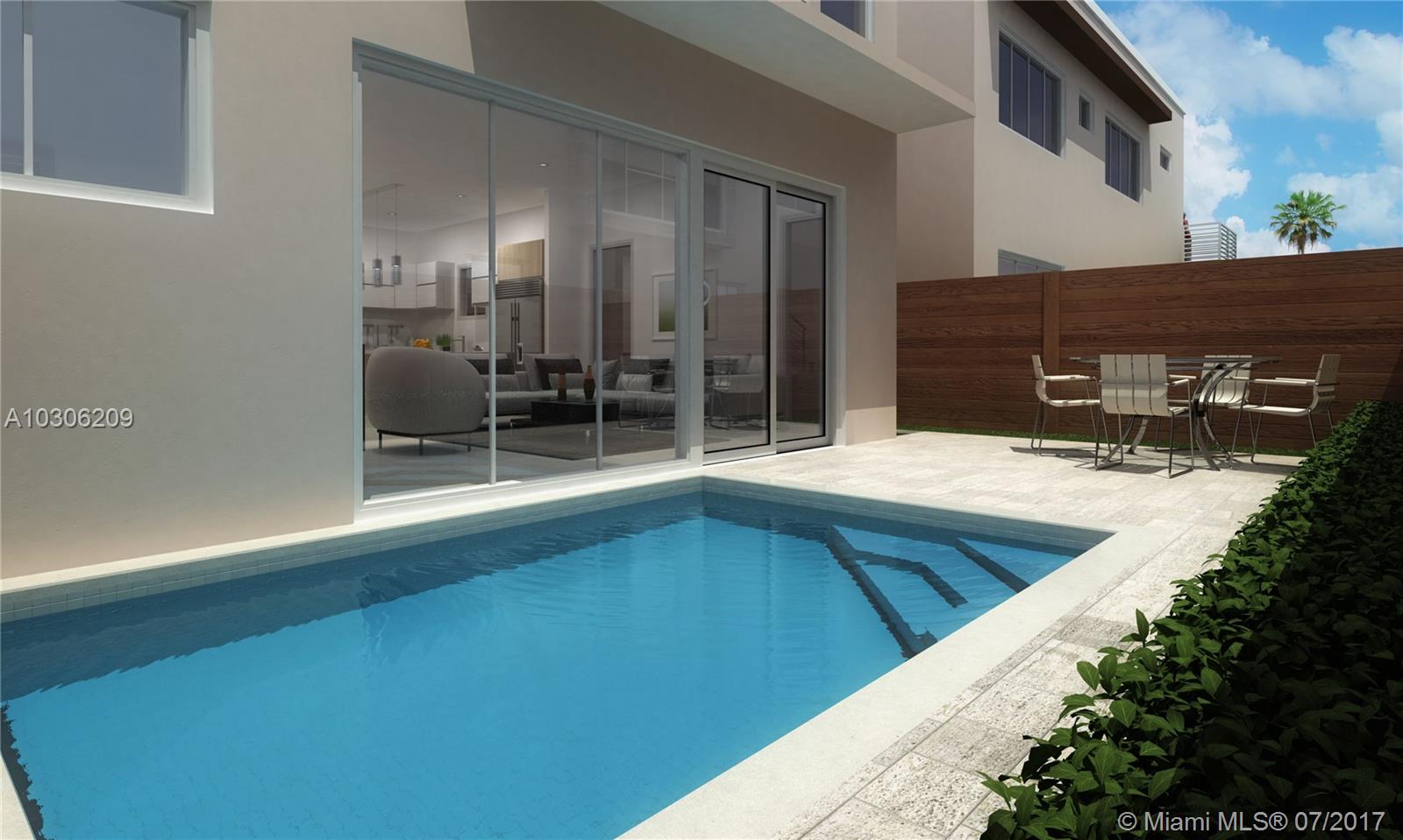 New modern 2 story semi-detached single family home in Coral Ridge. Bayview Elementary, Galleria Mall and beaches are steps away. Property offers luxury, design and the highest building standards with 1st class finishes, European kitchen and bathroom cabinets, quartz countertops, premium appliances, roof mounted 16 SEER AC unit, TPO roofing, concrete floor system, 9ft ceilings and 18ft car garage door. Open floor plan overlooking private pool for great family living/entertainment and convenient full size en-suite den/studio in ground floor makes it perfect for home based working. 1st floor combines master suite with flush shower, free standing tub, dual sinks, spacious walk in closet and balcony overlooking pool/patio, 2 en-suite bedrooms with walk in closets and generous laundry room.