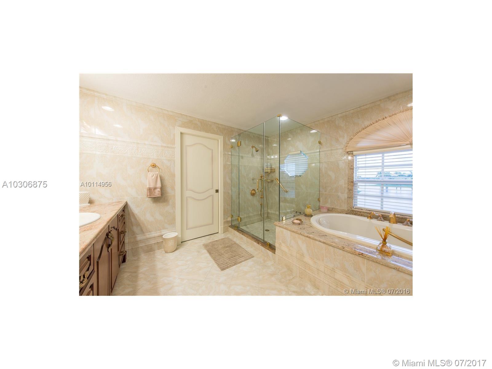 Located in prestigious Doral Estates, this magnificent two-story home is a must see with one of the only reaming unobstructed lake & golf course views in the area. This home features 5 BD/4.5 BA, gourmet kitchen & formal dining & living rooms. Other features include central vac system, walk-in closets, impact glass & French doors. The master suite upstairs, which includes a grand master bath, boasts wall to wall glass doors that open to a large balcony overlooking the waterfront pool and spa. 2 car + golf cart garage.