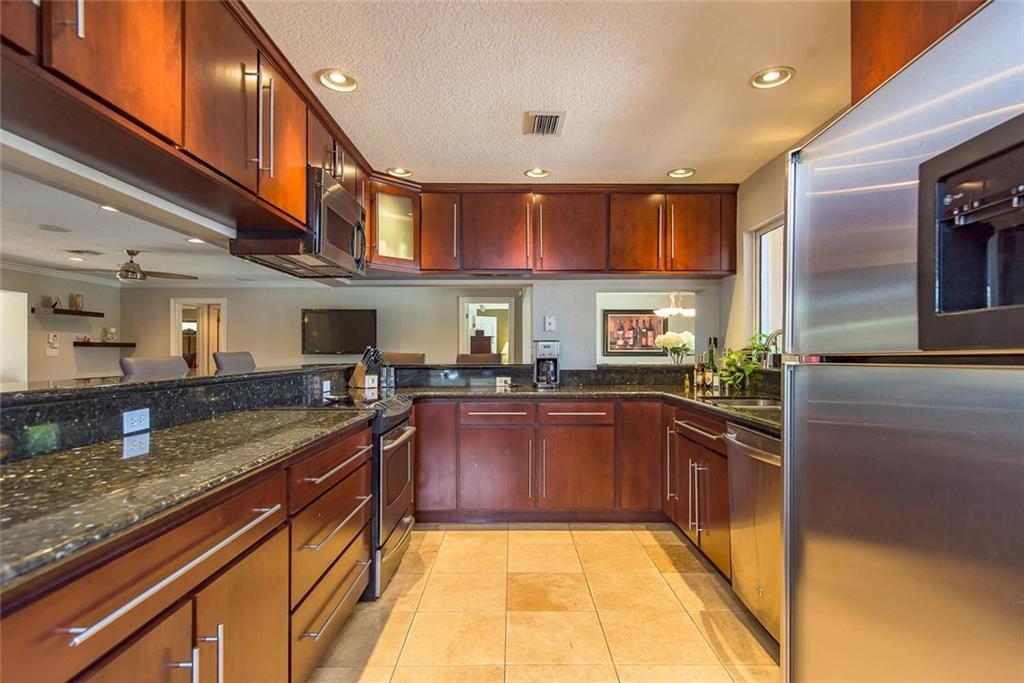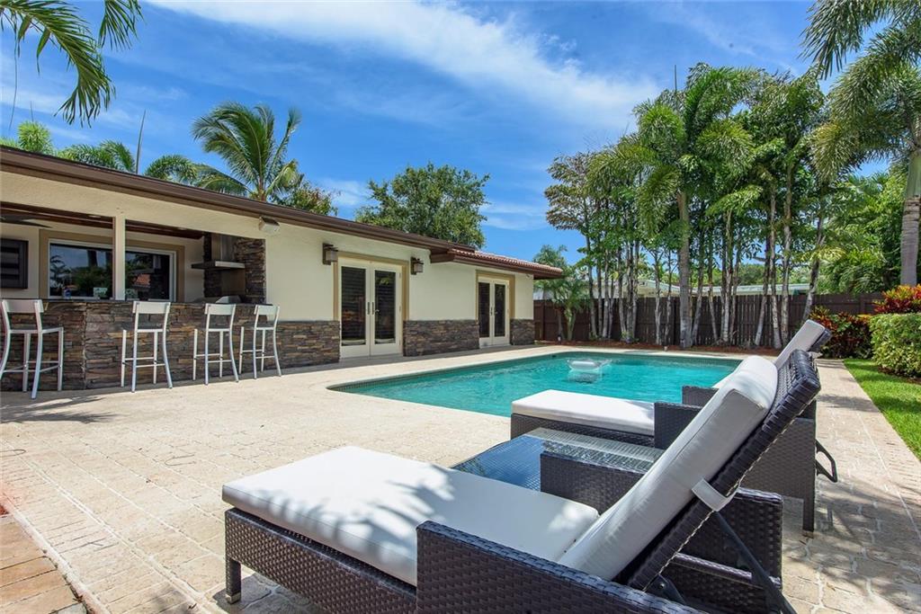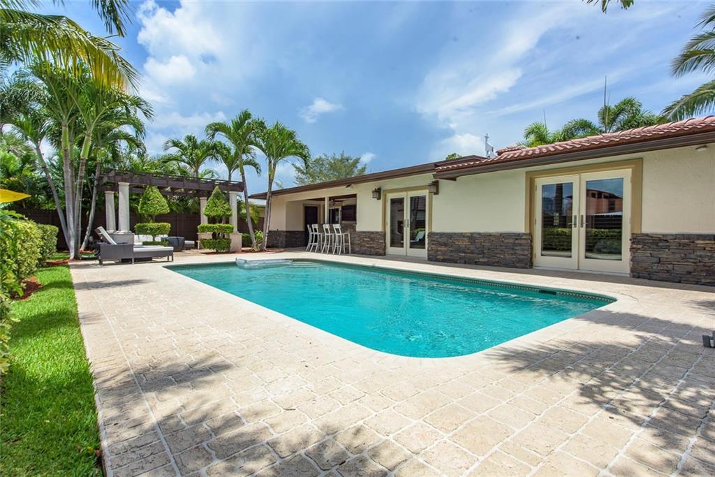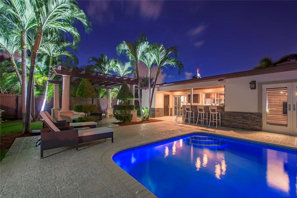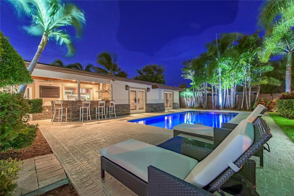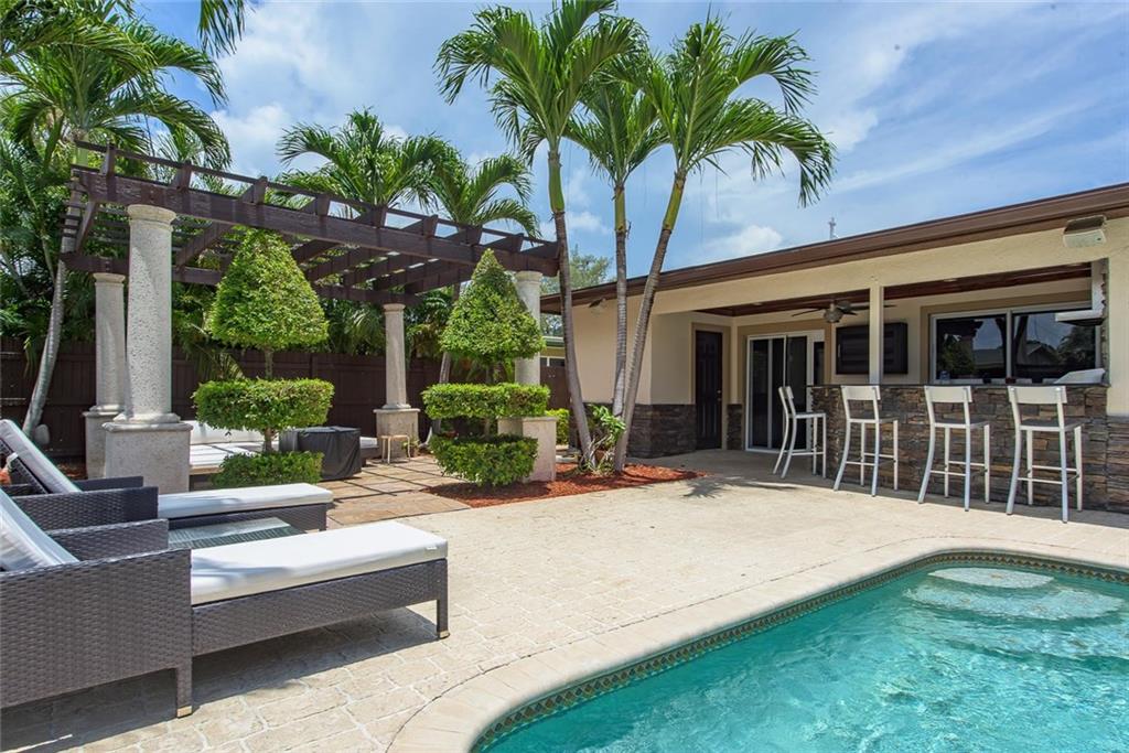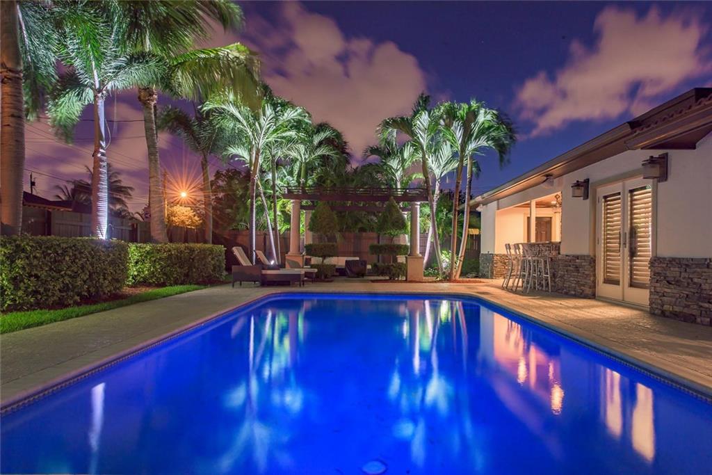 Reduced for immediate sale. Beautifully updated with a transitional feel, this home is South Florida living at it's finest. Featuring two bedrooms and three baths. Espresso colored tile floors throughout the home with an open and relaxing feel.The resort style backyard includes loads of palm trees and landscape lighting for nighttime entertaining. The kitchen is open to all the living areas including formal dining room, living room and family room/office. Super private, fully fenced backyard.