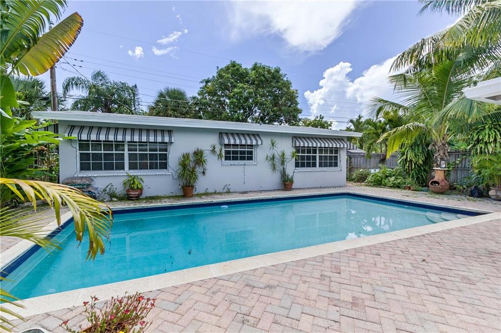 House with super nice cottage, separated by the pool. Lots of possibilities here --- front house is 3 beds/ 1 bath, den, large screened porch, then out to the pool. A/C new in 2016. Back Cottage (not attached) is a nicely renovated 1 bed/ 1.5 bath bright unit. Both homes have central A/C and their own washers and dryers. One water meter, 2 electrical meters. Sweet street in Poinsettia Heights, easy to access Federal Highway or over to Wilton Manors. Live in one and rent out the other --- easy living.