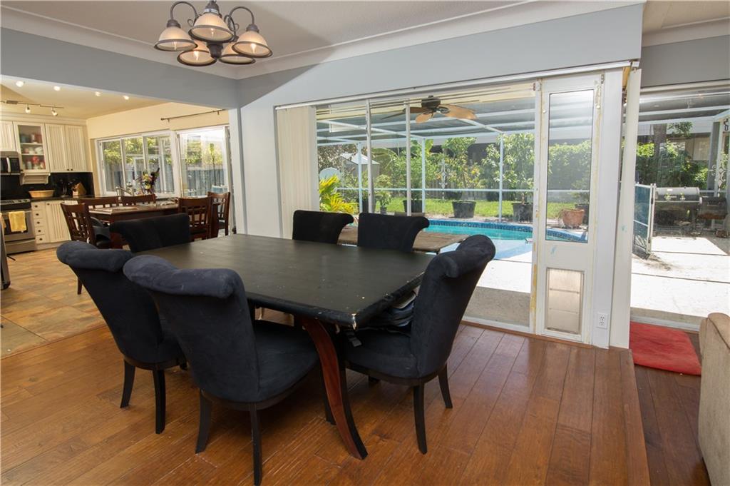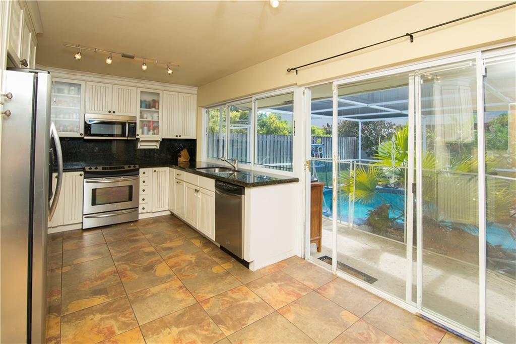 This beautifully remodeled 4 Bedroom 2 Bath home features wood floors throughout the entire home. Enjoy the custom kitchen featuring s/s appliances, granite counter tops, pass through to the patio and pool area. The bathrooms have also been remodeled. The open floor plan and the numerous floor to ceiling sliders allows plenty of light in. Screened pool, big yard. 2 car garage with lot of cabinets for storage. Short stroll to restaurants, shops, library. Just a short ride to the beach.