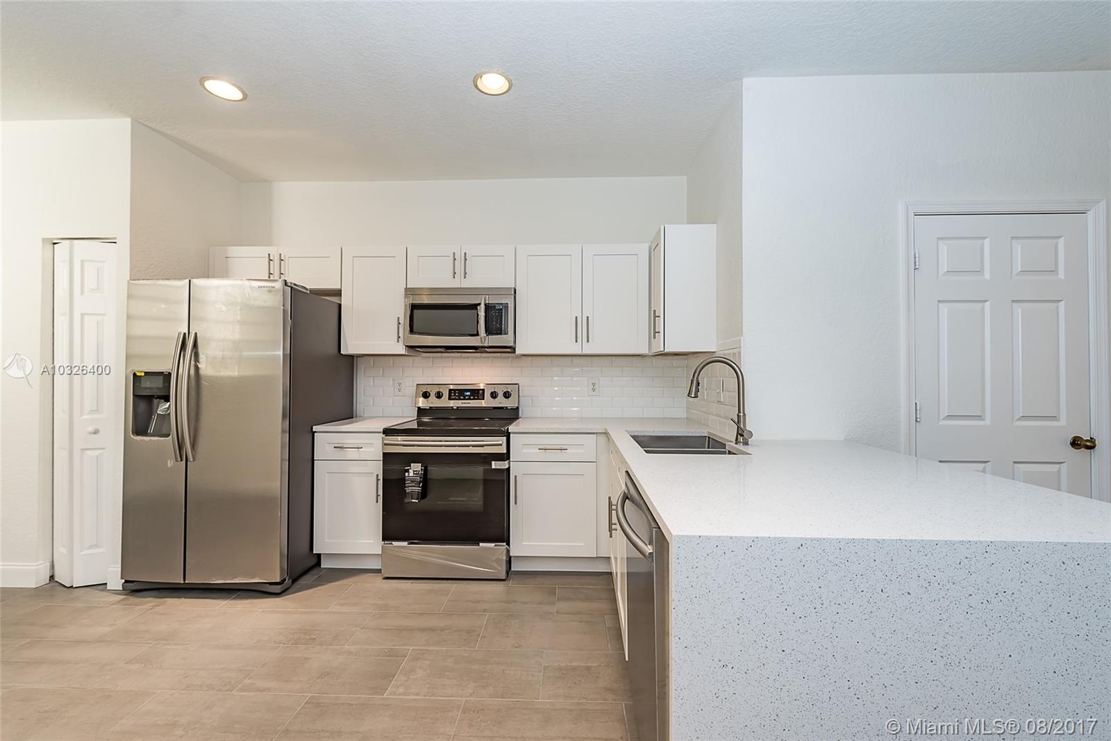 Gorgeous completely remodeled townhouse located in Courtyard at the Grove in Weston, FL. This master piece features new white cabinetry kitchen, white modern waterfall quartz edge countertop, white subway tile backsplash, stainless steel Samsung appliances, porcelain slate finish flooring in ground floor and neutral natural laminate wood flooring upstairs. Property has everything you have been looking for with two master suites located upstairs, high ceilings, a screen porch, A+ schools in the area and much more. Call today and schedule your private showing.