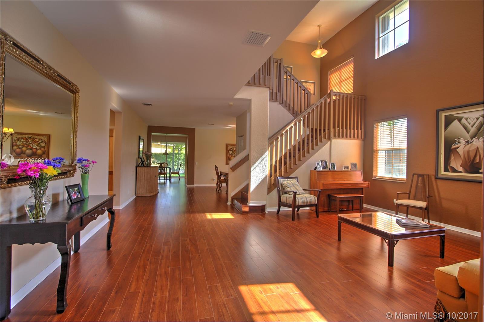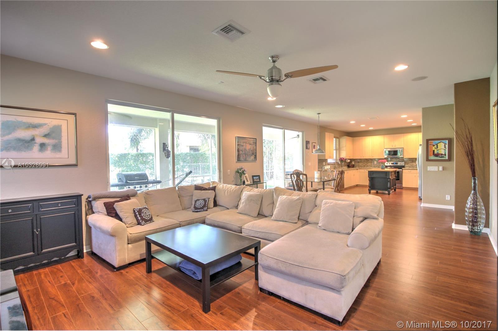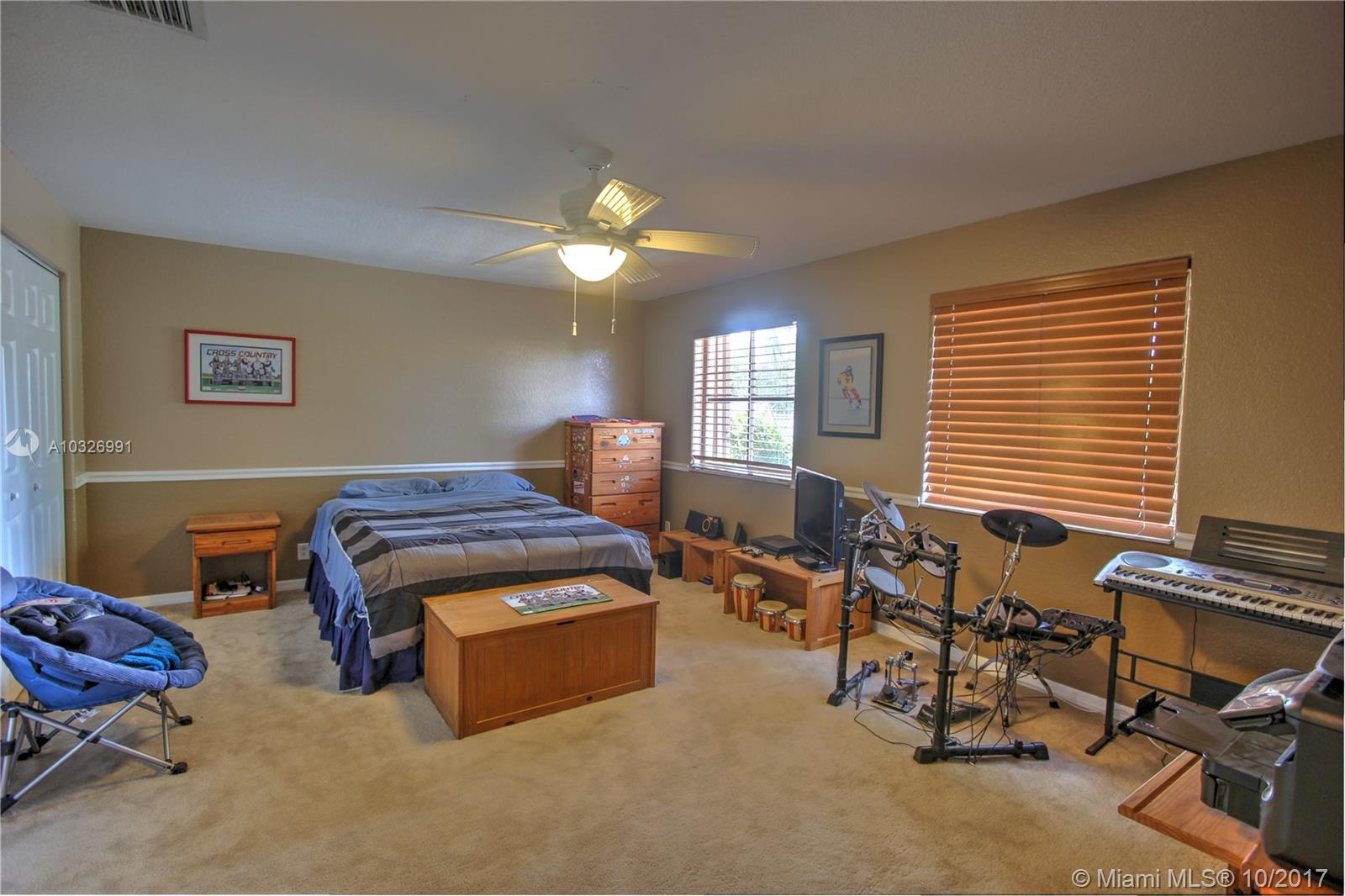 Enjoy living in this beautiful two story home of approx. 5000 total sqft. 6 bedrooms, 4 bathrooms, 42" wood cabinets, granite counter tops, newer top of the line SS appliances, wood floors, high ceilings, large kitchen & family room, lots of closet space, accordion shutters, 2 newer A/C, Cul-De-Sac oversize 10,000+sqft pie shape fenced lot, large covered screed patio with spa, lushly landscaped with plenty room for a pool. Located on a Resort Style gated community with clubhouse, 3 pools, mini-golf, waterpark, soccer and baseball field, basketball court and excellent school district. easy to show!!