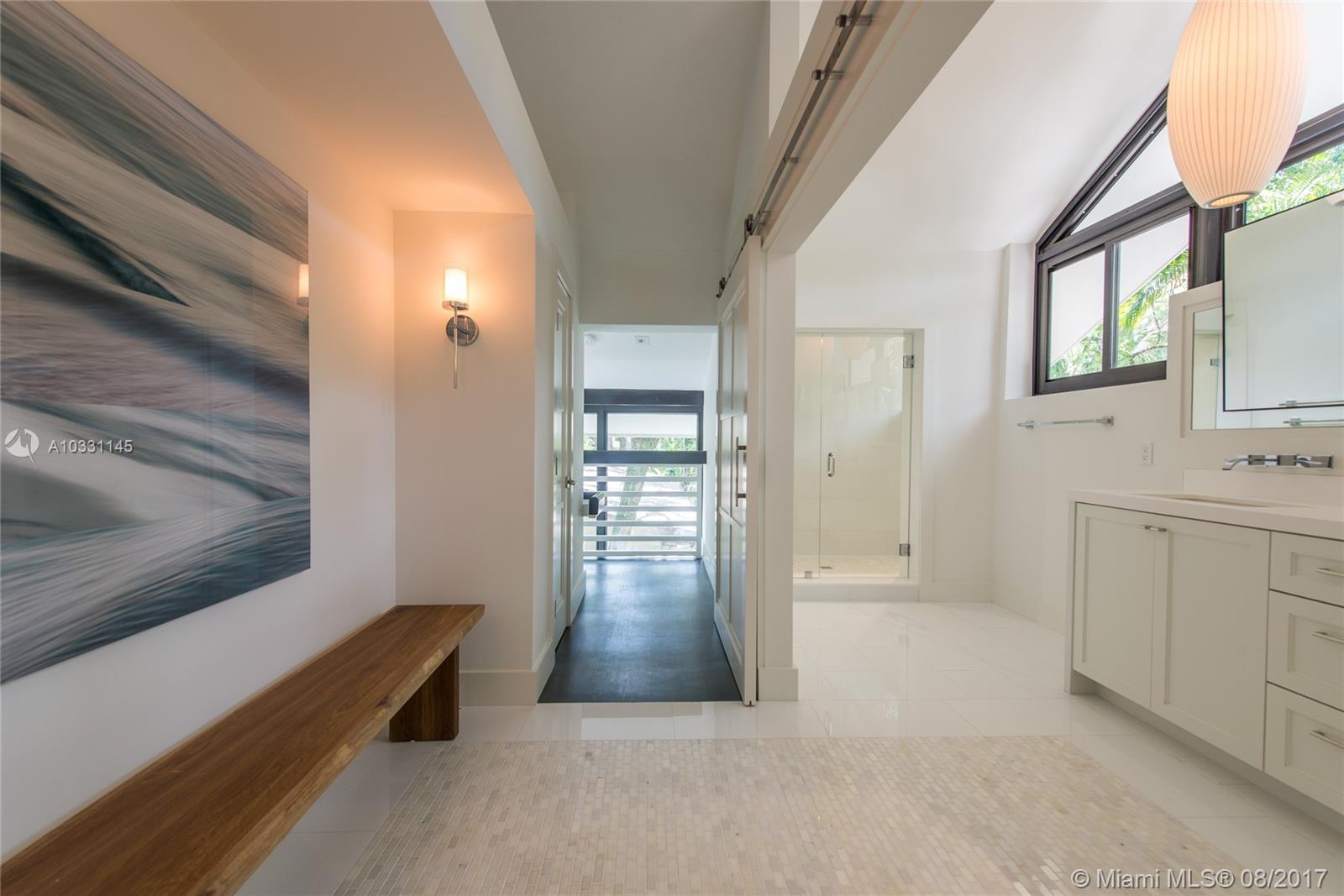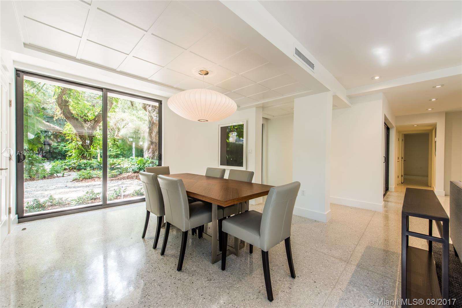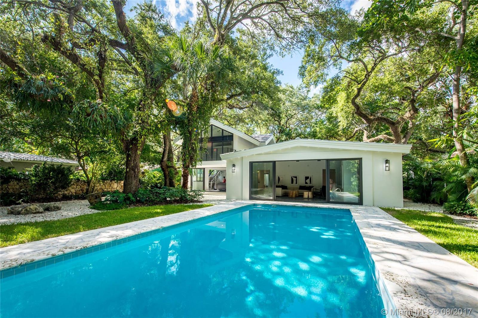 Lovely Mid-Century Modern home in prestigious South Coconut Grove. Set back on an oversized lot, surrounded by a lush garden w/ mature oak canopy. Total renovation just completed by renowned architect, Jorge Hernandez. Features include new Terrazzo & white oak floors, floating staircase and vaulted ceilings. Custom kitchen with Thermador appliances. Light filled living spaces with walls of glass overlook tropical pool & grounds. Stunning master suite with spa-like bath & terrace overlooking the treetops.