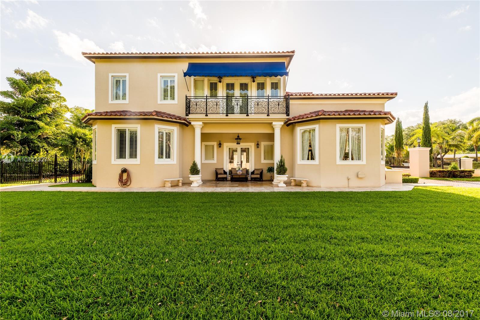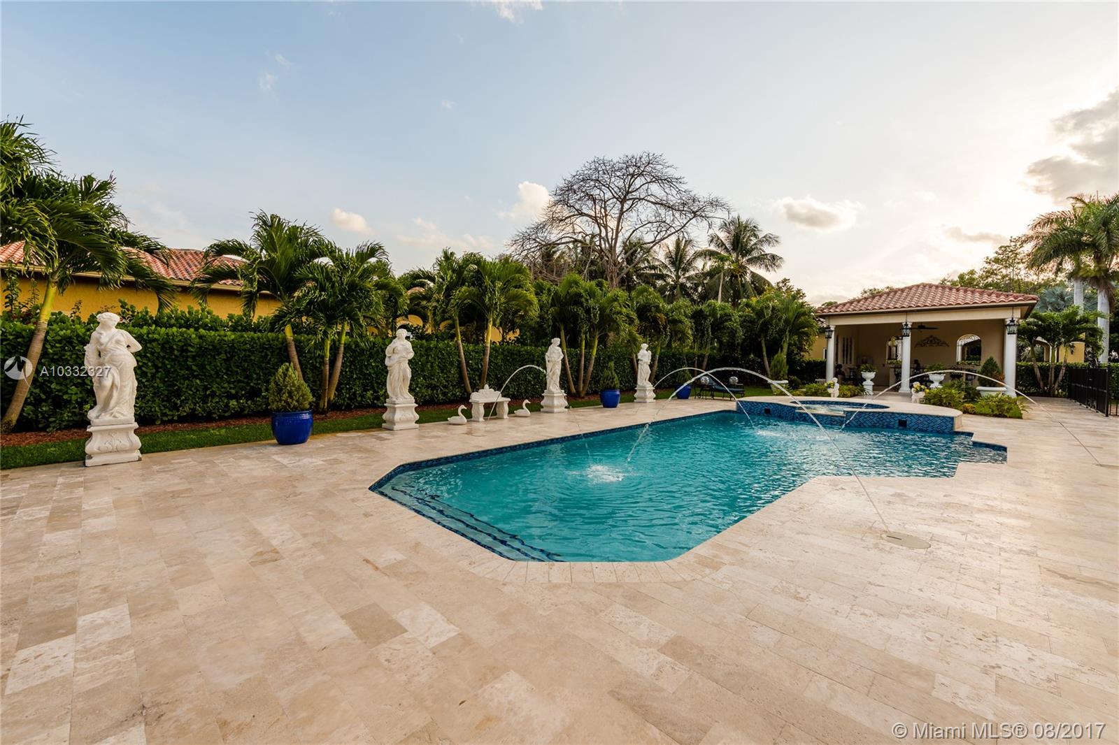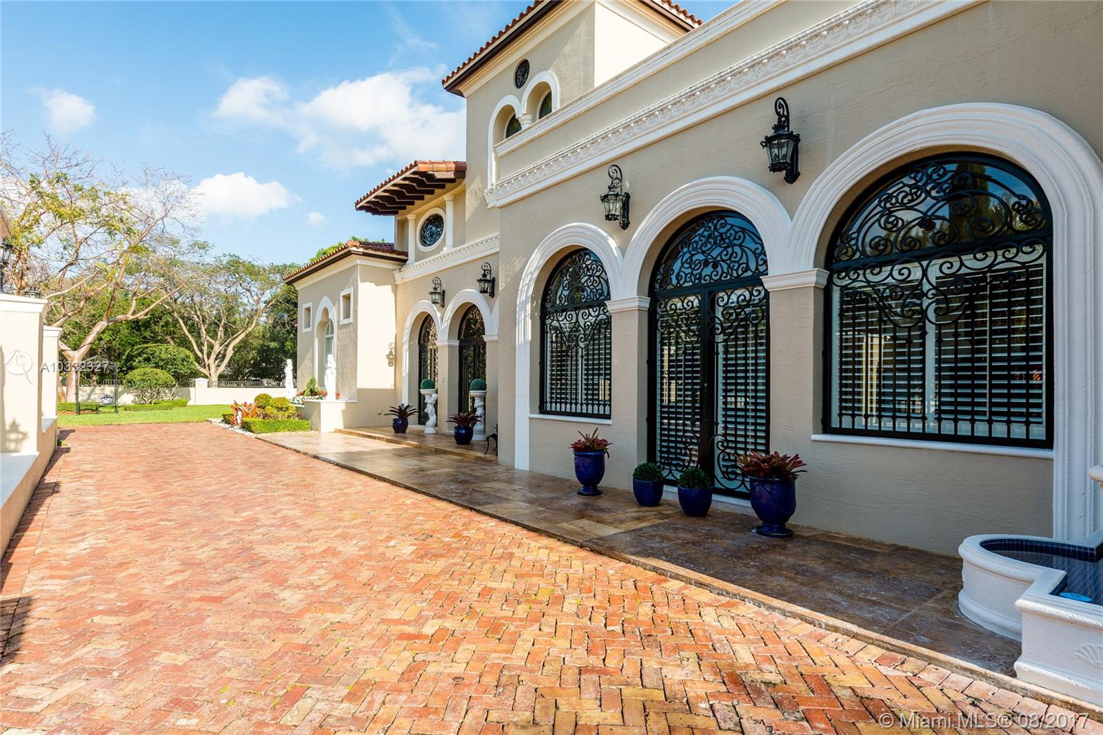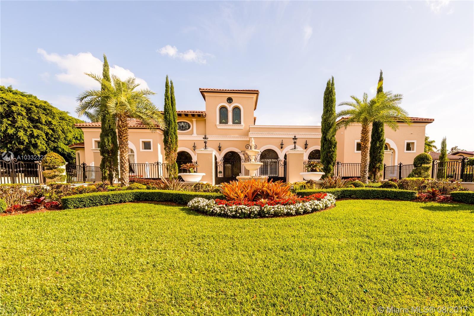 Elegant Mediterranean Estate. Situated on a pristine corner lot in N. Pinecrest. Upon entering this luxury estate, you will enjoy feature such as a exquisite flowing fountain, dramatic 2-story foyer & grand living room w/fireplace. This immaculate home features a open gourmet kit. w/top of the line appliances w/ breakfast area, cabinetry & granite counter tops, ornate crown moldings, coffered ceilings, summer kit., courtyard, large suite style bedrooms & grand master suite, marble & hardwood floors, balconies, large pool & spa, manicured grounds.