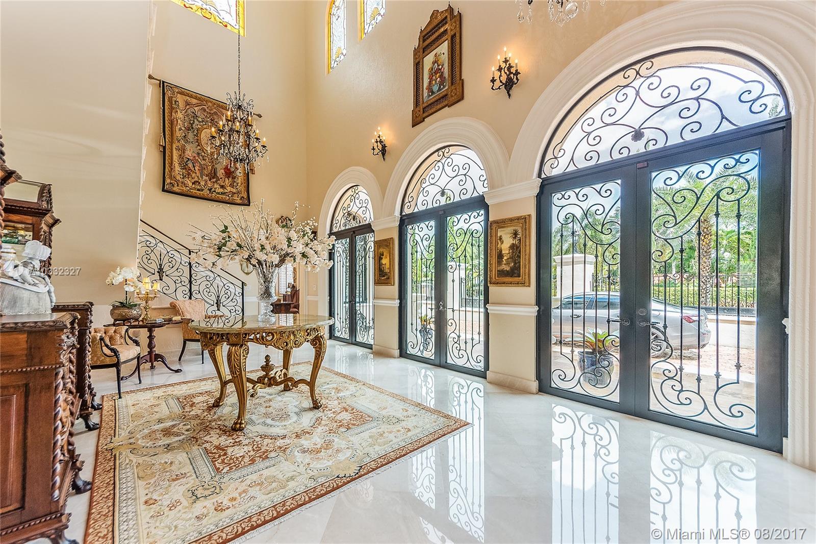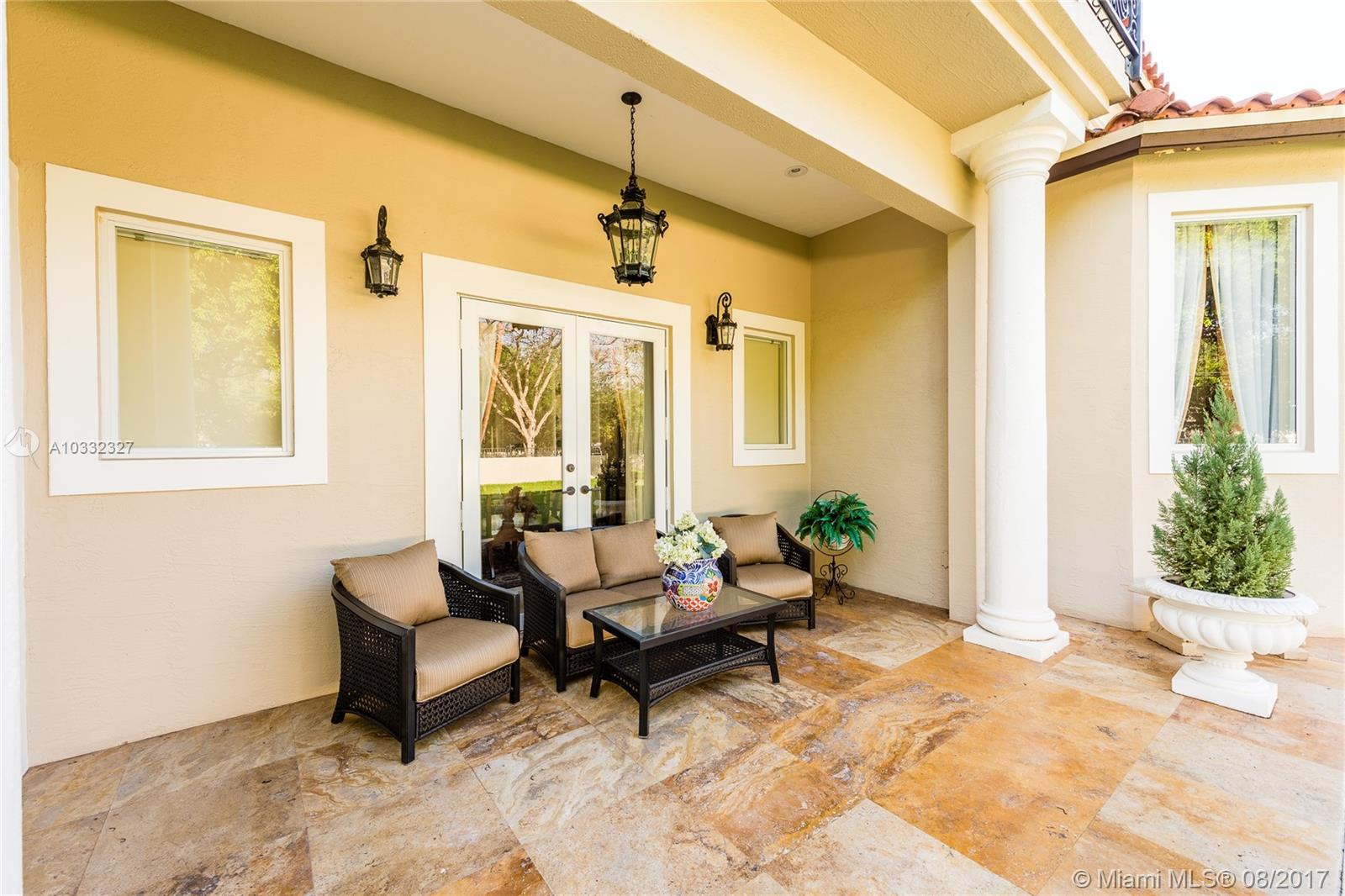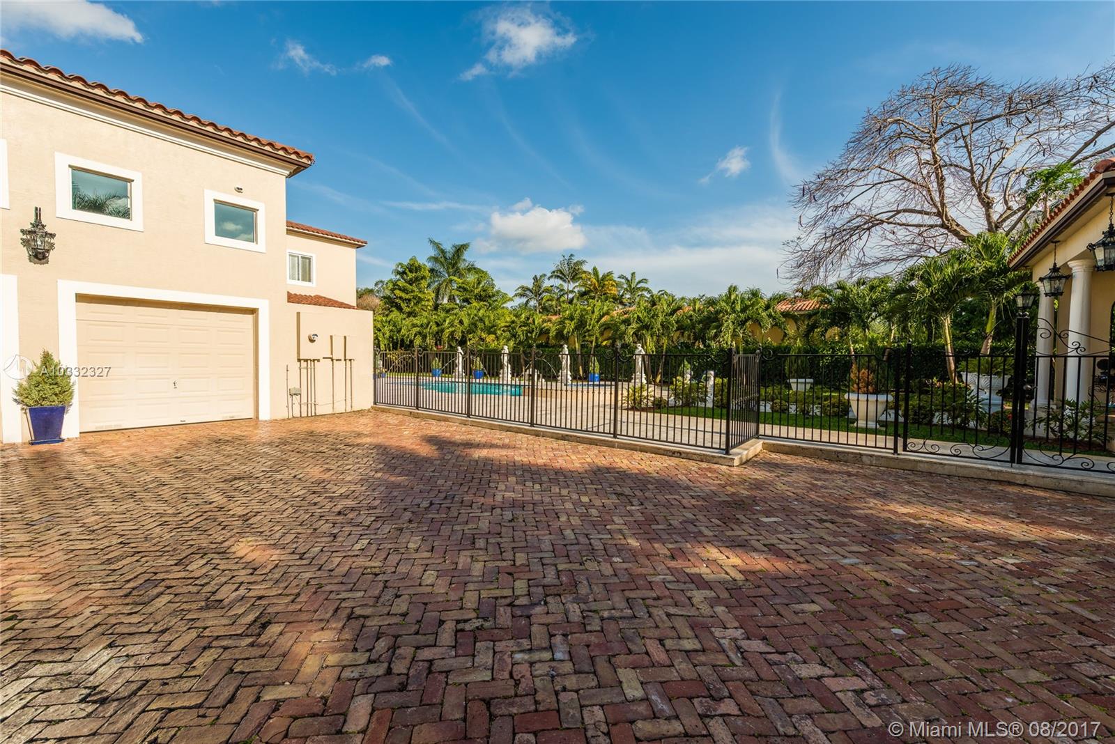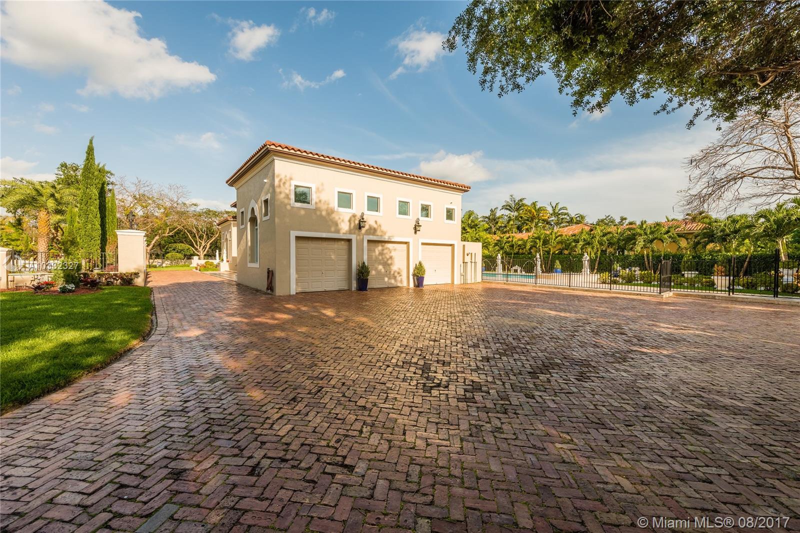 Elegant Mediterranean Estate. Situated on a pristine corner lot in N. Pinecrest. Upon entering this luxury estate, you will enjoy feature such as a exquisite flowing fountain, dramatic 2-story foyer & grand living room w/fireplace. This immaculate home features a open gourmet kit. w/top of the line appliances w/ breakfast area, cabinetry & granite counter tops, ornate crown moldings, coffered ceilings, summer kit., courtyard, large suite style bedrooms & grand master suite, marble & hardwood floors, balconies, large pool & spa, manicured grounds.