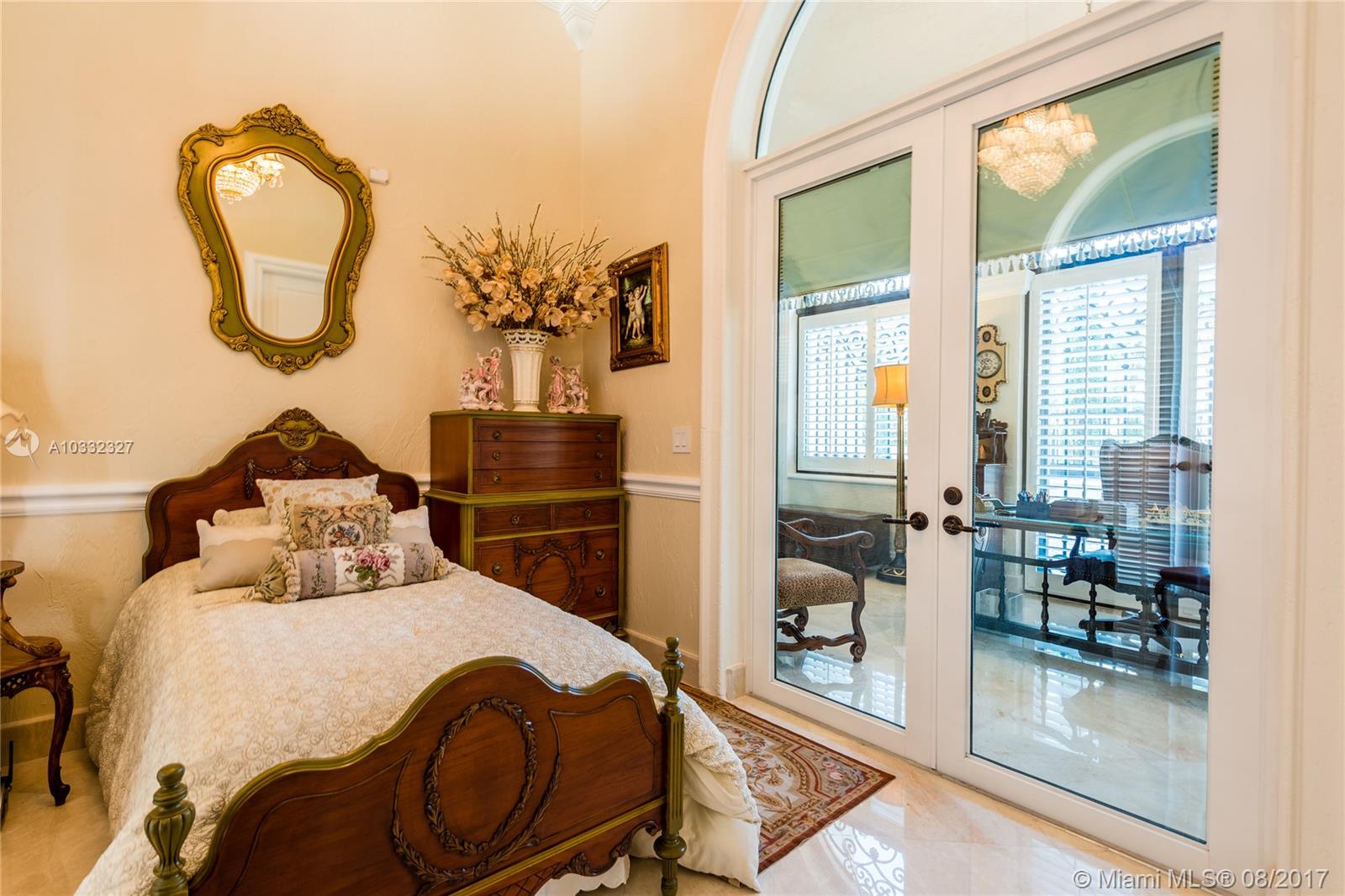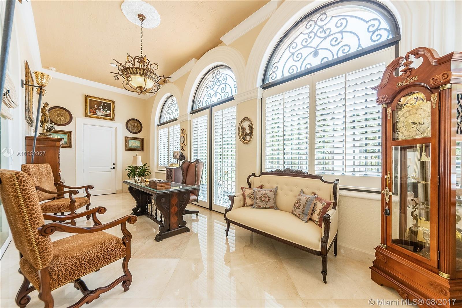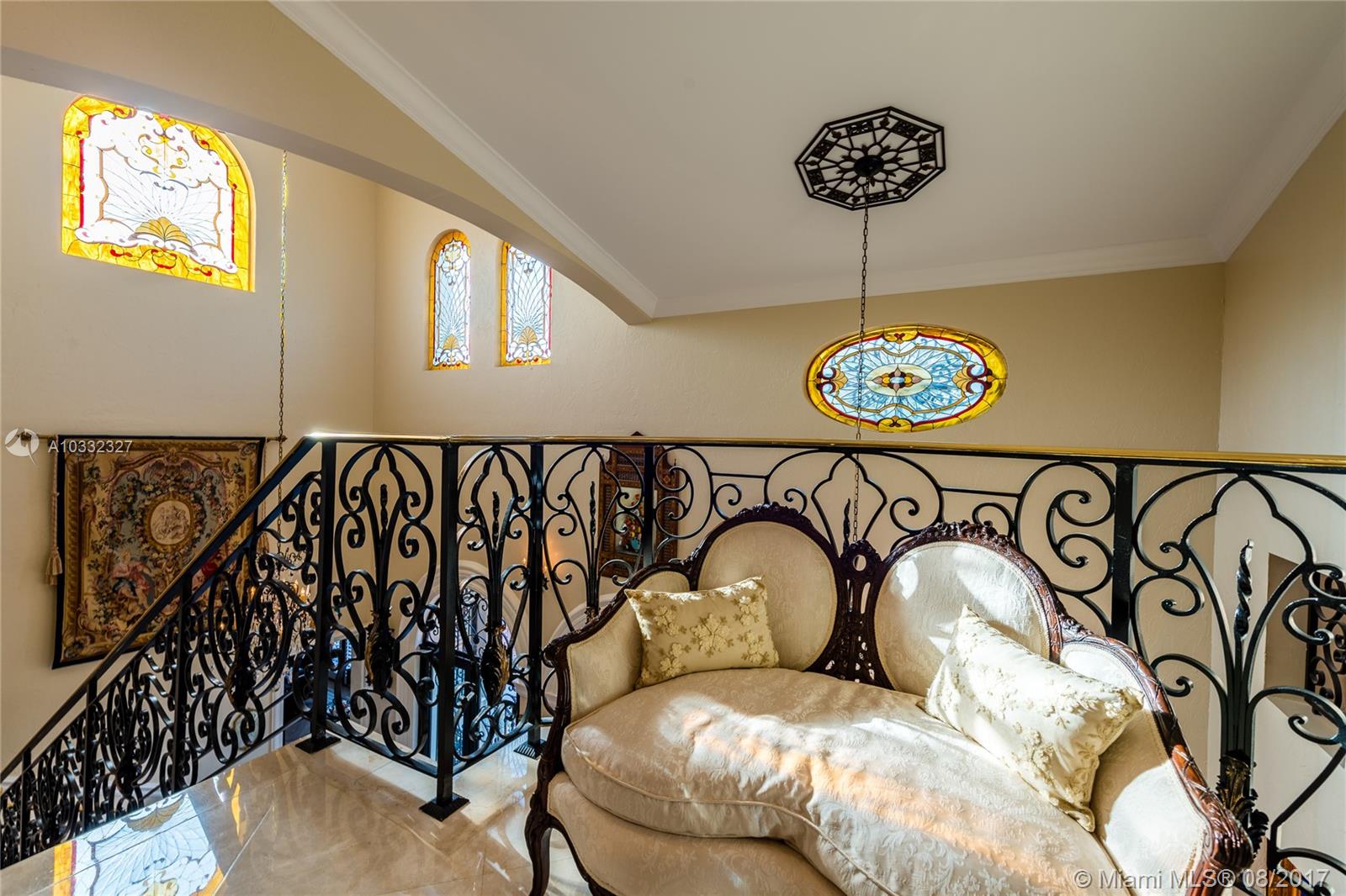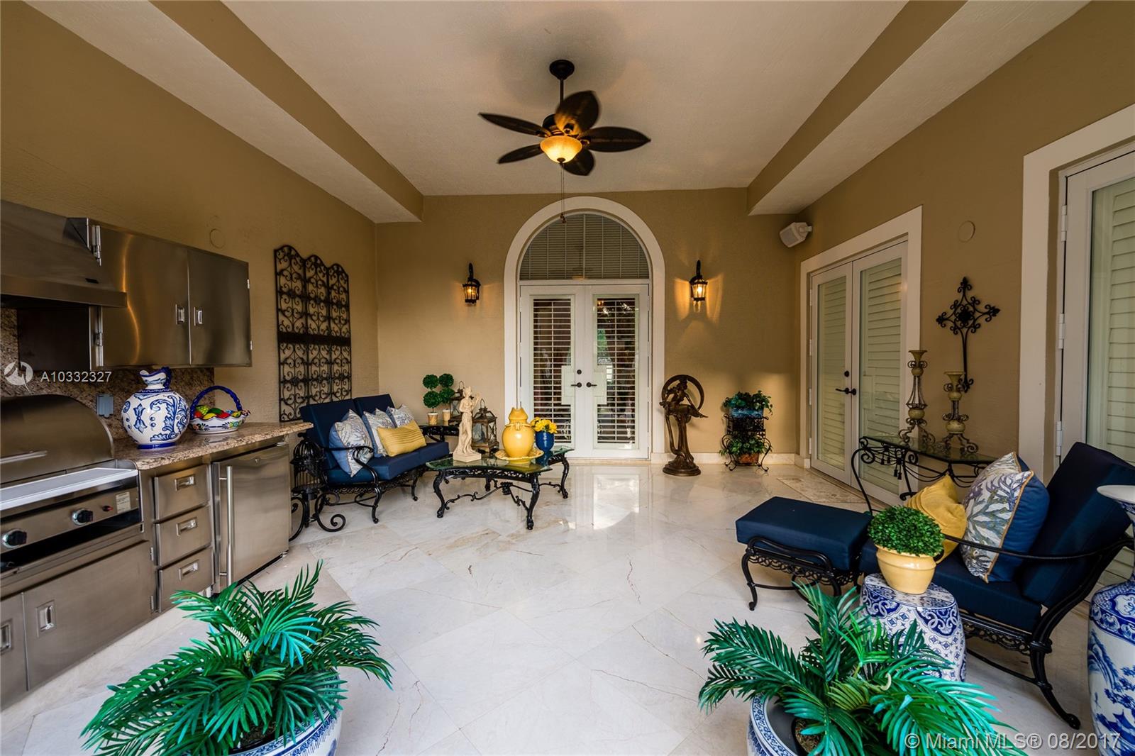 Elegant Mediterranean Estate. Situated on a pristine corner lot in N. Pinecrest. Upon entering this luxury estate, you will enjoy feature such as a exquisite flowing fountain, dramatic 2-story foyer & grand living room w/fireplace. This immaculate home features a open gourmet kit. w/top of the line appliances w/ breakfast area, cabinetry & granite counter tops, ornate crown moldings, coffered ceilings, summer kit., courtyard, large suite style bedrooms & grand master suite, marble & hardwood floors, balconies, large pool & spa, manicured grounds.