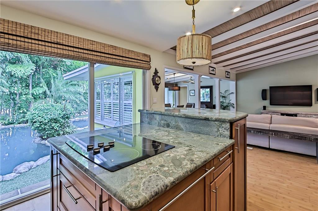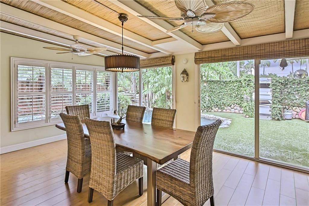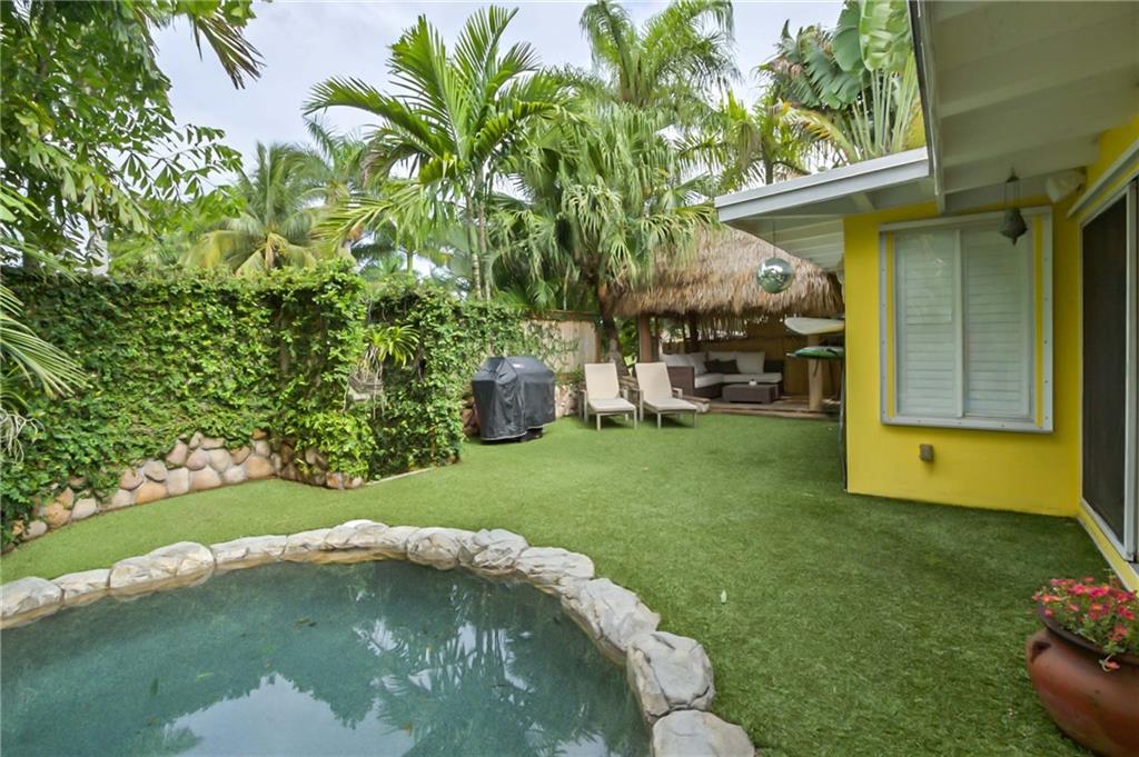 Beautifully updated waterfront home featuring 2 bedrooms plus den in main home plus separate 1 bed/office. Open living area offers high ceilings, wood floors, & is ideal for entertaining w/open kitchen including stainless steel appliances & incredible views of your lush tropical backyard. Spacious master closet & bath with two sinks, separate shower & tub. Low maintenance artificial turf & no fixed bridges. Relax under the Tiki Hut watching the game or jump in the heated pool after a long day on the boat!