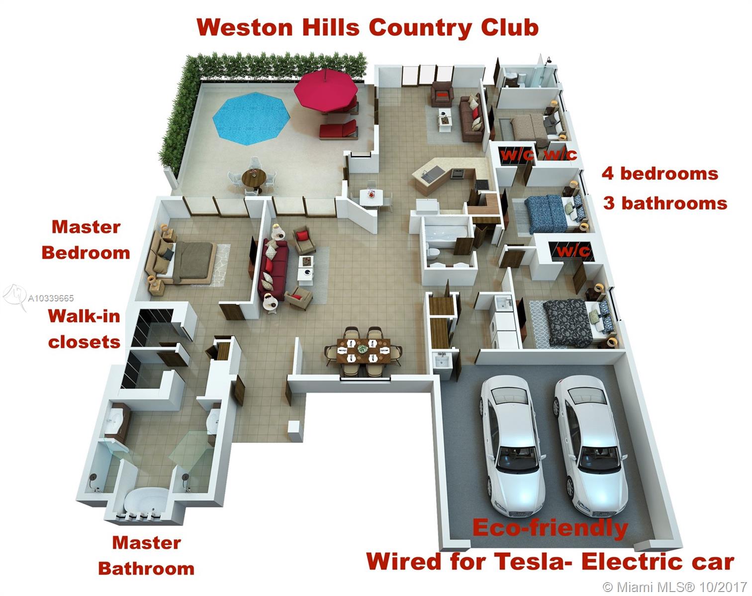 Spectacular home located in Weston Hills Country Club. Original Owner. Totally upgraded,(upgrades value 115K). Enjoy the exquisite & desired open-concept floor plan. Tons of natural sunlight. 4 beds, 3 baths, 2 car garage +2car-driveway, lush-landscaping, a huge screened &relaxing Pool. Fab. gourmet Kitchen w/SS Appliances, solid wood cabinets, granite counters & backsplash, breakfast area, great family room, modern & expansive dining & living areas, expensive Silhouette window treatments throughout, Master suite w/walk-in closets, upgraded baths, crown molding, wood & marble floors, Landmark-built. Wired for Tesla- Electric car. Close to restaurants. Top A+rated schools. Peaceful & pet friendly community . 24 HRS GATED COMMUNITY!. A MUST SEE !!! PRICE TO SELL. HOA FEES $157 MONTHLY.