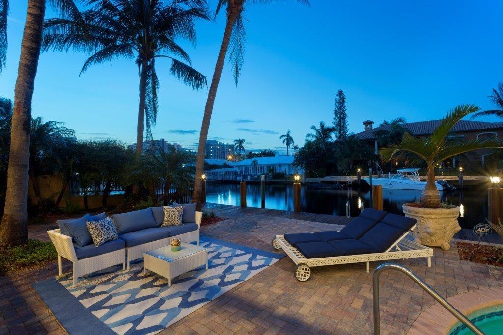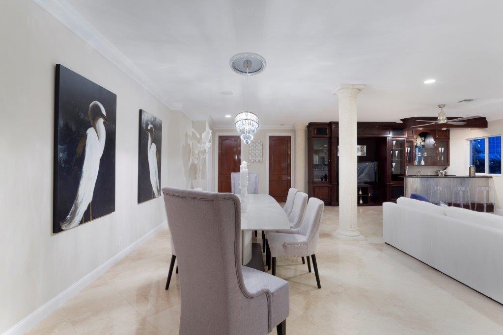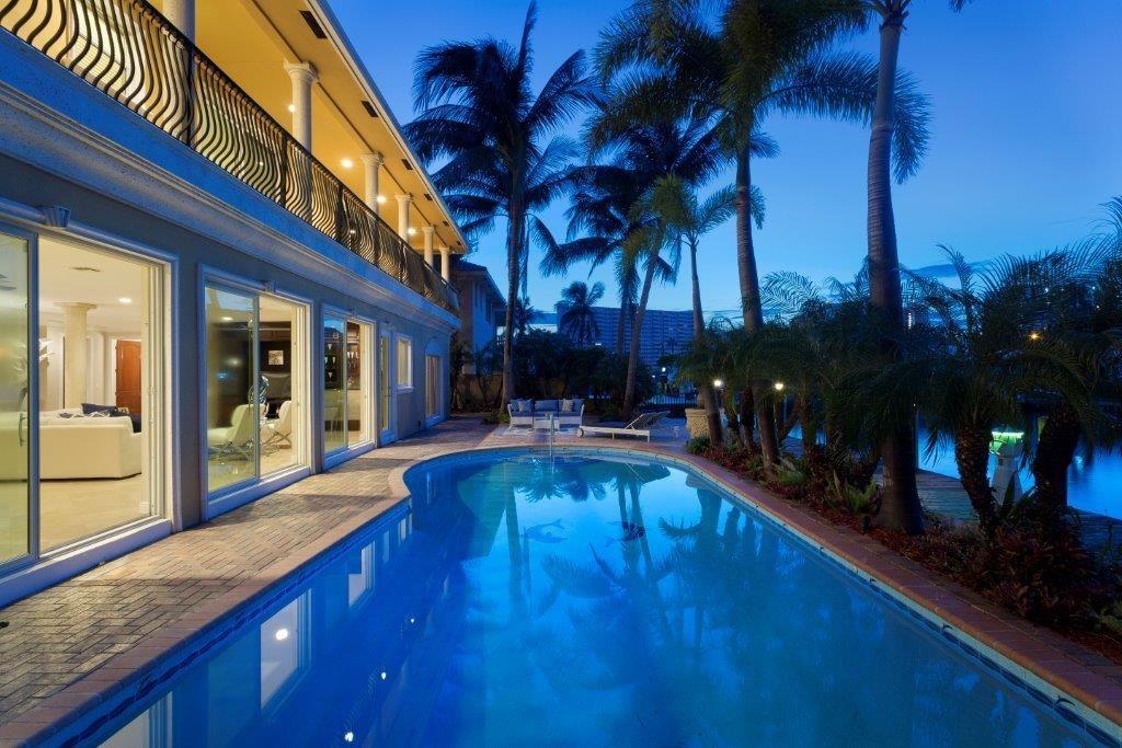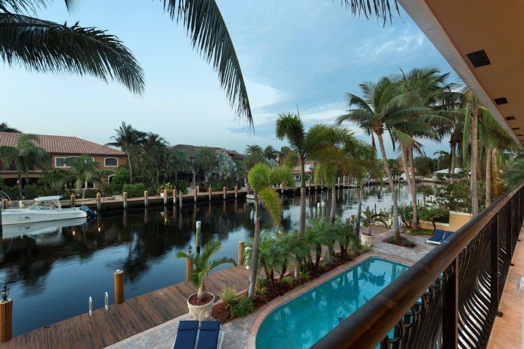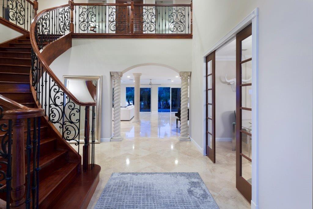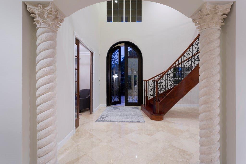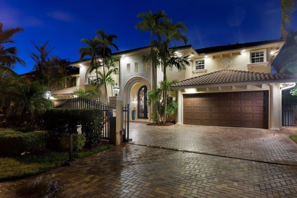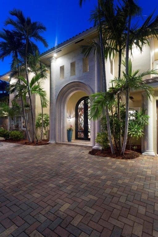 Looking south on 100+/- feet of deep-draft waterfront, this gated Modern Mediterranean estate is outfitted with full-length yacht dockage. The palm-studded grounds feature a full-length waterside terrace that surrounds the sun-splashed saltwater pool as a beautiful outdoor entertainment space, served by a full cabana bath. Two gated entries give way to the property's tropically landscaped motor court leading to the formal entry and garages on either side, with a total of four bays.
