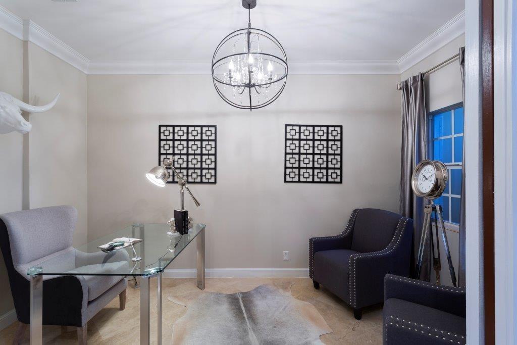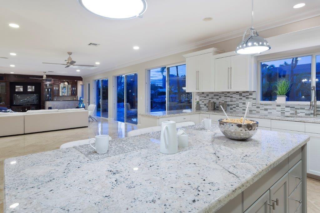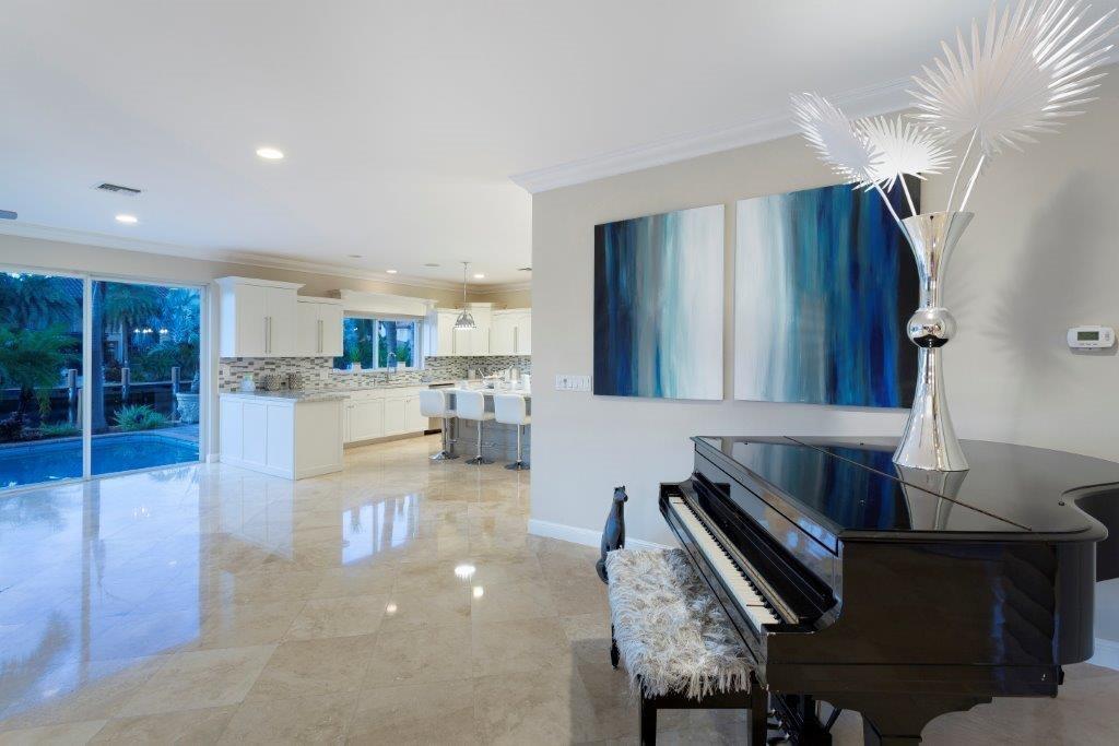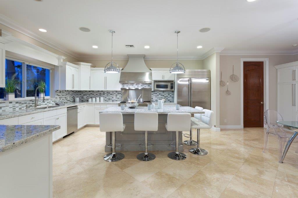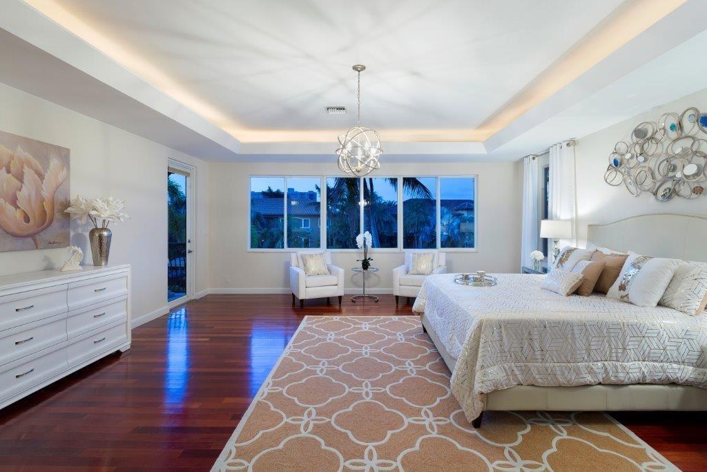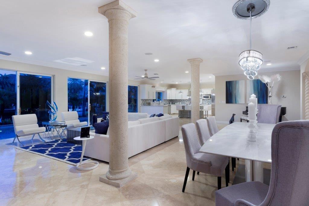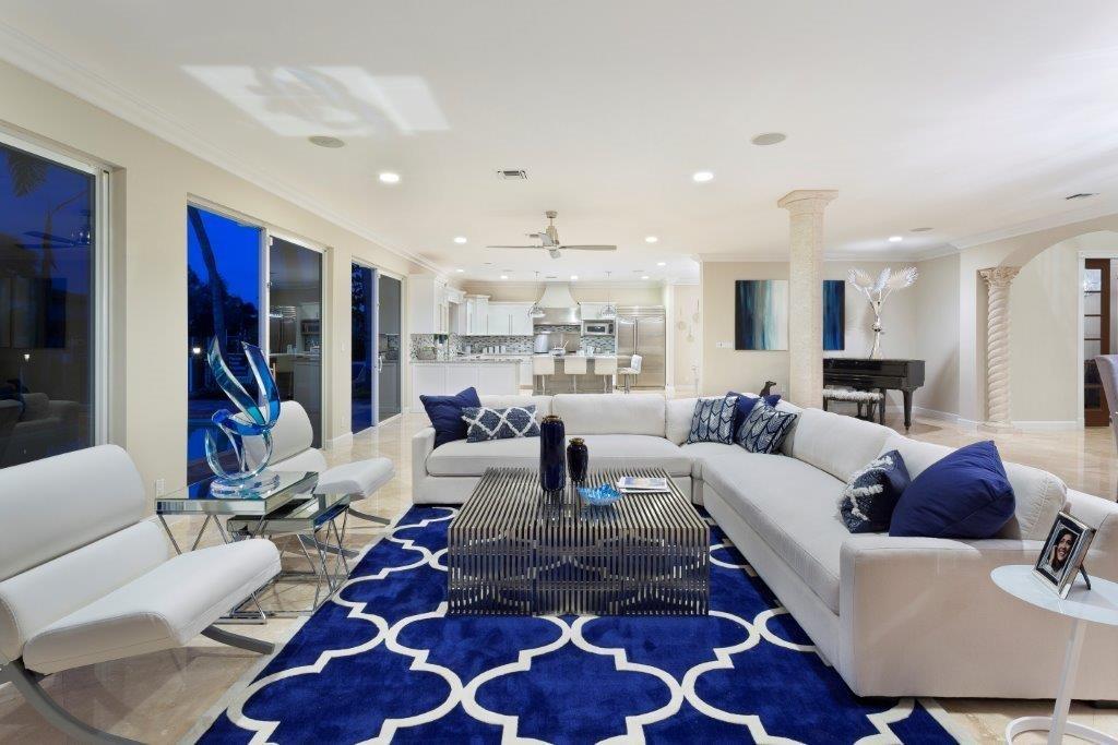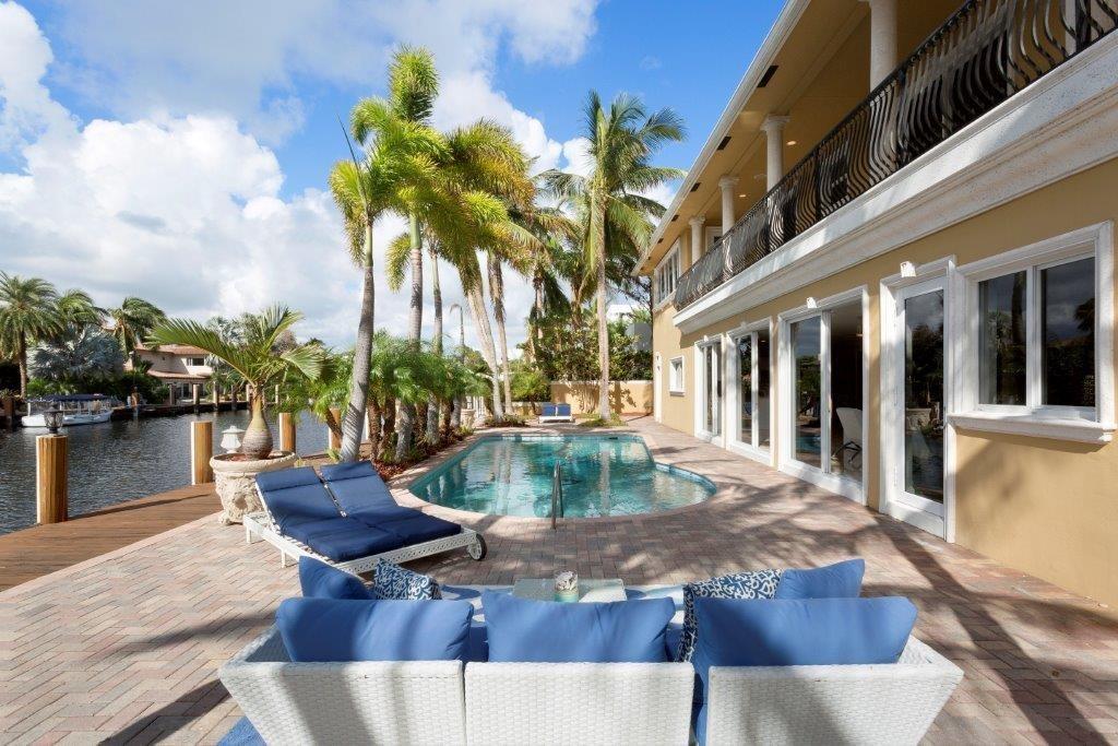 Looking south on 100+/- feet of deep-draft waterfront, this gated Modern Mediterranean estate is outfitted with full-length yacht dockage. The palm-studded grounds feature a full-length waterside terrace that surrounds the sun-splashed saltwater pool as a beautiful outdoor entertainment space, served by a full cabana bath. Two gated entries give way to the property's tropically landscaped motor court leading to the formal entry and garages on either side, with a total of four bays.