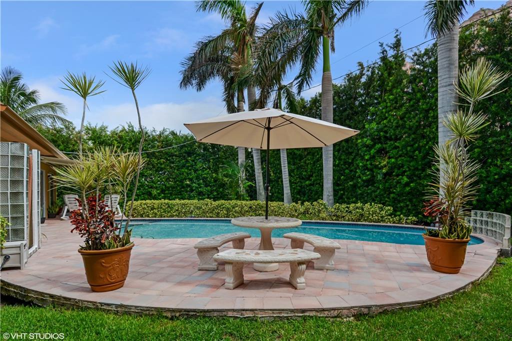 Classic Florida ranch renovated to perfection! New barrel tile roof in 2013. Beautiful kitchen w/granite counters & stainless appliances. Spacious master suite w/walk-in closet, built-ins & marble bath w/large shower. Incredible yard. 20x40 pool. Heated spa/tub. Outdoor shower. 2 Patios. Electronic awning. Magnificent 35' privacy hedges. 3rd BR now a den open to living area. Owner will re-convert to 3rd BR upon full price offer. 5 minute walk to the beach. Private access to Birch park. Best neighborhood!
