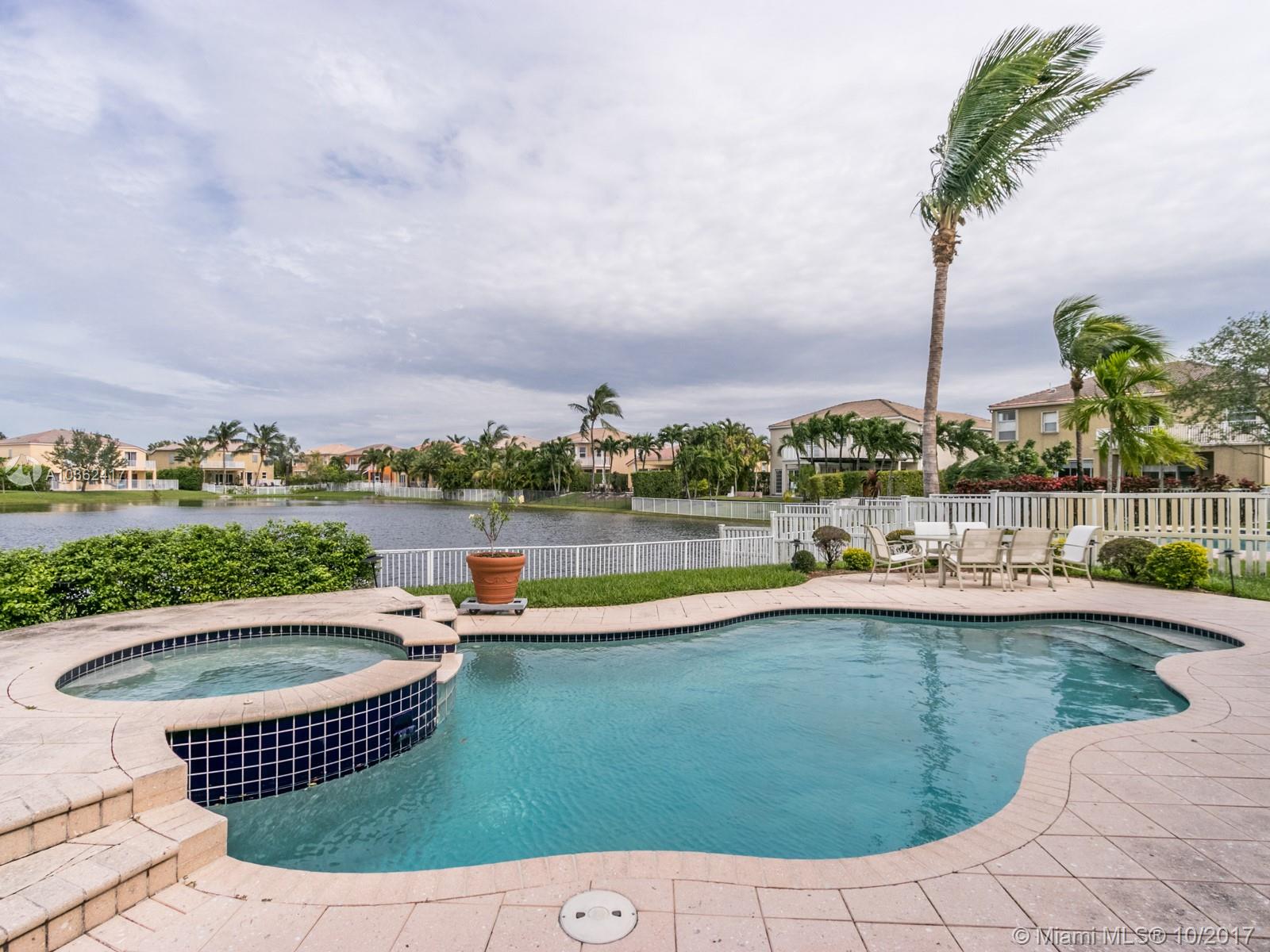 Gorgeous home located on a cul-de-sac in the prestigious Portofino at Riviera Isles. Enjoy the fabulous outdoor oasis from the pool or spa, with stunning lake view. Beautiful kitchen with granite counter tops, wood cabinets, large island, pantry and a lot of storage. Great open floor plan, with amazing French doors in family room and living room. Formal dining room and beautiful media/office room. Garage with built-ins all around and work bench. Huge master bedroom with spectacular walk-in closet and balcony overlooking the lake. Surround sound system, CAT5 wiring throughout entire house. Resort style amenities.