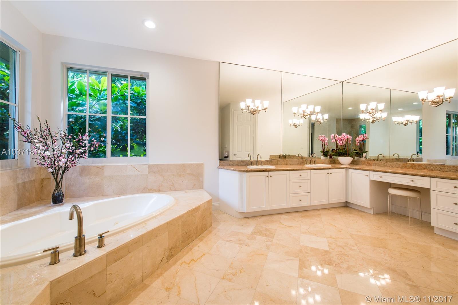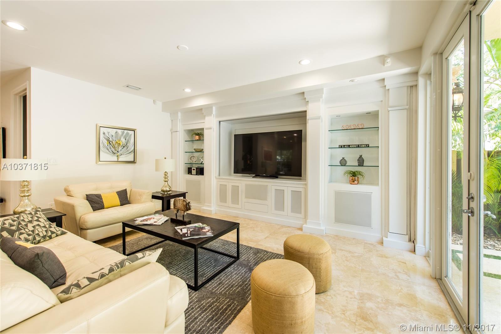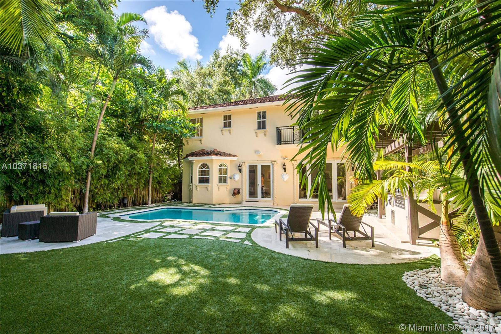 Lovely European-inspired home on a quiet, winding street in lush South Coconut Grove. A blend of classic and contemporary architectural features with light-filled living spaces that overlook the expansive garden with built-in grill area & pool. Custom kitchen with white wood cabinetry, granite countertops, stainless appliances and center island with seating. Double-height ceilings and clerestory windows in the formal living & dining room. Oversized master suite with sitting area and private balcony overlooking the tree-tops. Luxurious marble master bath with spa-tub & glass enclosed shower. Walk to the Grove village center’s galleries, boutiques, cafes and bayfront parks & marinas. Close to downtown, MIA, Coral Gables and the Beaches.