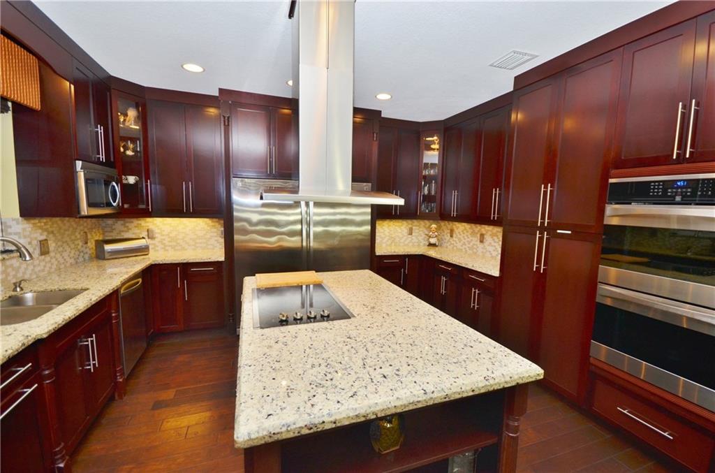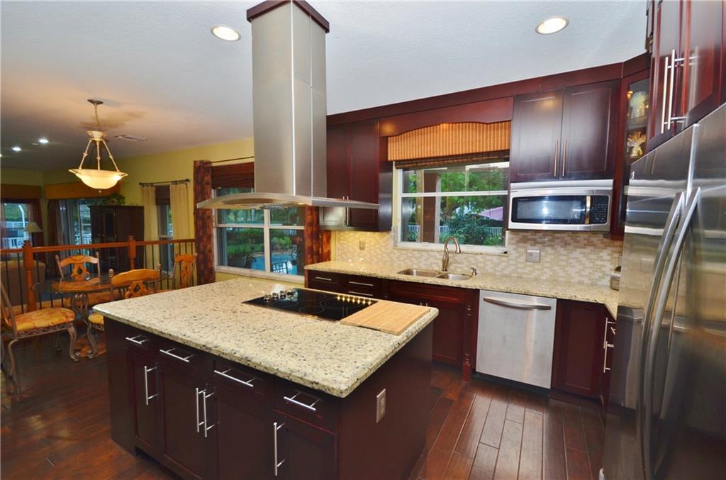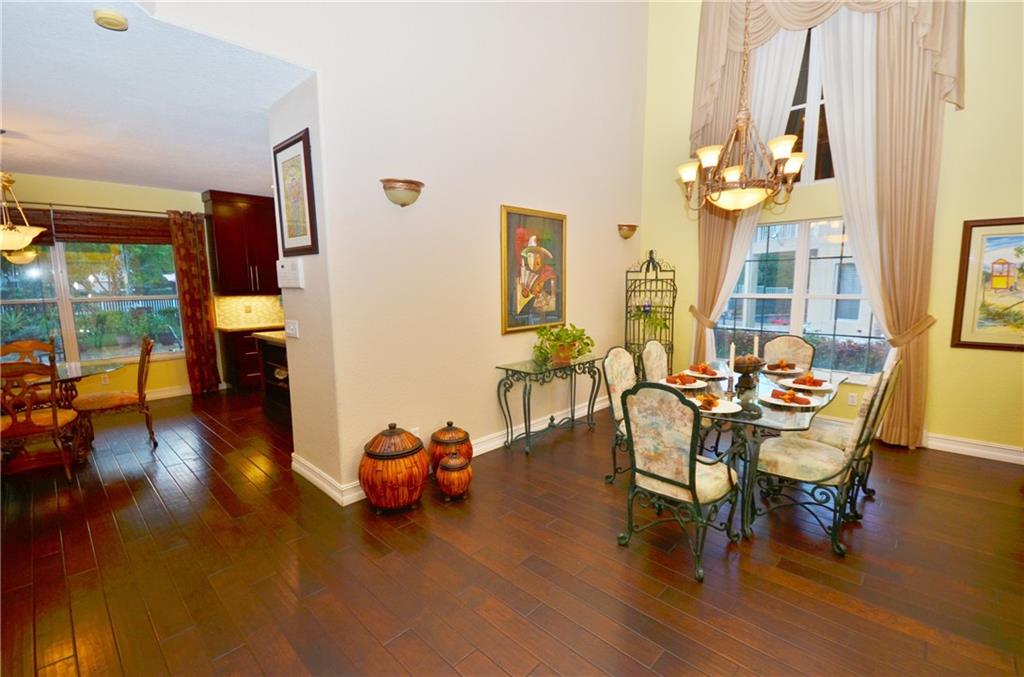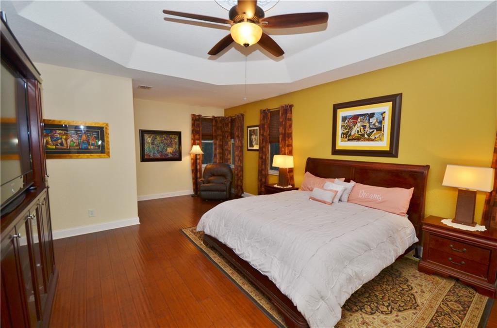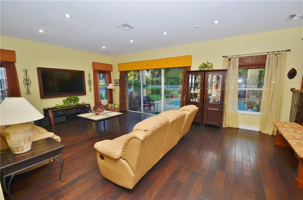 Wow!! Enter this expansive 5 bedrooms+ 6th for den or bedroom, full bath nearby, & 2 full sized master suites, with endless possibilities! From the gorgeous REAL WOOD flooring throughout, stunning totally renovated kitchen, with virtually every possible feature, upgraded baths & a grand wrought iron staircase. Custom closets in most bedrooms, recessed lighting, & epoxy garage floor, are only a few features. Travertine Patio & inviting pool & huge yard, & even accordion shutters! Guard gated & Rec Center