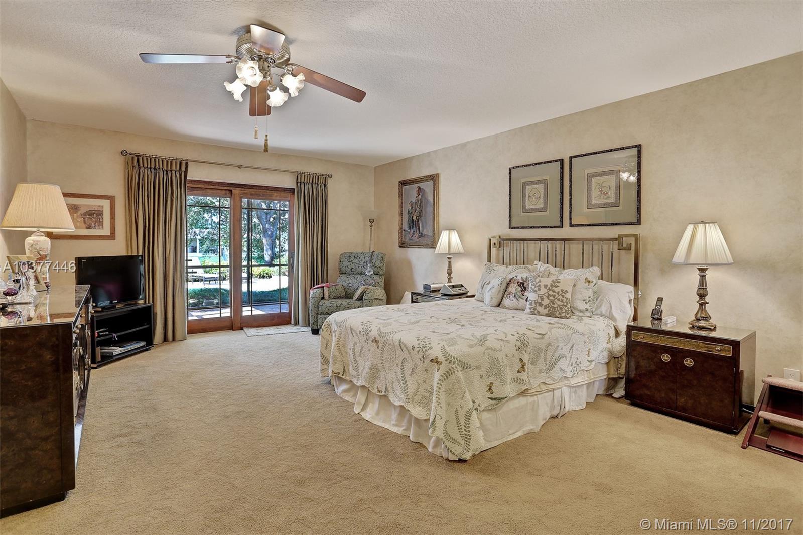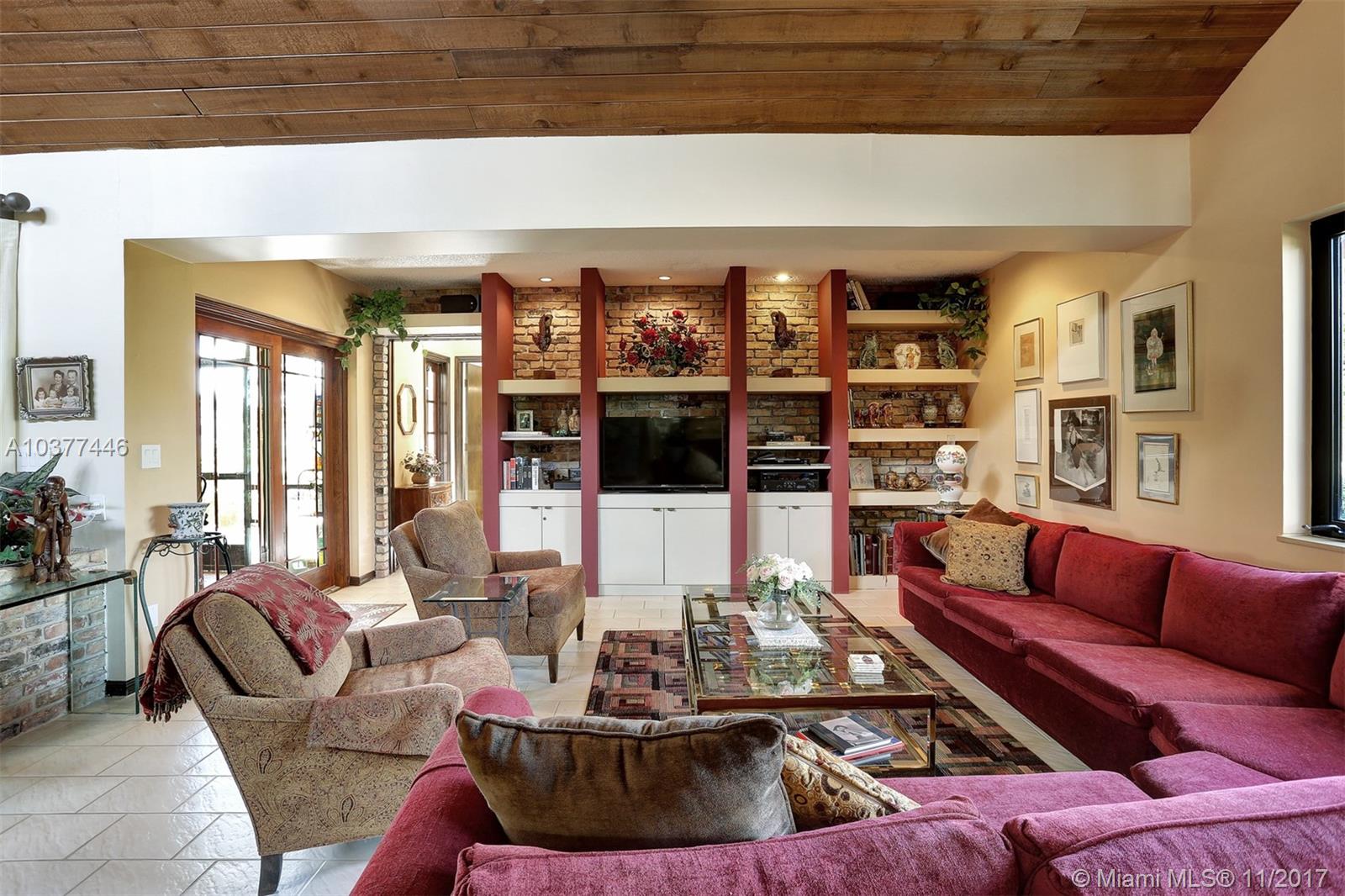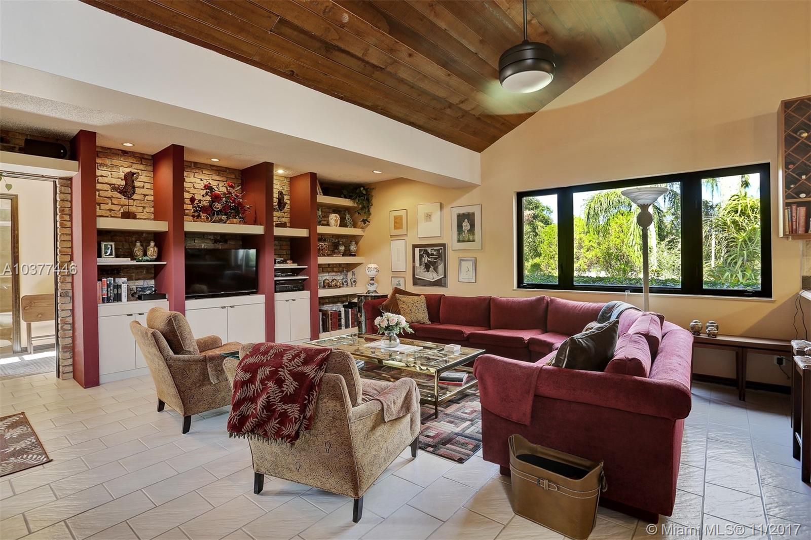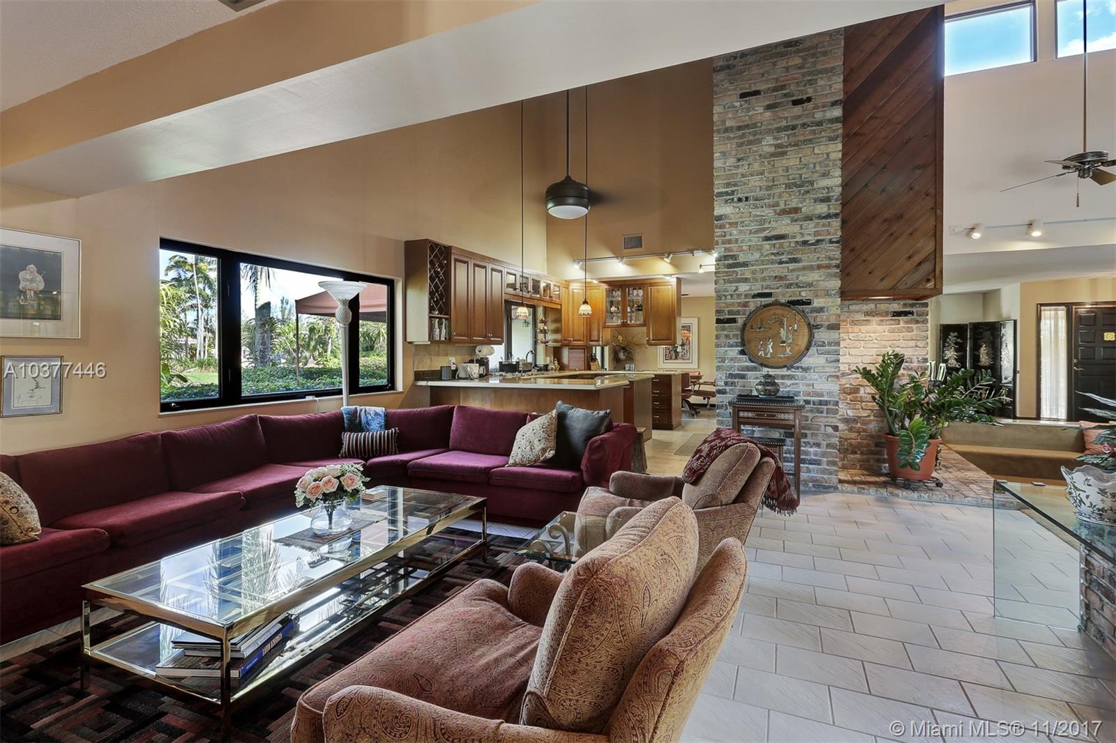 An architectural beauty! This waterfront pool home sits on a tranquil lake with breathtaking views. The lot is a builder's acre, the minute you walk in, you are greeted with 18 ft' soaring cedar ceilings , natural lights, lake views and a wonderful open floor plan. Living room features a sunken fireplace area with Old Chicago bricks accent, remodeled kitchen with silestone countertops. Large Master bedroom with a dressing area, gorgeous remodeled Master bath with a large walk in shower and floor to ceiling windows overlooking an atrium .Private mother-in-law wing with bath and cabana pool door. 80% hurricane windows. Central vac system. Two central air units.Stamped concrete front circle driveway and side driveway to garage. Fantastic 2 level patio area with amazing lakeviews!