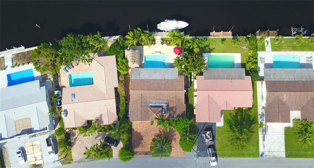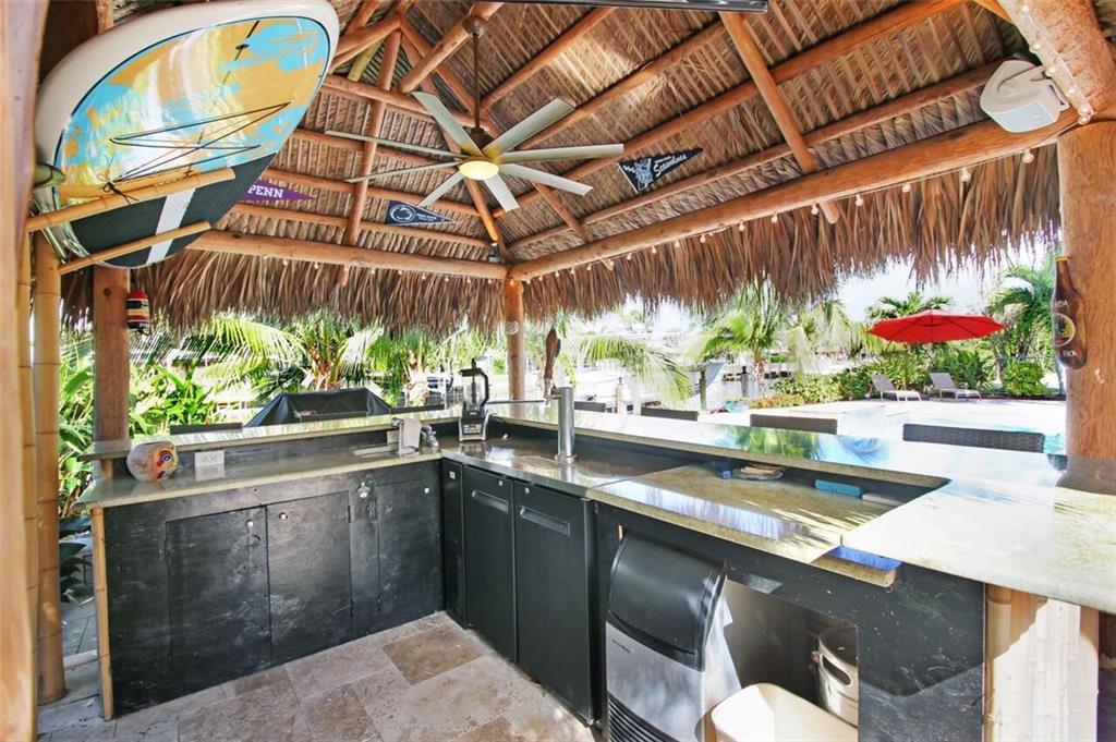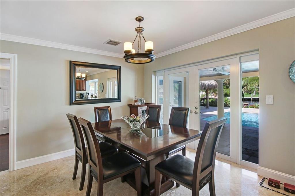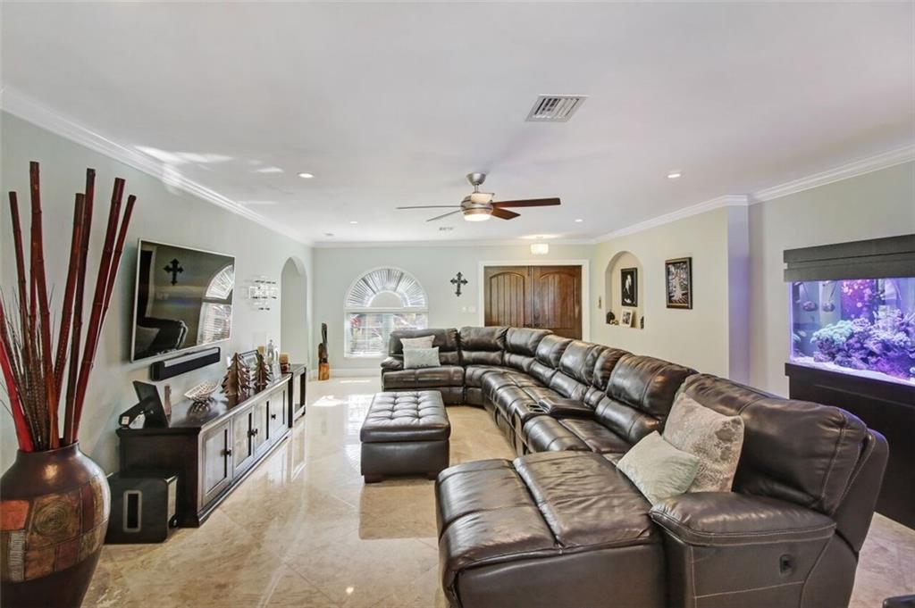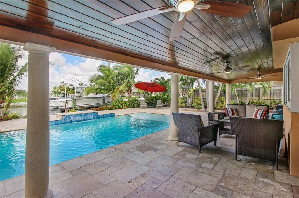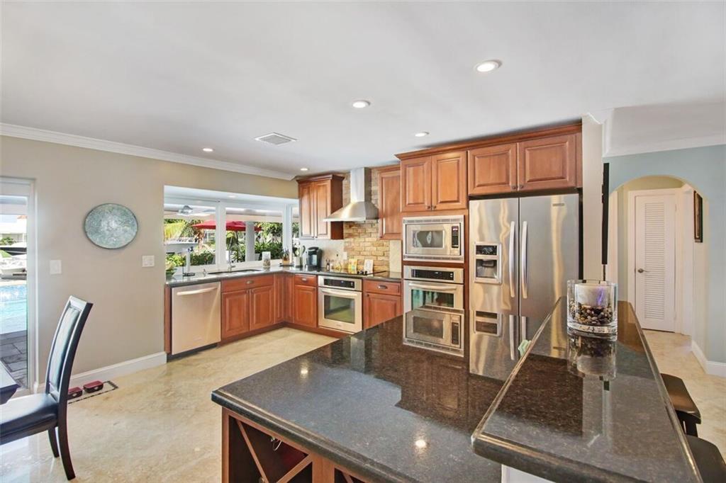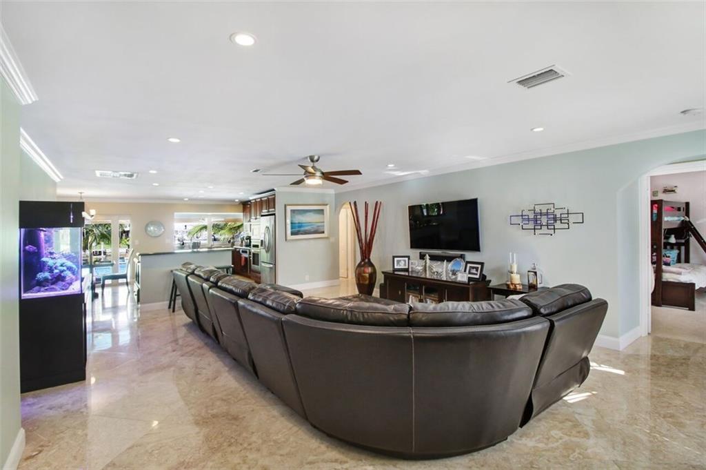Entertainer's dream house! Stunning, completely upgraded waterfront masterpiece. Property was remodeled 5 years ago. SF added w/permits. Home boasts impact windows & doors,wood & marble flooring,crown molding,bonus office/sitting area off master,open kitchen w/custom cabinetry,granite,s.s. Kitchen Aid appliances,contemporary fixtures & quartz tops in bathrooms & much more! Scenic outdoor area featuring water views of extra wide canal,75' of WF,boat lift,salt pool,tiki bar & french-laid travertine deck.