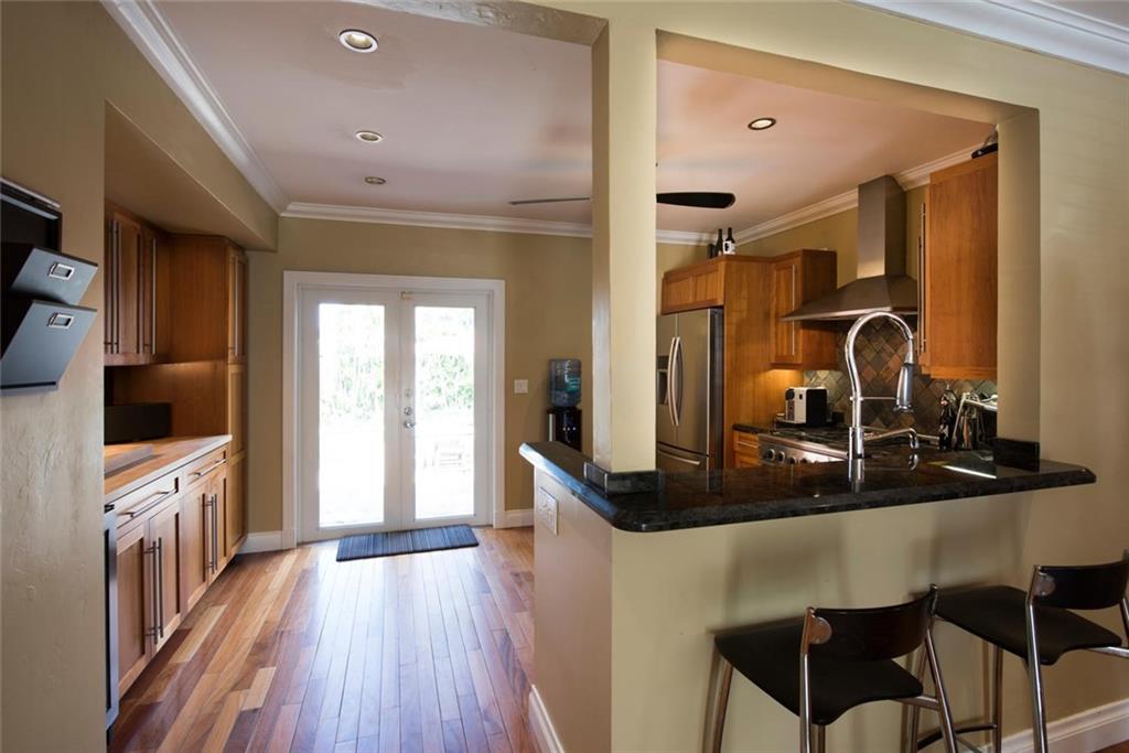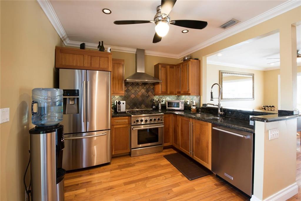 Quality Renovations in this immaculate home! New plumbing and electric, impact windows & French doors, barrel tile strapped roof, natural gas for stove & water heater. Stunning Brazilian chestnut wood floors, crown molding, European kitchen w/butcher blk & granite.Top of the line stainless appliances!Newer Mstr addition w/lg. walk in closet,German fixtures in mstr bath w/sep- shwr & spa tub. Heated Saltwater pl/w/waterfall! Security sys w/cameras. Nest Ac system & tropical landscaping.