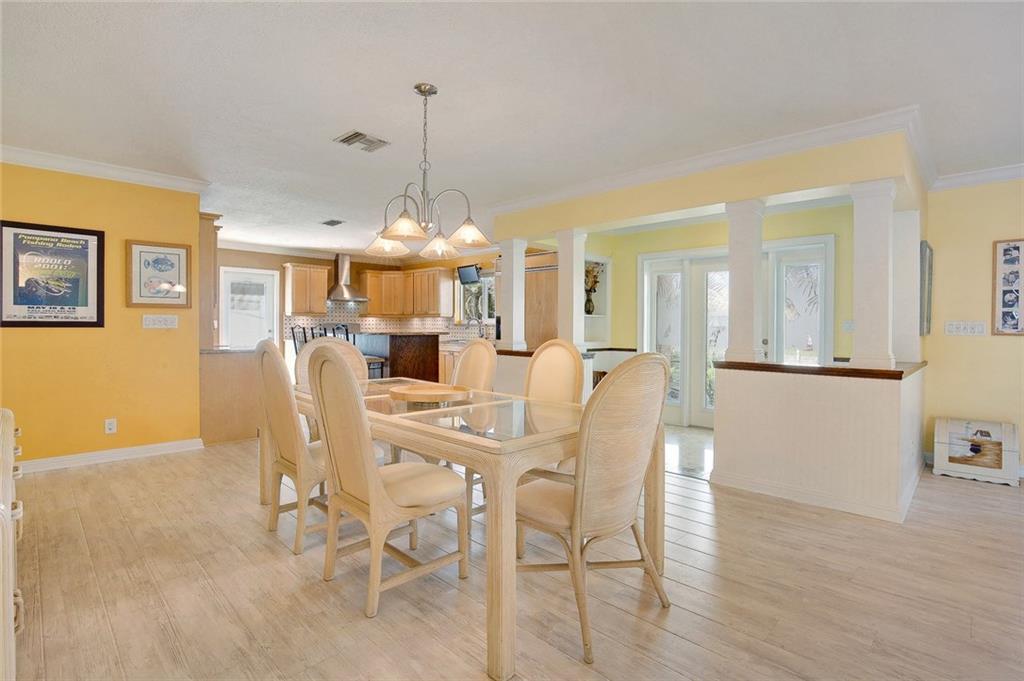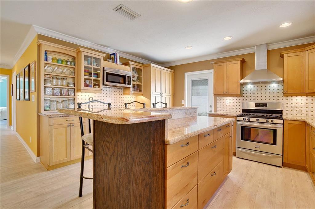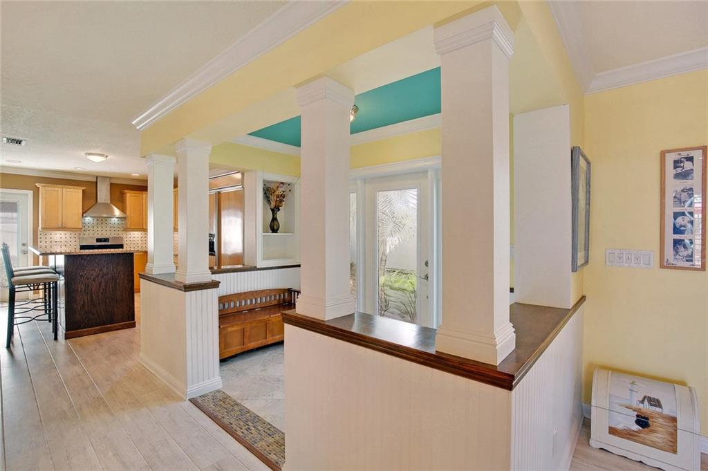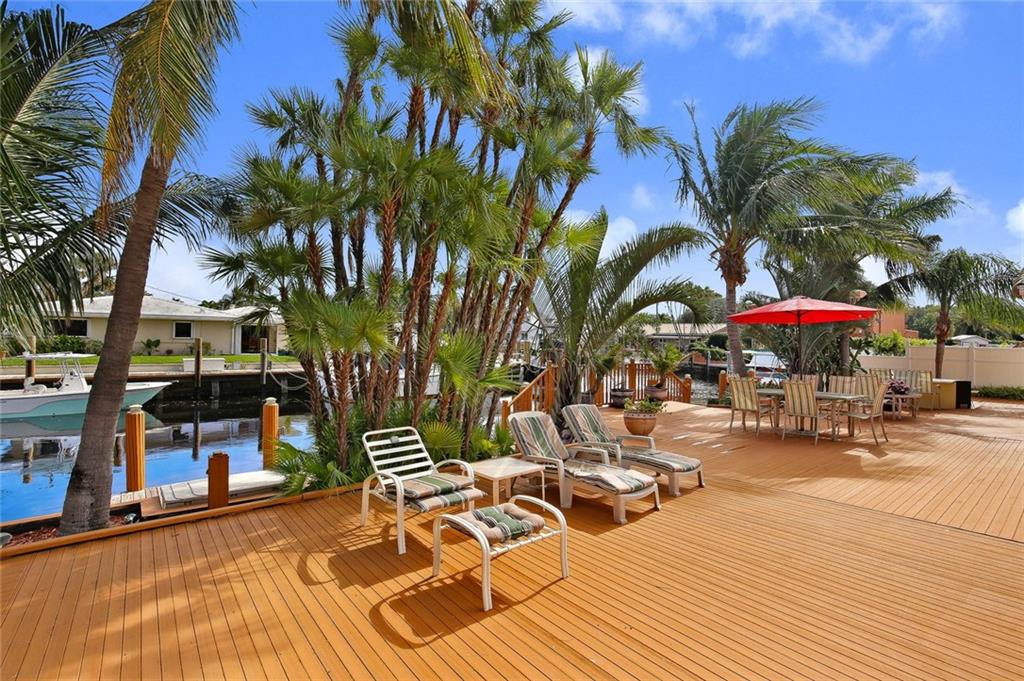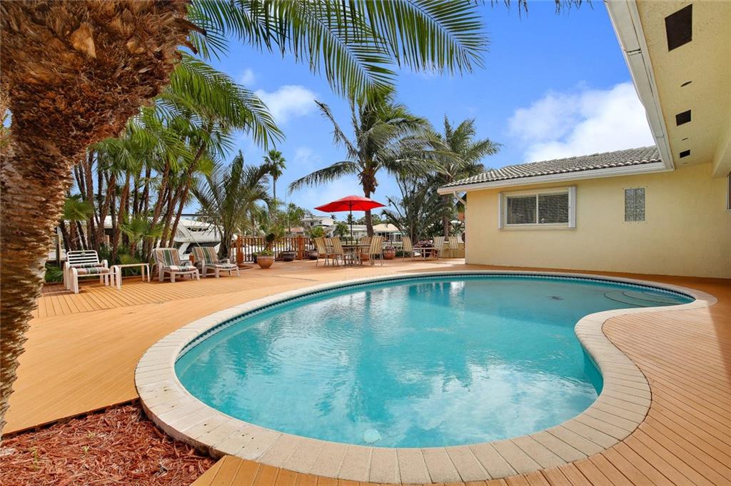 Beautiful formal entry welcomes you into this updated waterfront home on 80' of deep water. 3 bedrooms and 3 baths, including a master suite. Open floor plan, gourmet kitchen, stainless appliances, maple cabinets, island, gas stove and granite counters. Large living room with built-in cabinets and spacious dining area. The backyard is designed with entertaining in mind. Sparkling pool, private dock and no fixed bridges. Newer A/C, hurricane protection, circular driveway and garage. Close to the beach.