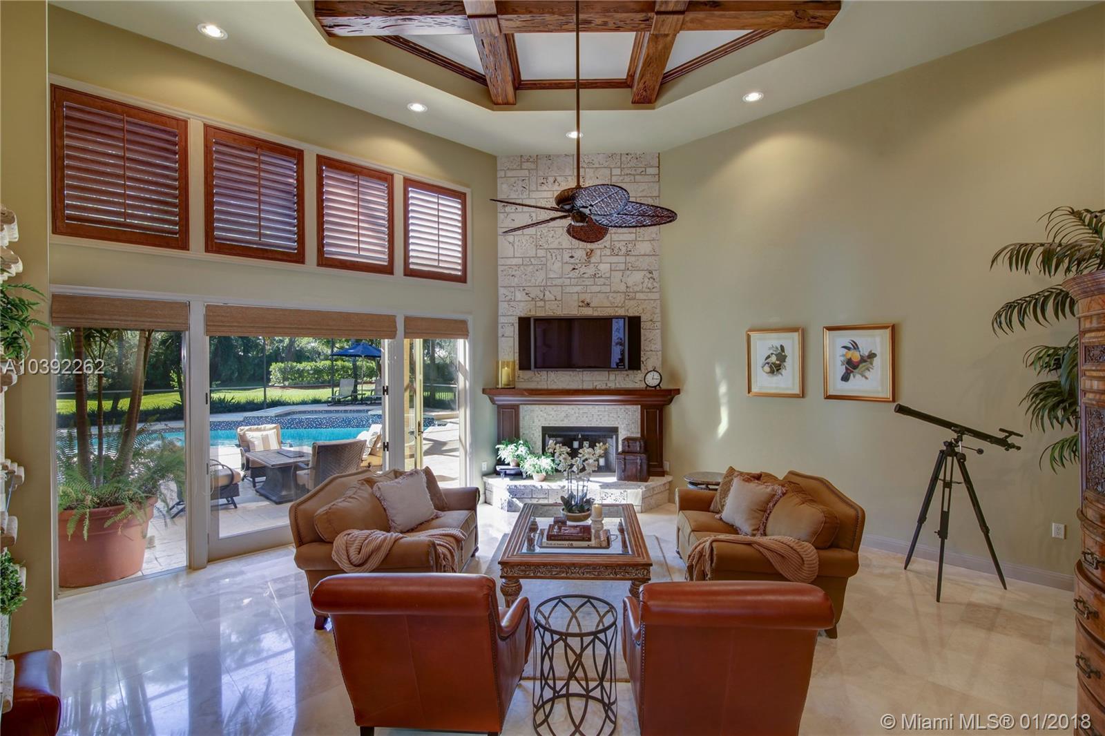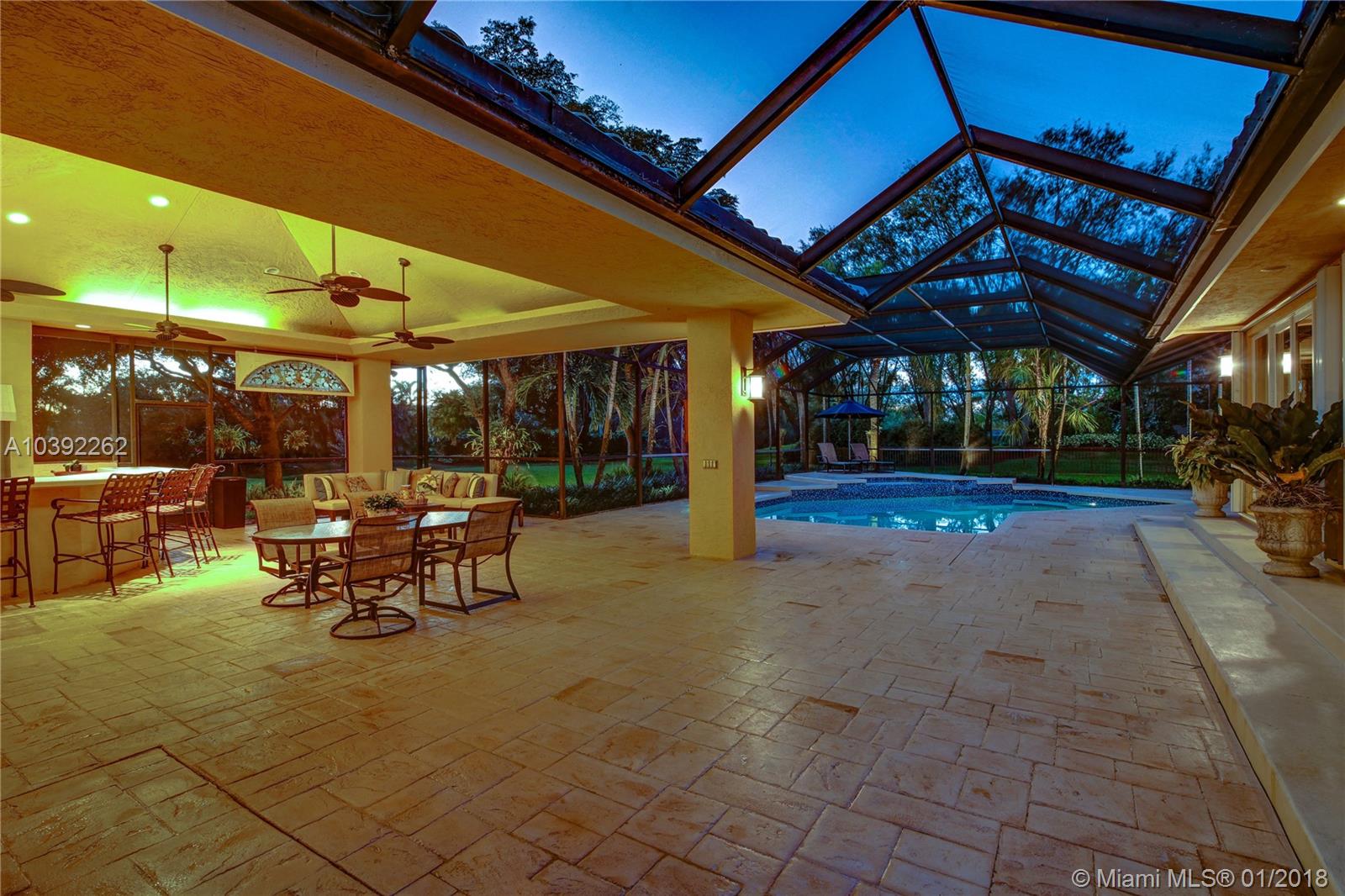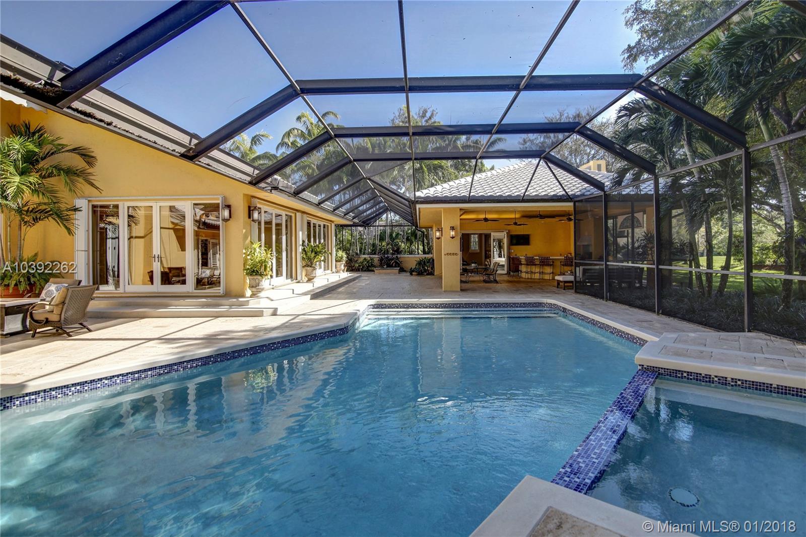 Luxury custom built home set back on a quaint cul de sac street. Enter this sprawling ranch via your circular drive with lush mature landscaping. Grand wood door welcomes you to this special entertainers delight home. Total Renovation in 2005. Enjoy gleaming marble floors with wood in all bedrooms. Step into your formal living room complete with fireplace, beamed ceiling and french doors to back yard oasis. Gourmet kitchen with oversized 10x5 center island, soaring ceilings, double ovens with sunny breakfast nook with windows overlooking pool. Custom office with tasteful built ins. Screened heated pool/spa with expansive deck including full summer kitchen, fountains, electric awning,lush tropical landscaping with lighting and Spacious guest house with full bath.