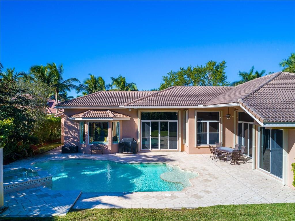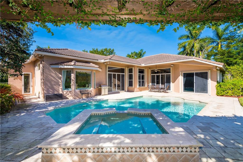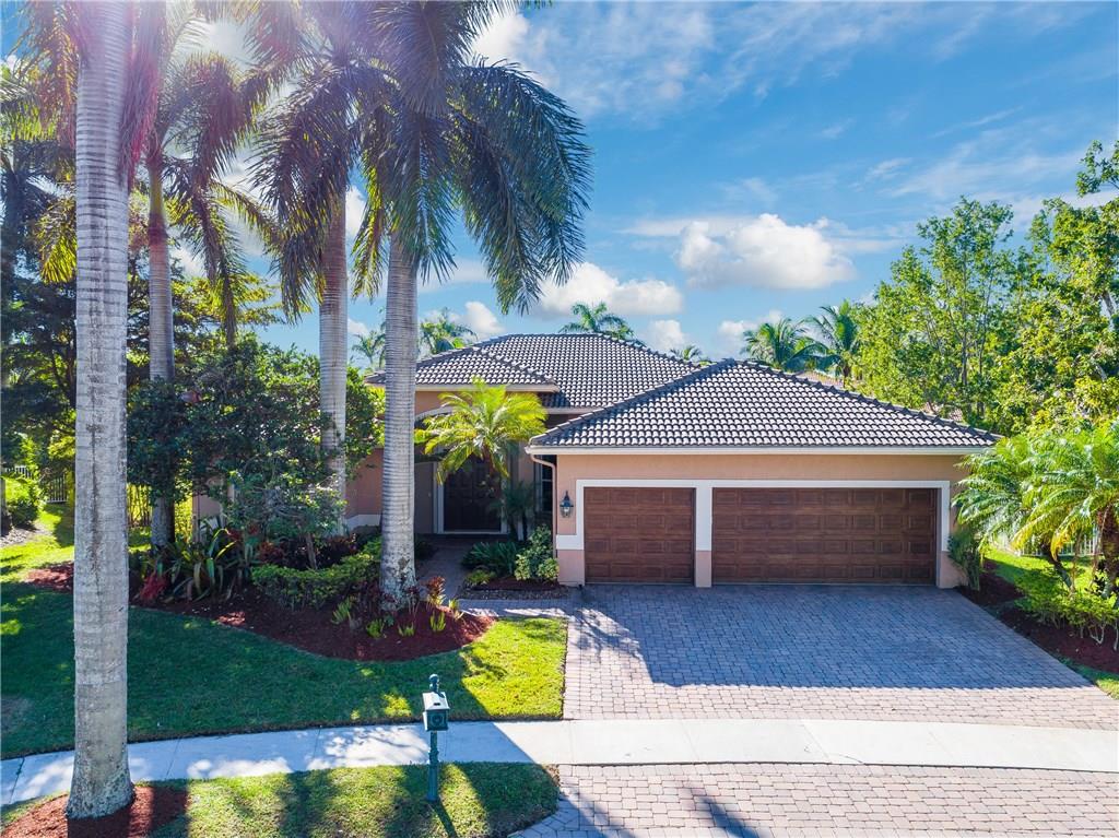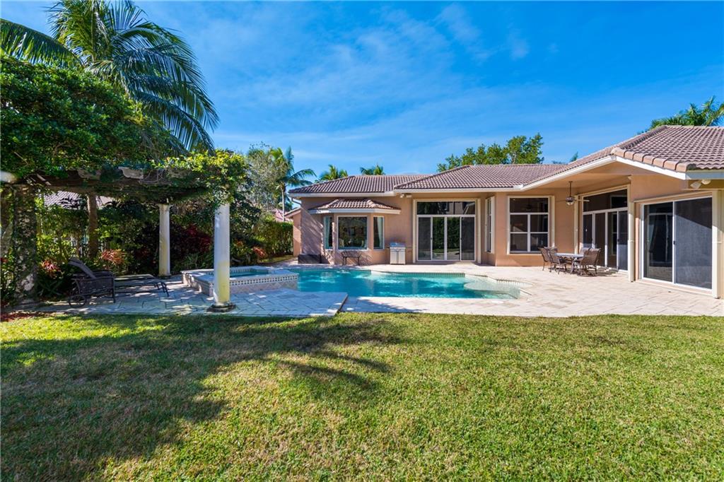 Gorgeous 1-story home in Weston Hills! 5BR/4BA/3-car garage PLUS kids wing is the perfect family home. A wonderful 760SF addition incorporates a bedroom, full cabana bath and recreation/study area. Exudes pride of ownership with newer ACs, pool heater, stainless steel GE Monogram appliances and accordion shutters/impact glass. Outside is equally as impressive with a gorgeous pool/spa, stunning pergola with colorful foliage and a large yard, completely fenced/hedged for privacy. Show and sell.