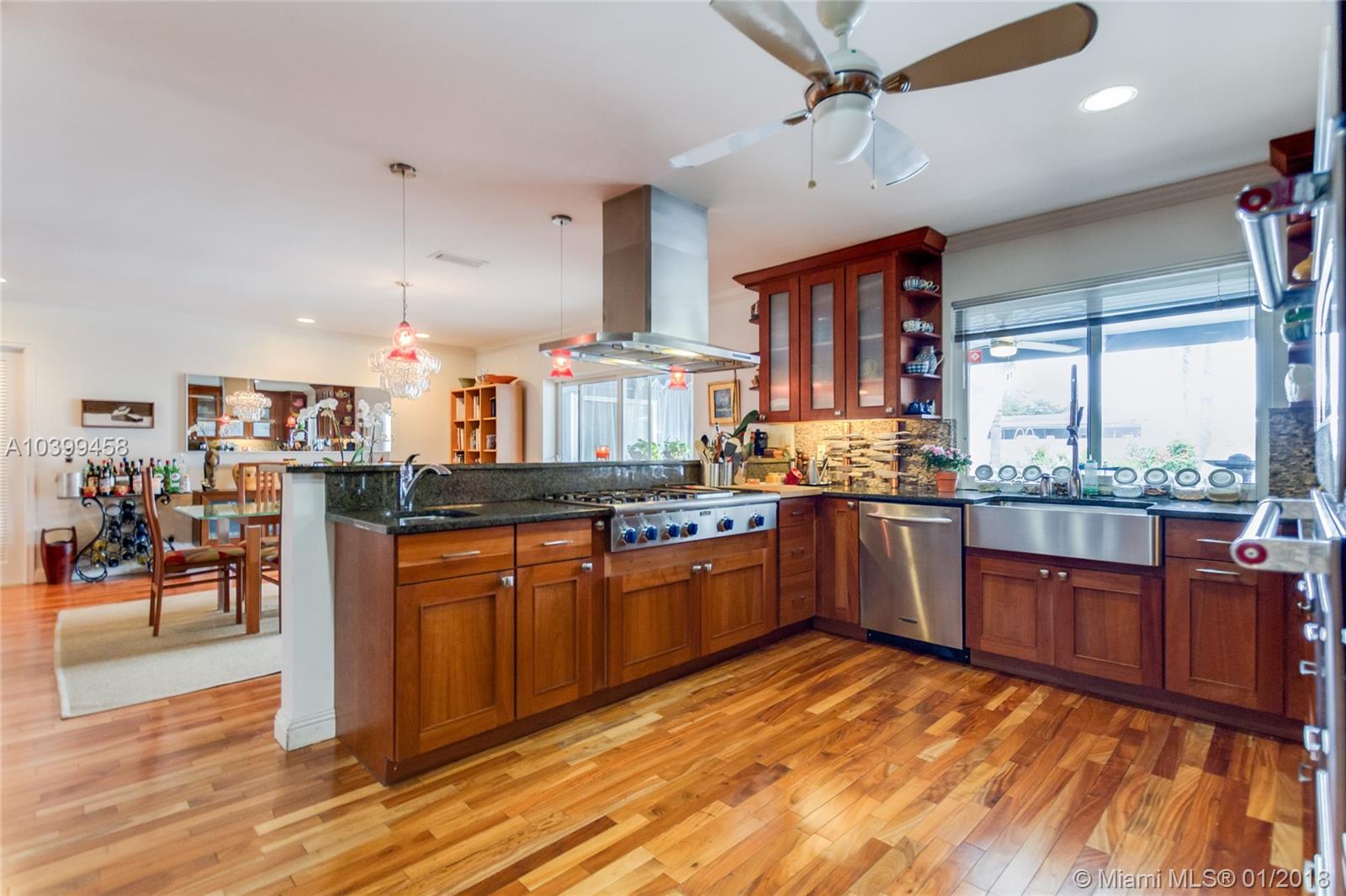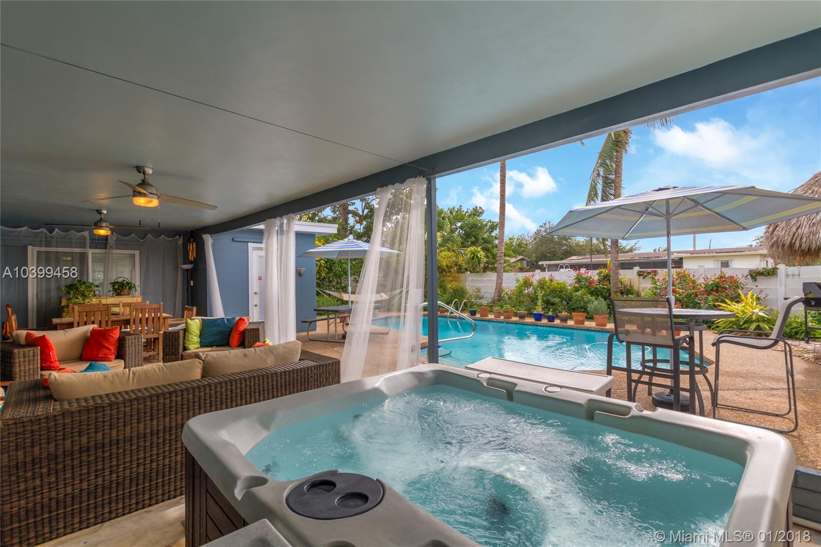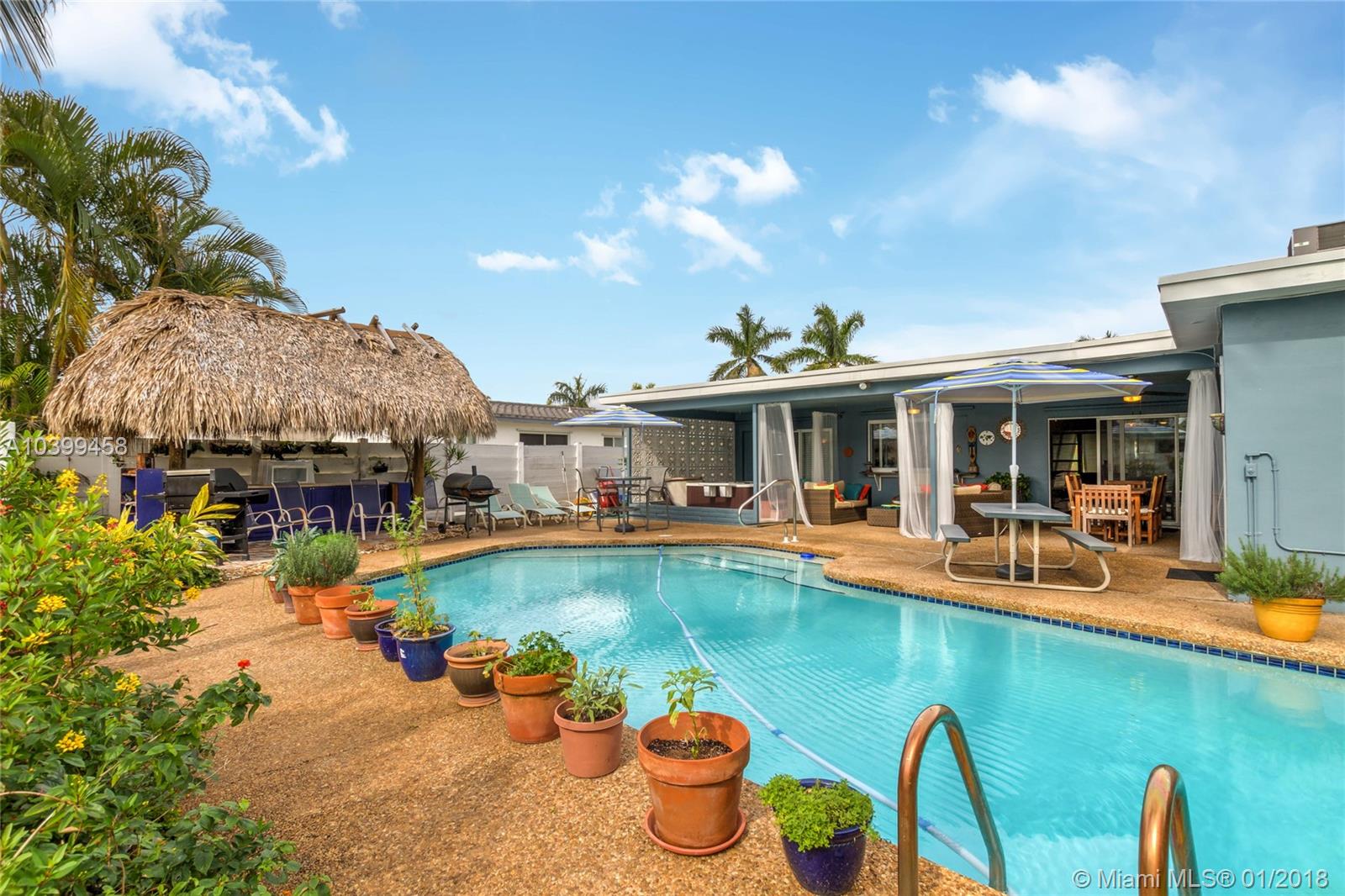 Luxurious Hollywood Hills Gem! This home boasts 3 bedrooms and 2 bathrooms with a den that can be a 4th bedroom. Come entertain guests or relax in this impressive backyard - a lush tropical oasis with a large covered patio, refreshing pool with surrounding deck, hot tub, and tiki bar/hut. The home has stunning real cherry hardwood floors that shine from the natural light throughout the house, a beautiful kitchen architecturally designed for a chef with an abundance of cabinet space, high end appliances all under warranty except stove, new washer, impact windows and doors throughout, new energy efficient A/C, new energy efficient tankless water heater, new roof under warranty was installed 1 year ago, fully remodeled bathrooms, 2 car garage, and xfinity home security with interior camera.