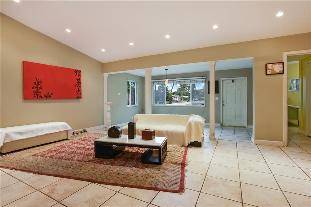 Middle River Manor home with 3-bed, 2-bath pool & carport semi-updated. Large wide open space for kitchen, dining & living room with vaulted ceilings in every room. Kitchen with gas range cooking island, granite, stainless, cherry wood cabinetry, newer appliances. Tile floors throughout. Separate laundry utility room. AC nearly new. Backyard fenced with mature landscaping, covered patio and pool. Pool needs decking to be done. Conveniently located between Wilton Manors & Fort Lauderdale Beach & Downtown.