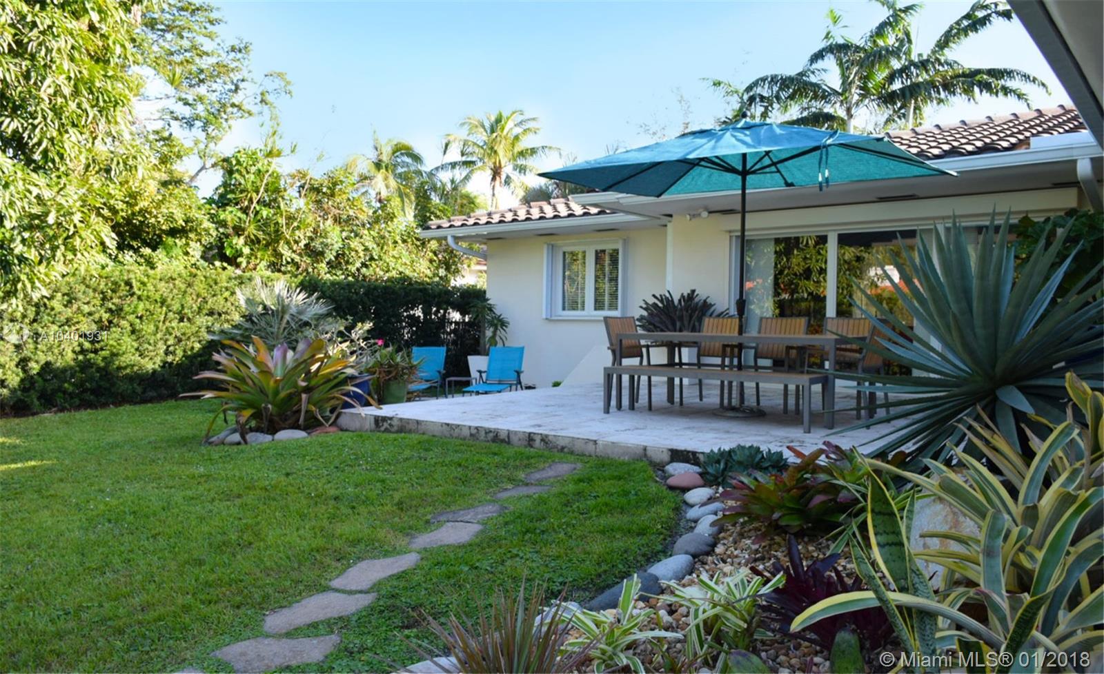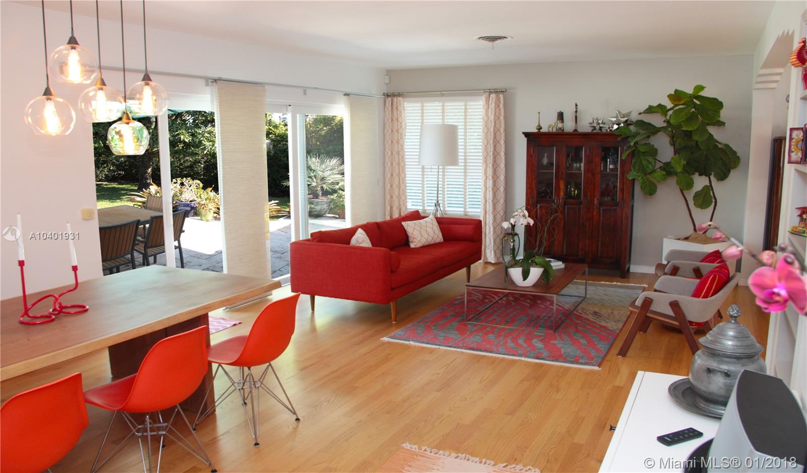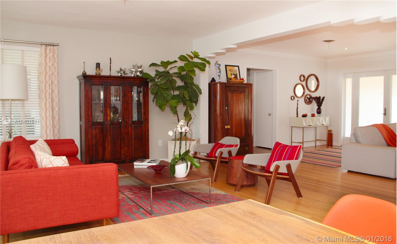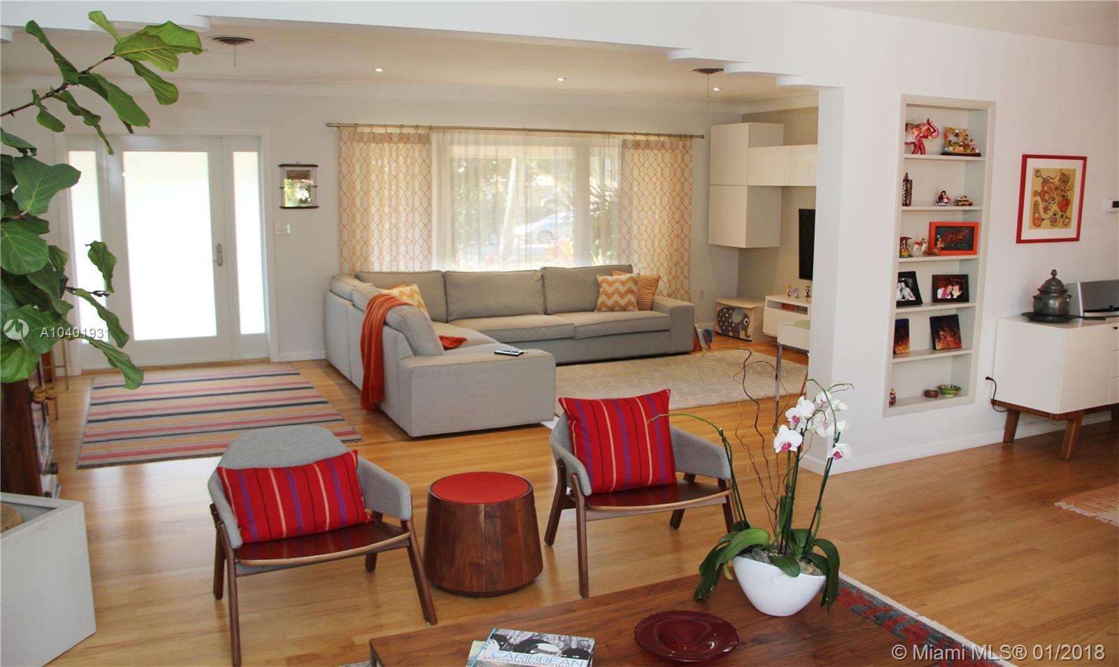 Impeccable 3/2 mid-century modern style home on a quiet street, walking distance from the neighborhood shops in downtown Miami Shores. New impact windows & doors and accordion shutters all throughout, including hurricane proof garage door. Great lay-out with refinished hardwood floors, double living space area to arrange dining room, family room and formal living room. All bedrooms are large and have very generous storage space. Large sliding door that opens to a large finished patio and a professionally landscaped back yard, making this house great for entertaining and enjoying the Miami weather. Great curb appeal with beautiful landscaping in the front and convenient access to a 2-car garage through the back alley with an electric gate. Brand new garage roof, newer tile roof and A/C.