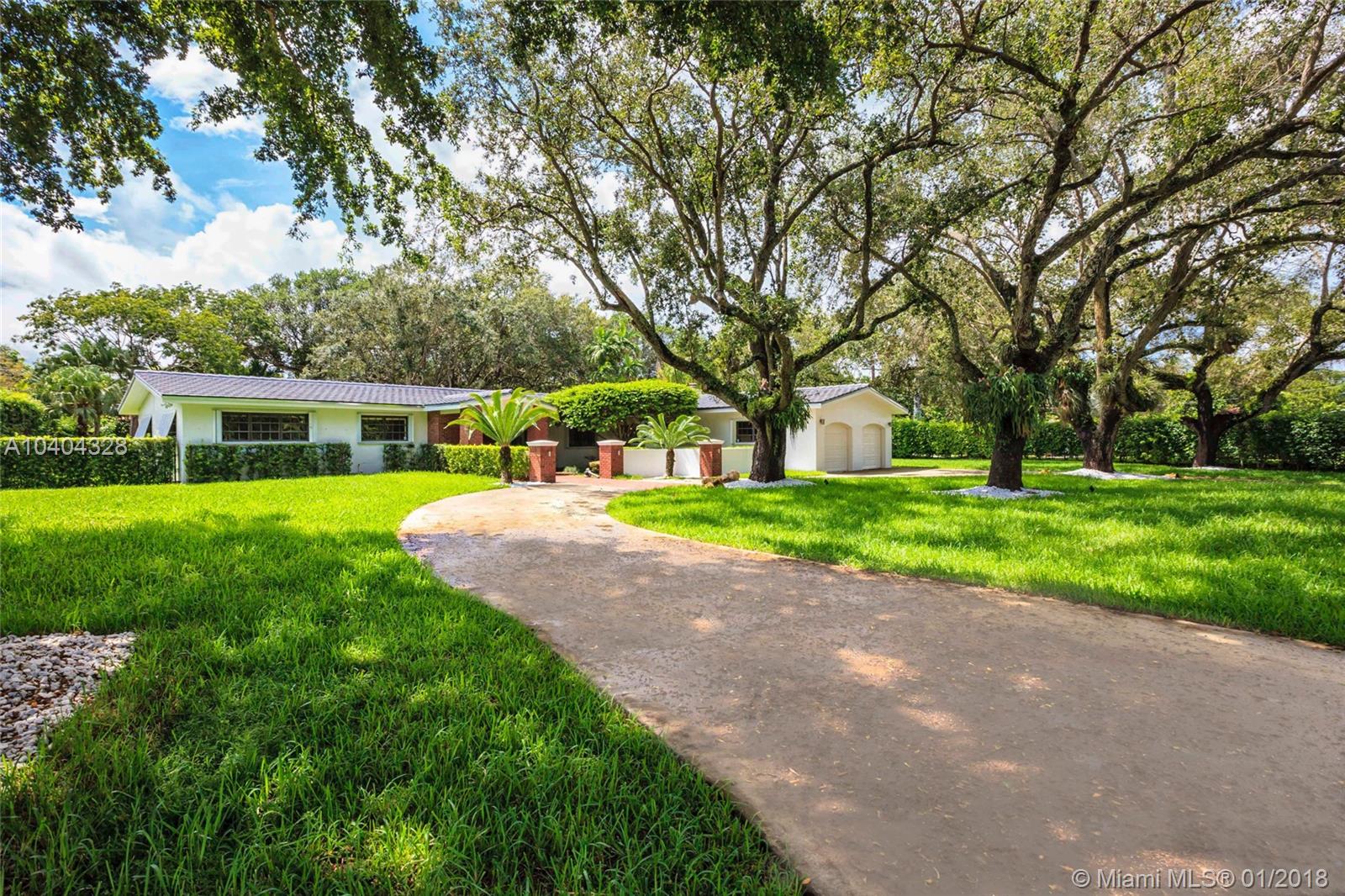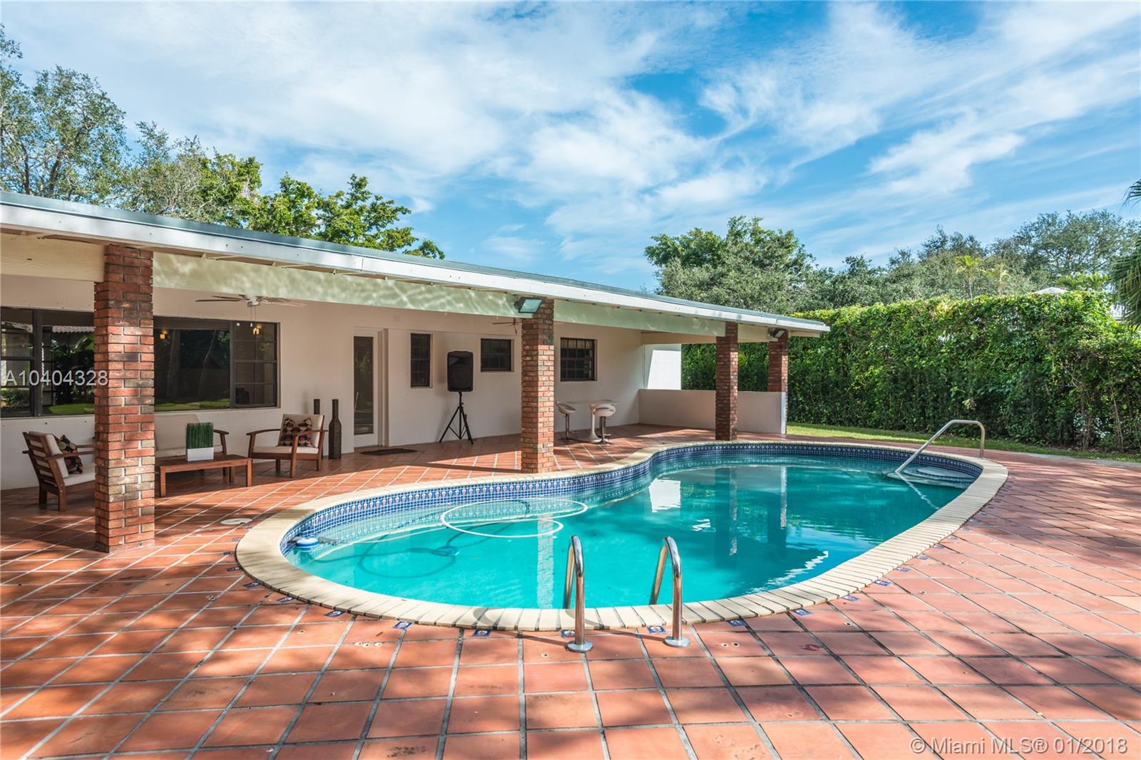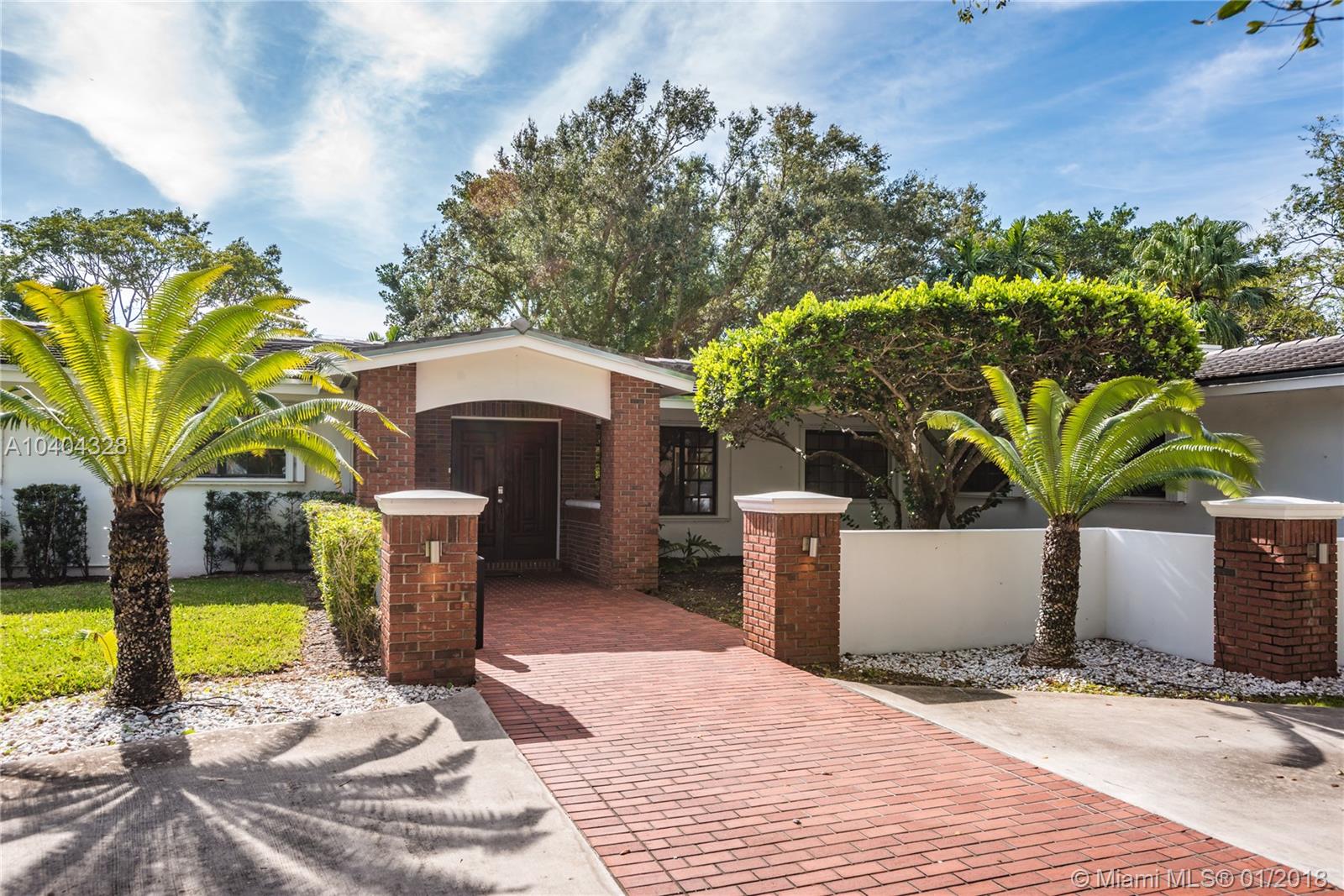 This Pinecrest ranch-style gem with a more modern interior twist has a comfortable floor plan. Foyer entry, open concept living and dining, spacious entertainment room with a wood-burning fireplace, 4 bedrooms, 3.5 baths (including a 2nd ensuite on opposite side), plus a separate multi-purpose room. Beautiful white kitchen with quality stainless steel appliances and breakfast area has direct access to a covered terrace, the sunny pool and large backyard. Porcelain floors; wood in bedrooms, laundry room, 2-car garage and ample driveway areas. Roof is 3 years new. Huge 31,363 sf corner lot with mature trees; all dimensions per County records. A desirable Pinecrest location, combined with sought-after public and private schools, make this property a fabulous option. Come see!