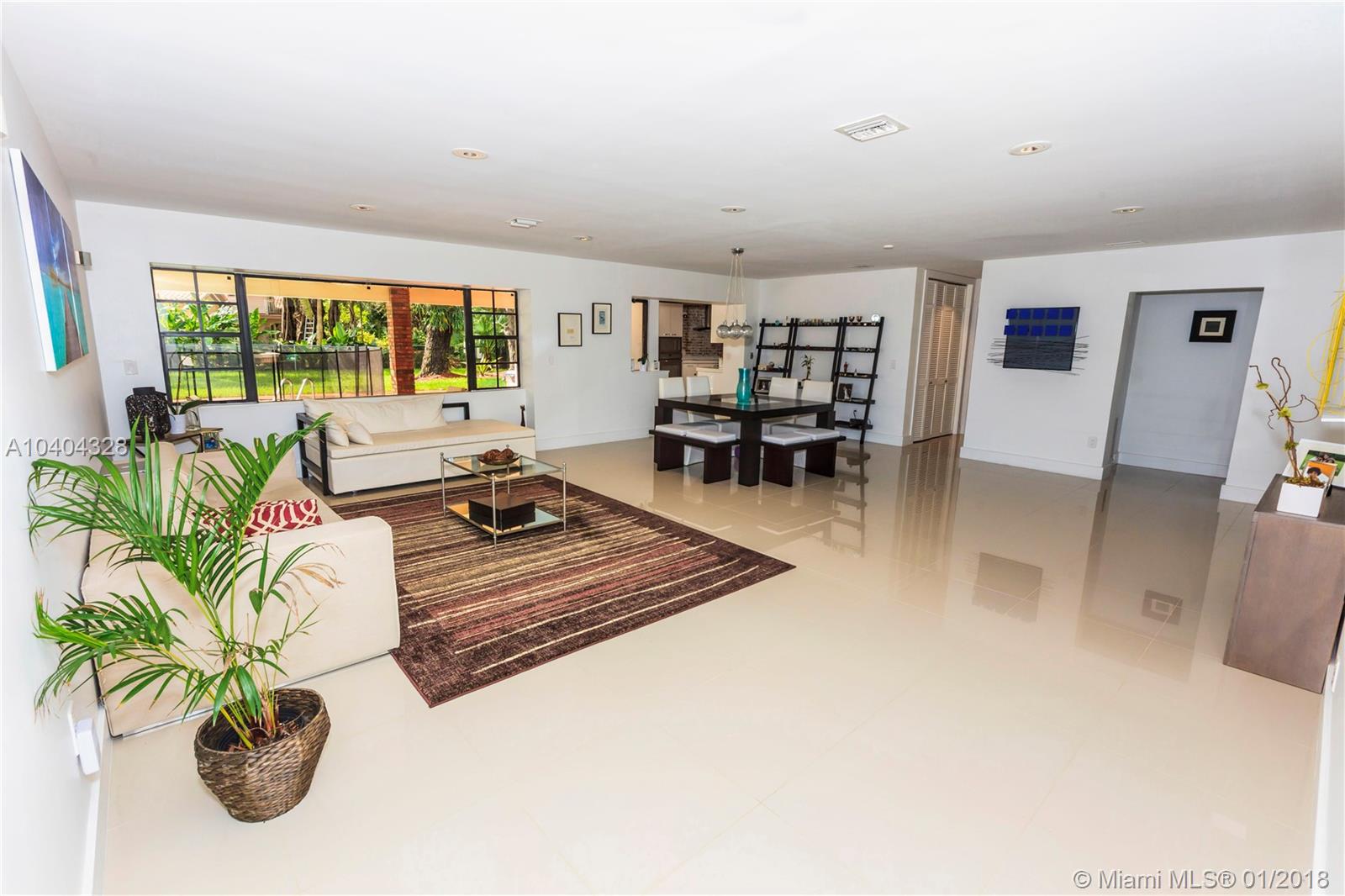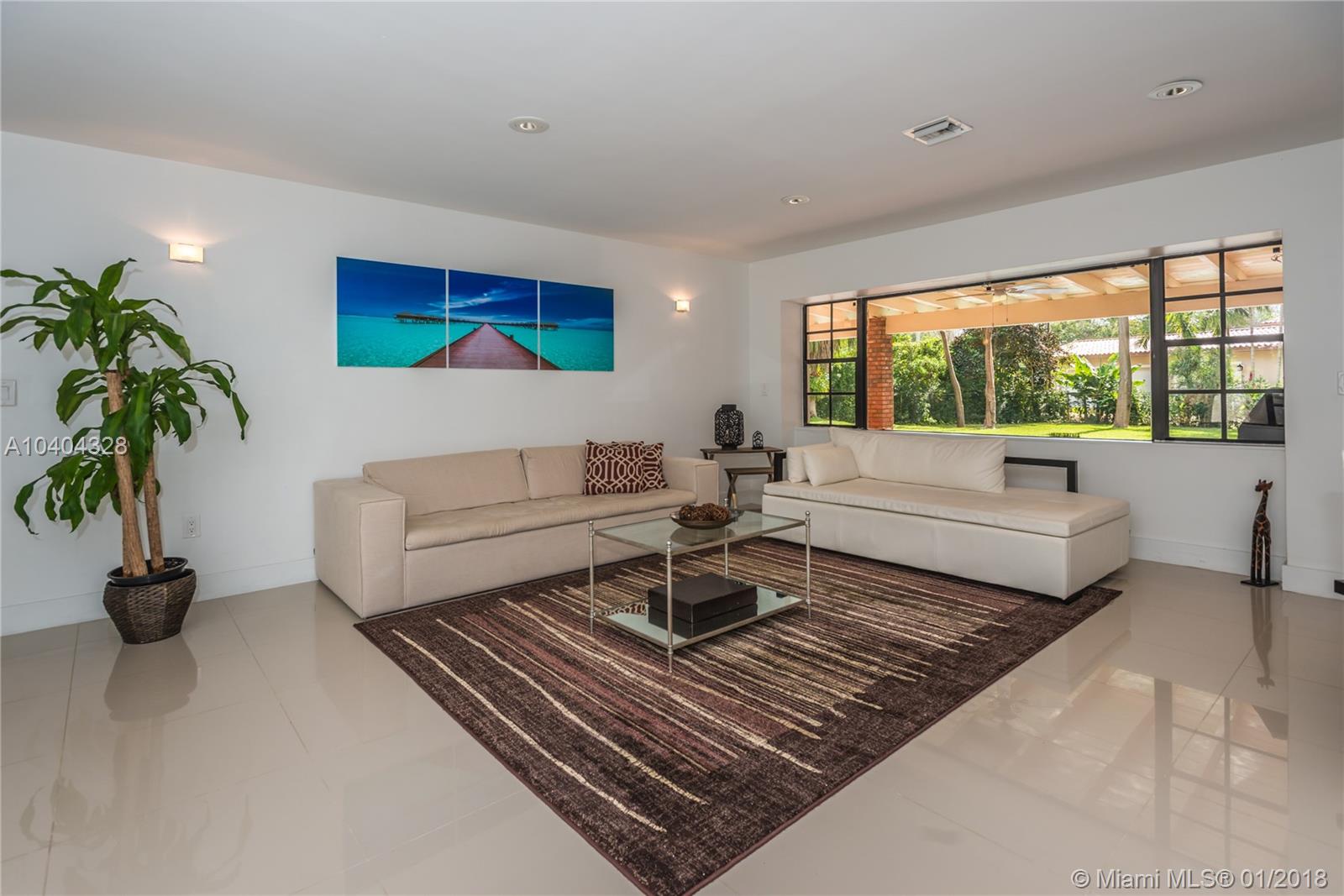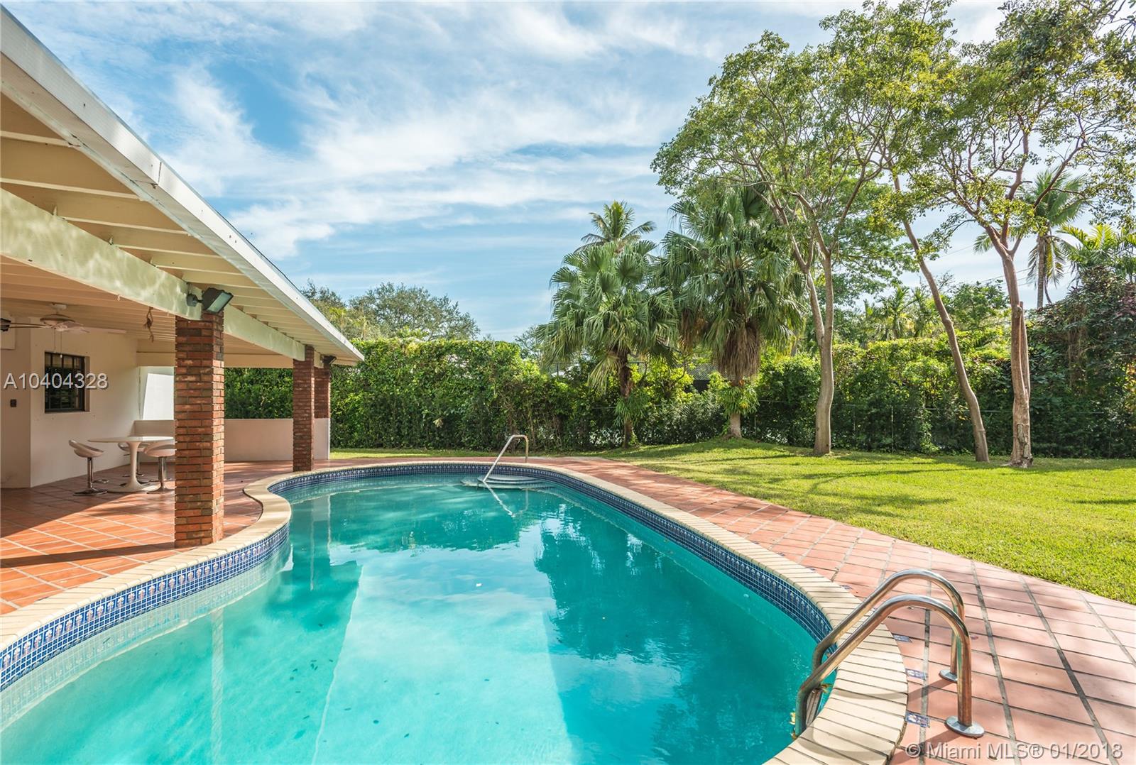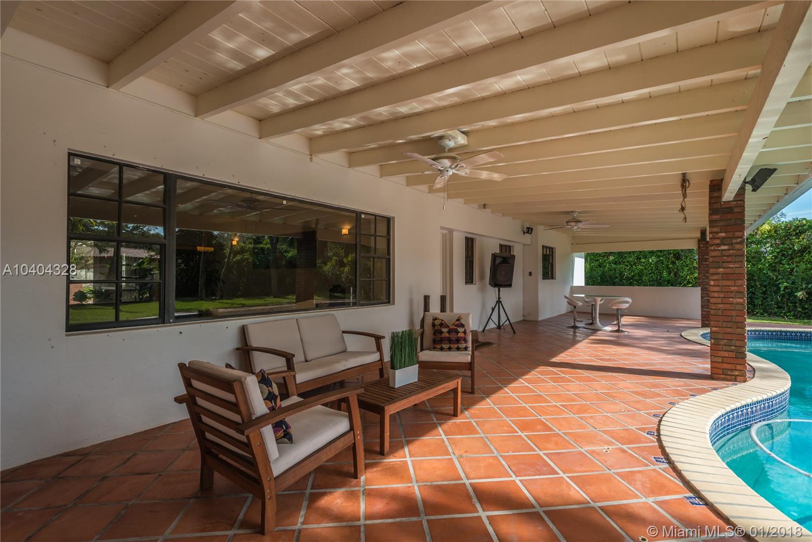 This Pinecrest ranch-style gem with a more modern interior twist has a comfortable floor plan. Foyer entry, open concept living and dining, spacious entertainment room with a wood-burning fireplace, 4 bedrooms, 3.5 baths (including a 2nd ensuite on opposite side), plus a separate multi-purpose room. Beautiful white kitchen with quality stainless steel appliances and breakfast area has direct access to a covered terrace, the sunny pool and large backyard. Porcelain floors; wood in bedrooms, laundry room, 2-car garage and ample driveway areas. Roof is 3 years new. Huge 31,363 sf corner lot with mature trees; all dimensions per County records. A desirable Pinecrest location, combined with sought-after public and private schools, make this property a fabulous option. Come see!