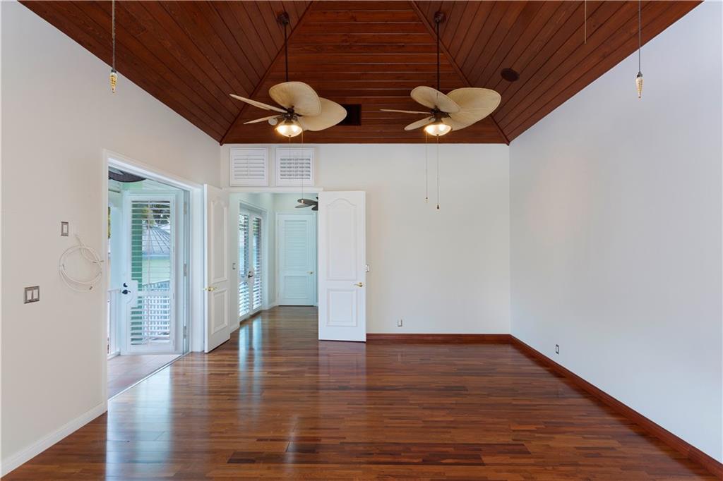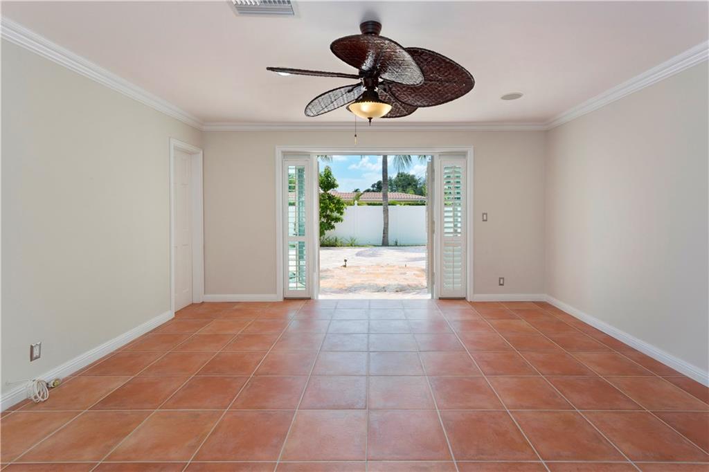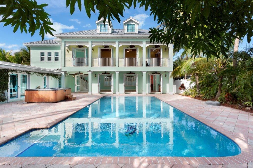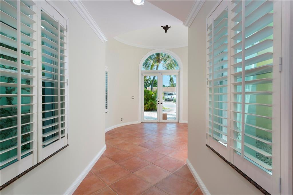 Sprawling across a corner double lot, this Key West-inspired residence is designed for indoor/outdoor living in the privacy of lush landscaping and fencing that stretches around three sides of the property. On the southeast grounds, the resort-style pool courtyard includes a separate spa on the lounge terrace. Pavered courtyard spaces also wrap around the north and west sides of the property which is served by a sweeping drive to the turret-style entry.