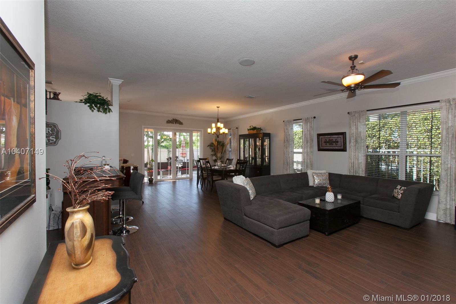 Come and fall in Love with this beauty!! 3 bed/2.5 ba Turn key home with an open concept floor plan. Main areas have new wood look porcelain flooring, a new accent wall in living room, new knockdown ceiling throughout, all 3 baths nicely redone with seamless glass enclosures. Property was just painted inside and out and boasts: stainless steel appliances including a brand new e-range, tiled countertop and backsplash in kitchen, front load washer and dryer, new tankless water heater, A/C with nest wifi thermostat. Also, french doors, accordion shutters, upgraded alarm system and surround sound in living room. Come and enjoy the gorgeous back yard perfect for entertaining with covered patio, BBQ gazebo , pool with newer pump and upgraded landscaping. Good school system. Gated community.