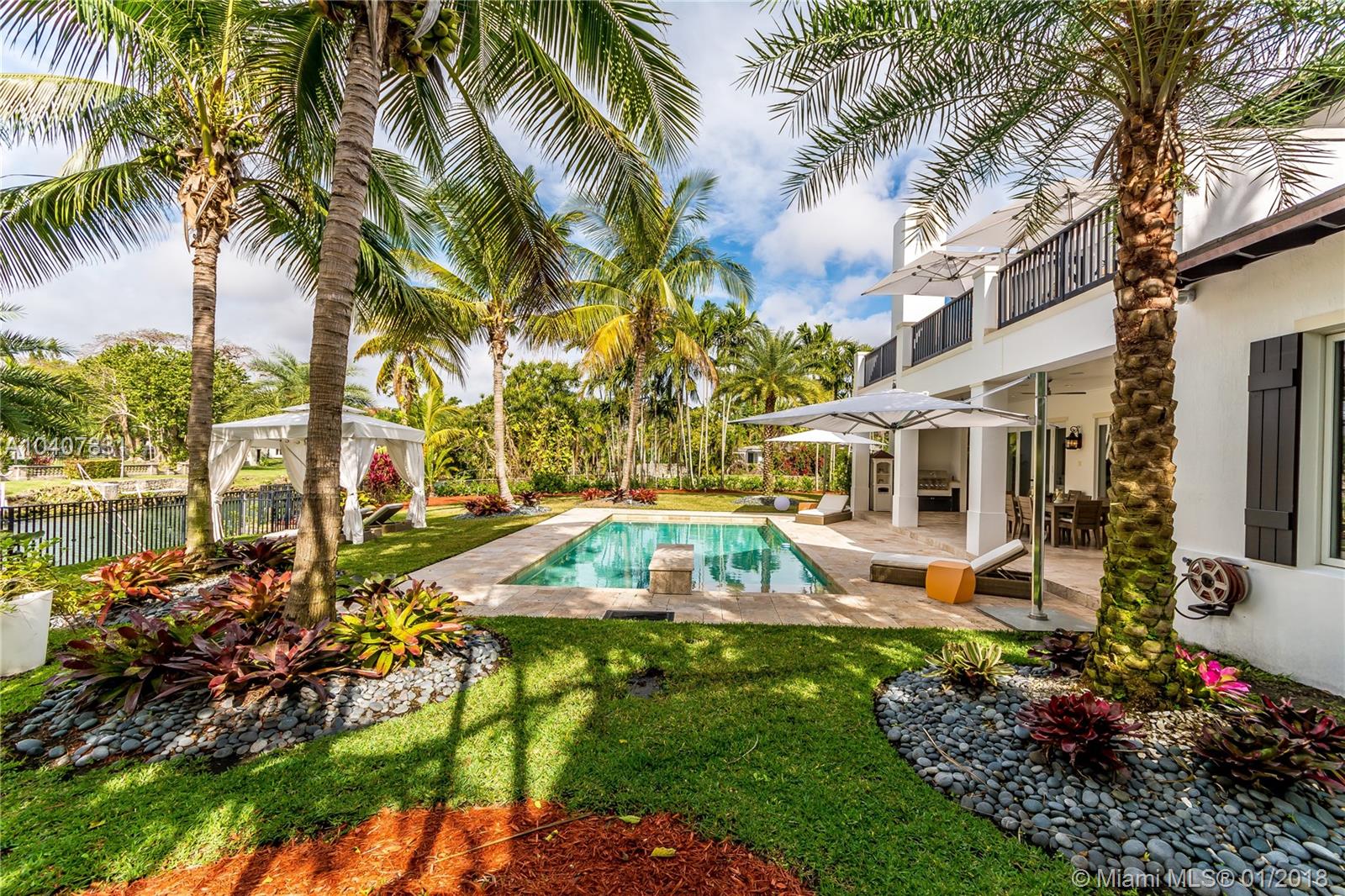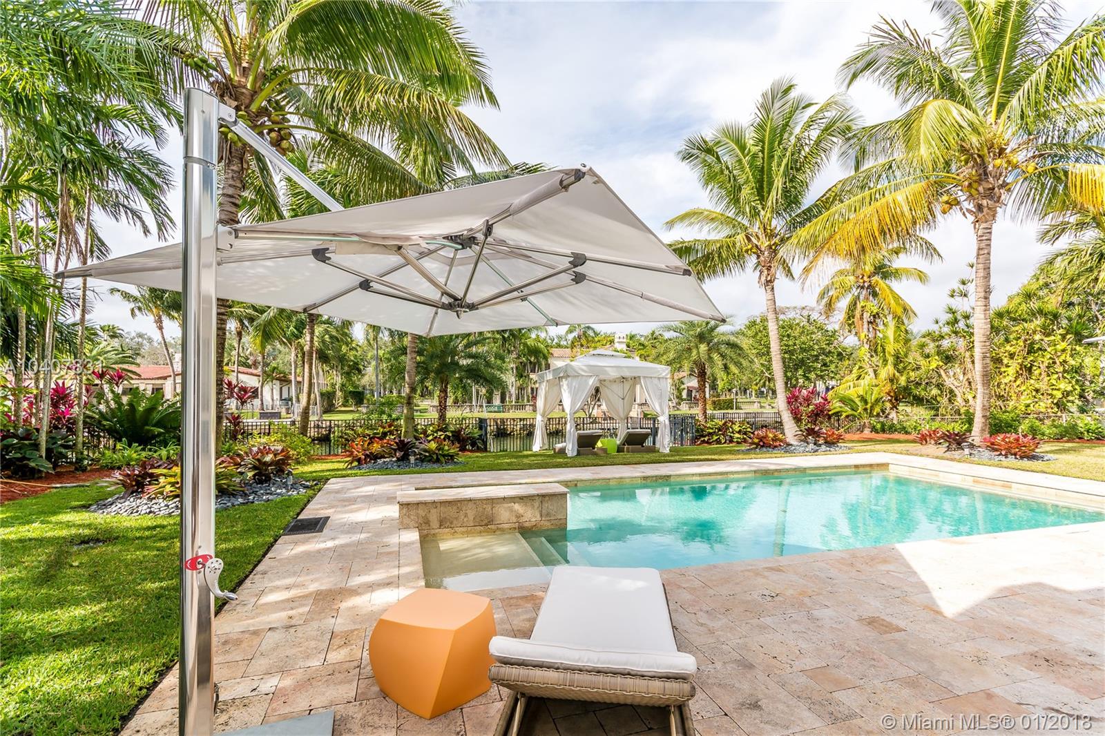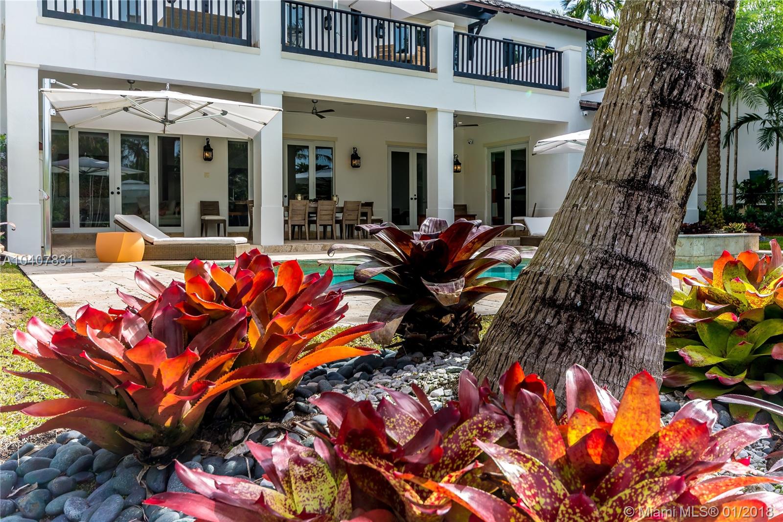 Spacious, gated, contemporary Island–style villa nestled in the heart of Coral Gables, on the Gables Waterway with ocean access. Abundant natural light, expansive verandas and terraces, gorgeous water views from the large entertaining kitchen, which itself boasts a single-slab marble wall. Completely renovated and updated with 6 bedrooms, 7.5 bathrooms (all bathrooms are en suite), 3-car garage, Chicago-brick driveway, impact windows and doors, security cameras and "smart home" features, wine cellar, and lighted tropical landscaping. Formal living and dining areas, plus family room open to the kitchen and facing the pool patio and waterway, all designed for gracious, elegant, yet relaxed tropical living